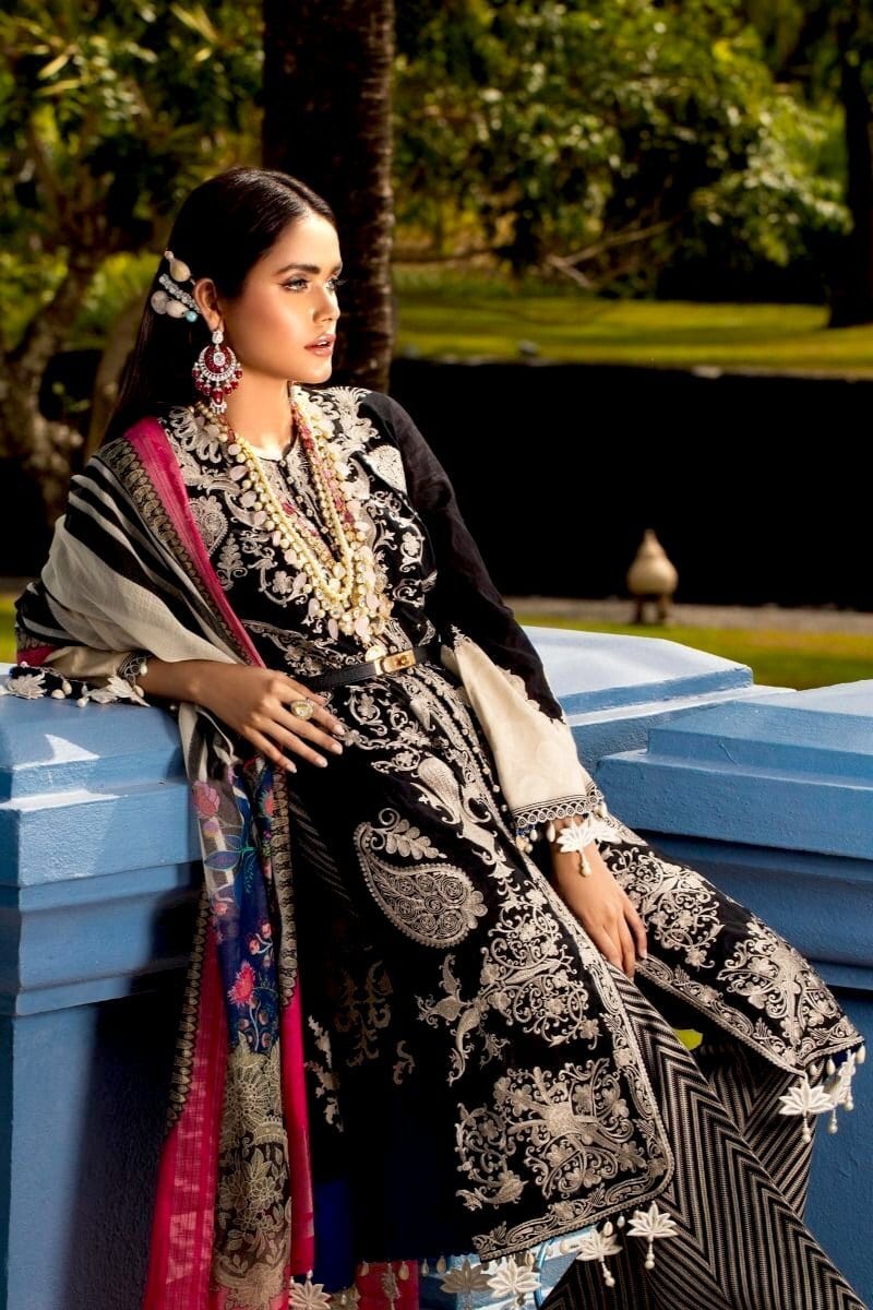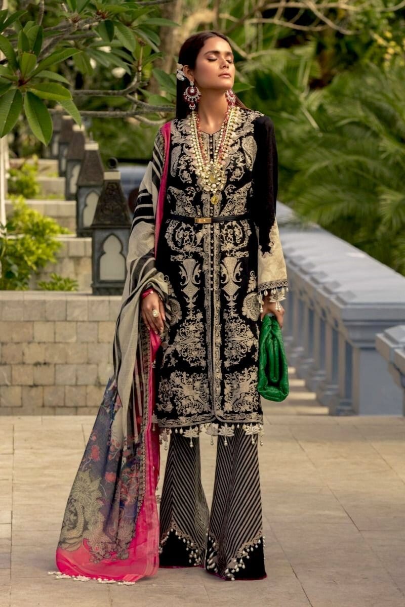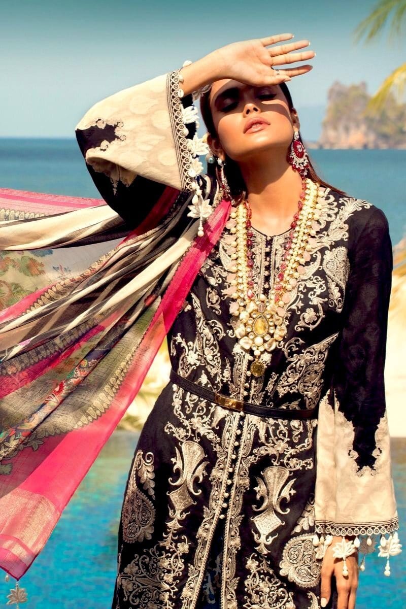 Fabric: A Roman embroidery inspired black and cream dobby shirt with set sleeves and a printed back. Paired with a digitally printed multicolored gauze dupatta with monochrome stripes in the center and monochrome chevron print pants. Embroidered Dobby Front - 1.25 meters Printed Dobby Back - 1.25 meters Printed Dobby Sleeves - 0.65 meter Digital Printed Khadi Dupatta - 2.5 meters Printed Trouser - 2.5 meters |