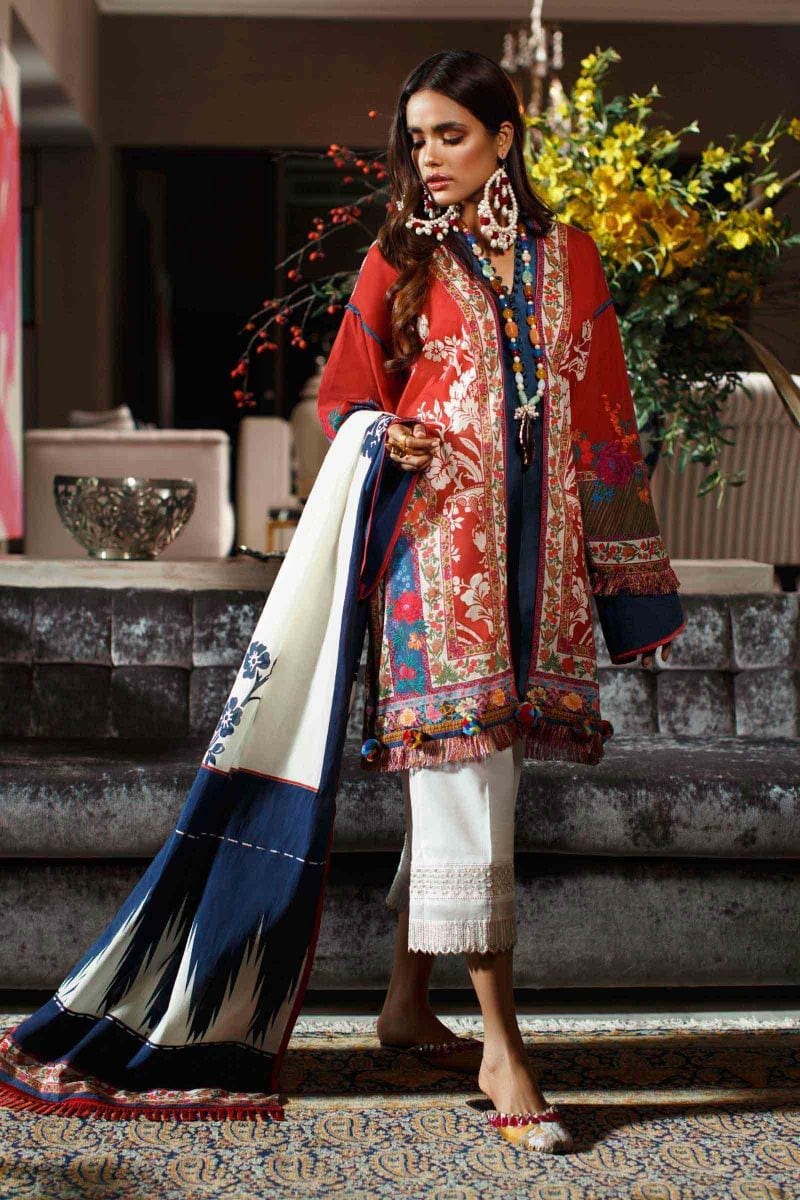 A scarlet red, azure, cream, Cerulean blue, red and green digitally printed Lawn shirt with a fusion of Turkish tile and bold stencil floral motifs. Paired with a navy blue and cream digitally printed Lawn dupatta with a mix of bold Ikat and floral motifs.