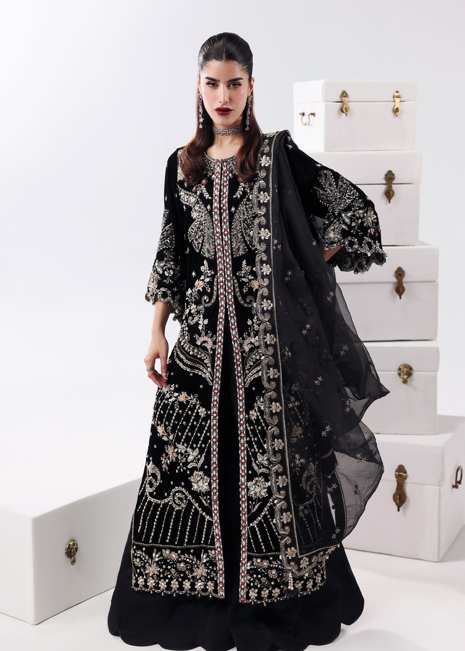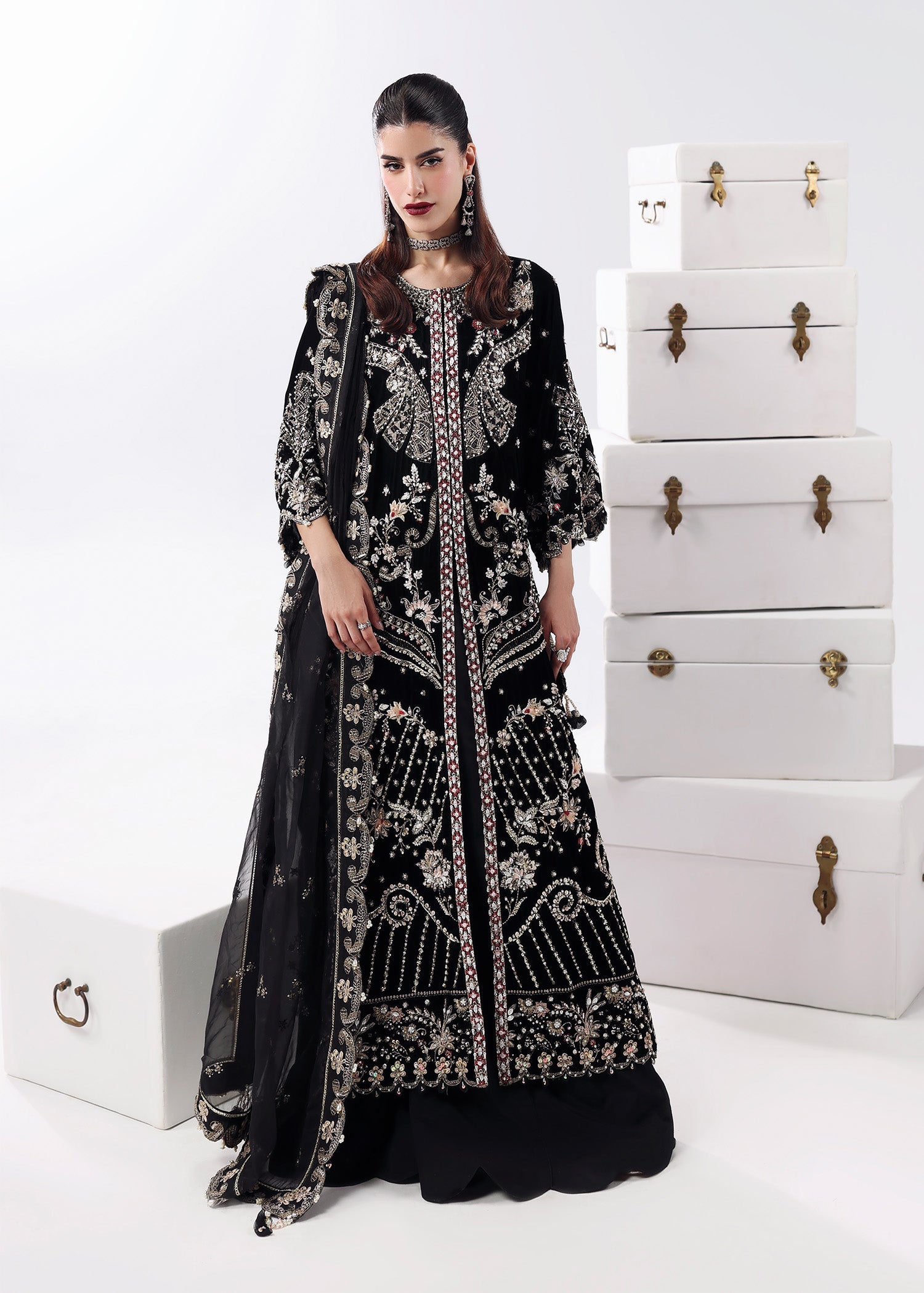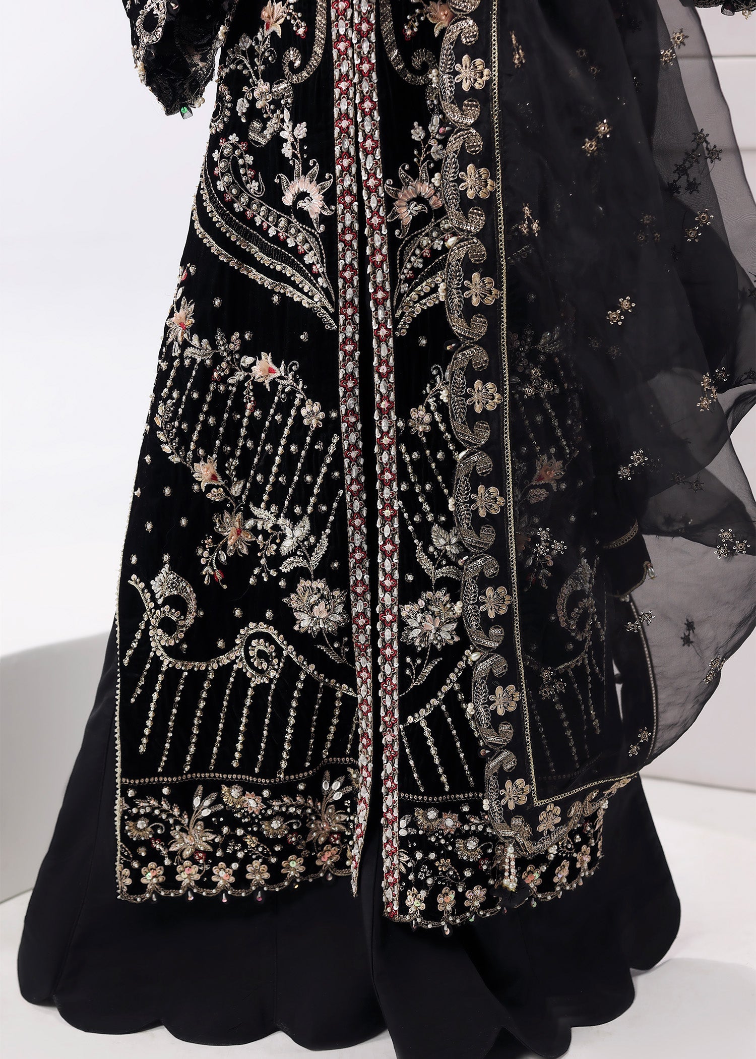 Summary: Embrace regal elegance with this black Pakistani suit from the Sardinia L'amore Luxury Formals collection. This stunning ethnic wear is crafted from rich, plush velvet, making it an ideal choice for the Fall/Winter season's grand events. The kameez features intricate handwork and embroidery across its front panels, sleeves, and borders, with delicate organza detailing on the neckline and hem. This formal wear masterpiece is designed for sophistication, making it a perfect outfit for wedding receptions, evening parties, or any grand festive celebration.
