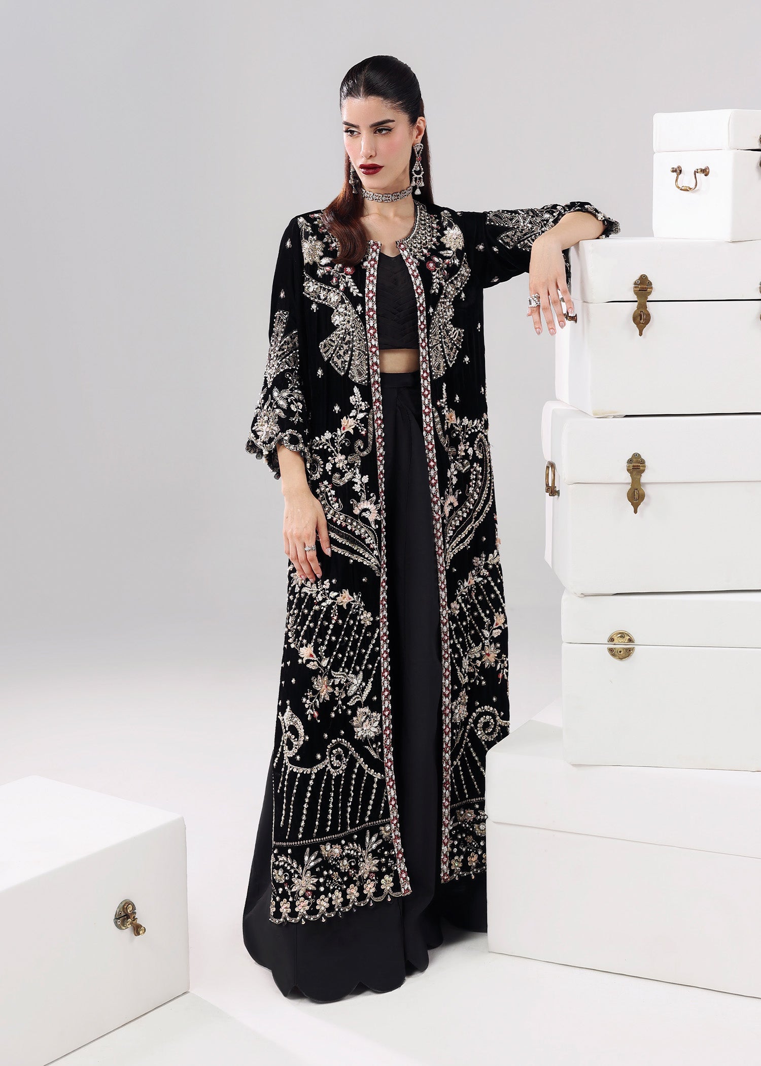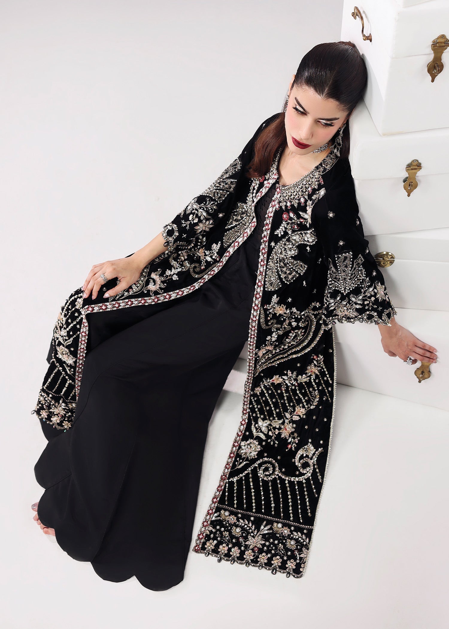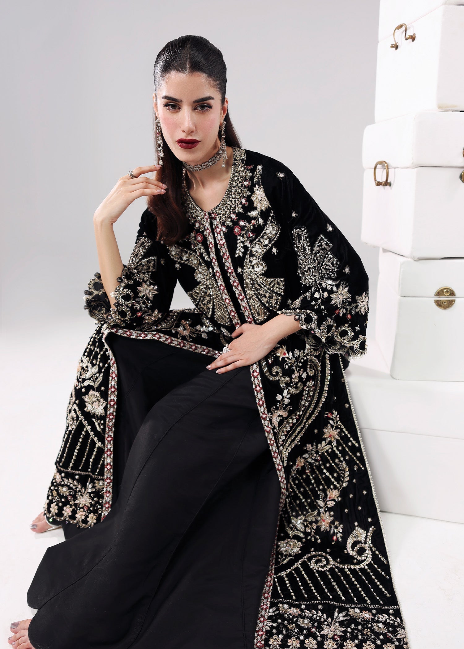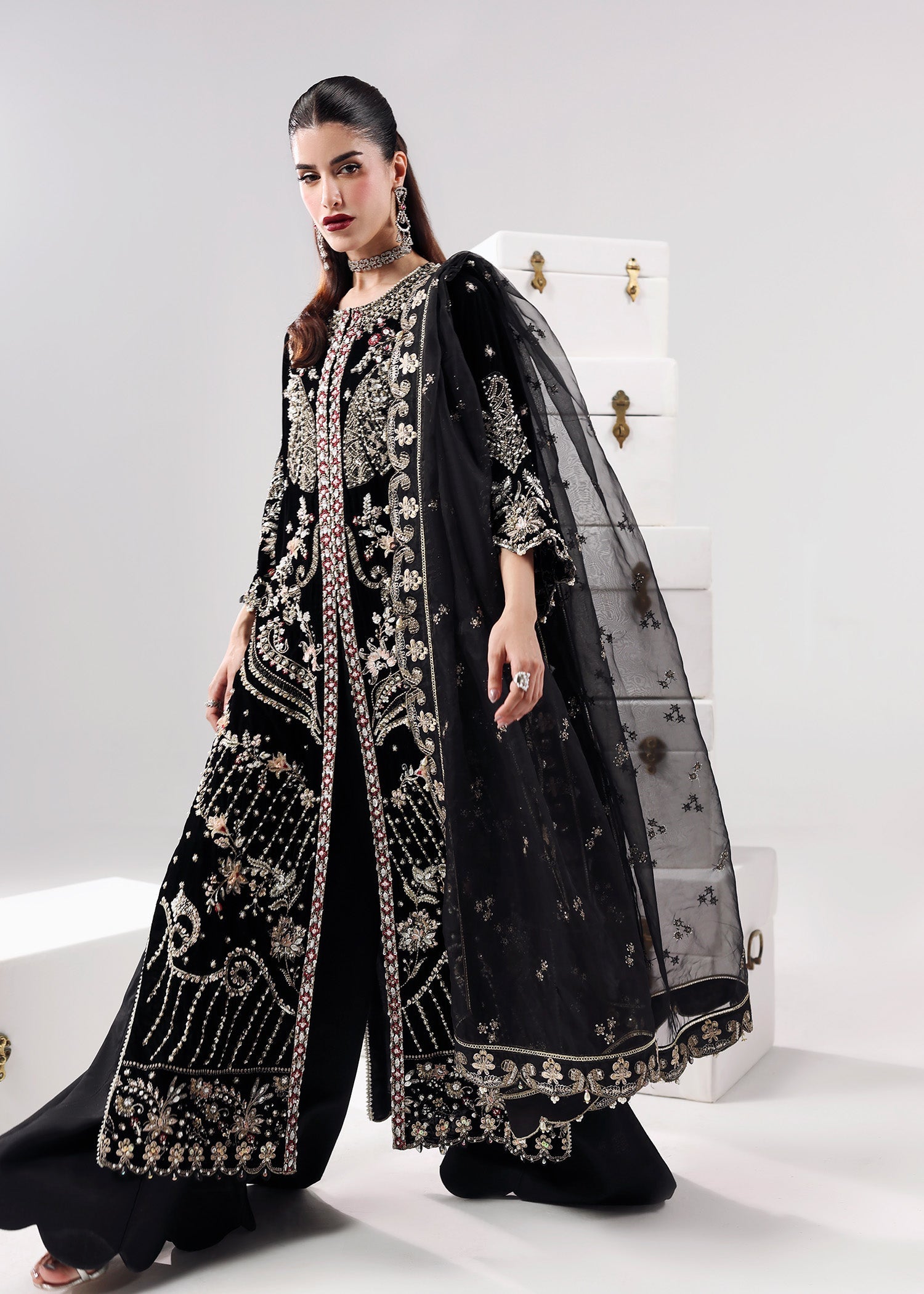 Summary: Embrace regal elegance with this black Pakistani suit from the Sardinia L'amore Luxury Formals collection. This stunning ethnic wear is crafted from rich, plush velvet, making it an ideal choice for the Fall/Winter season's grand events. The kameez features intricate handwork and embroidery across its front panels, sleeves, and borders, with delicate organza detailing on the neckline and hem. This formal wear masterpiece is designed for sophistication, making it a perfect outfit for wedding receptions, evening parties, or any grand festive celebration.