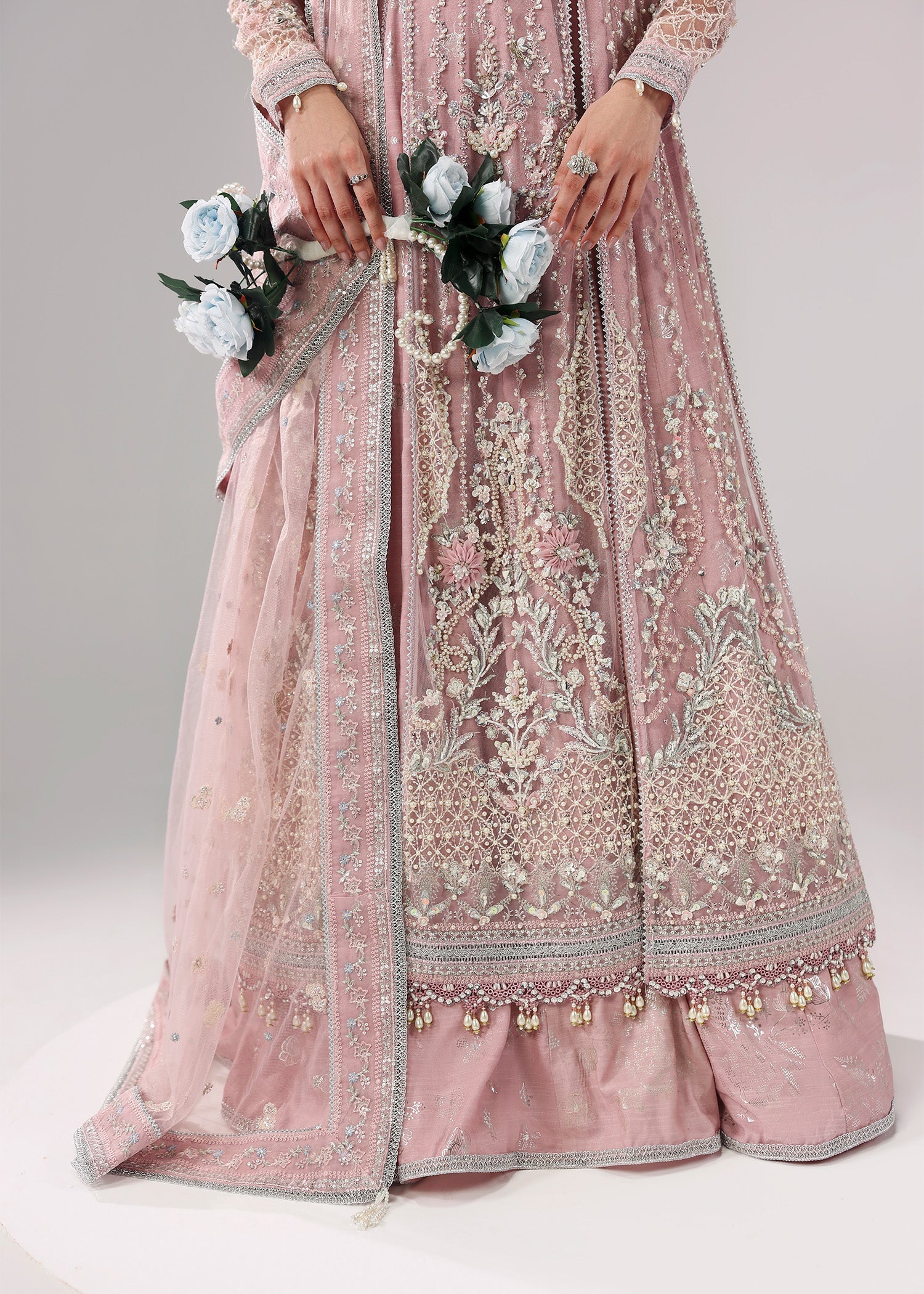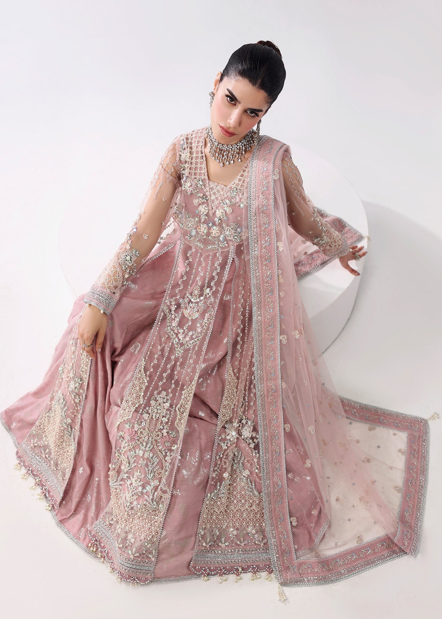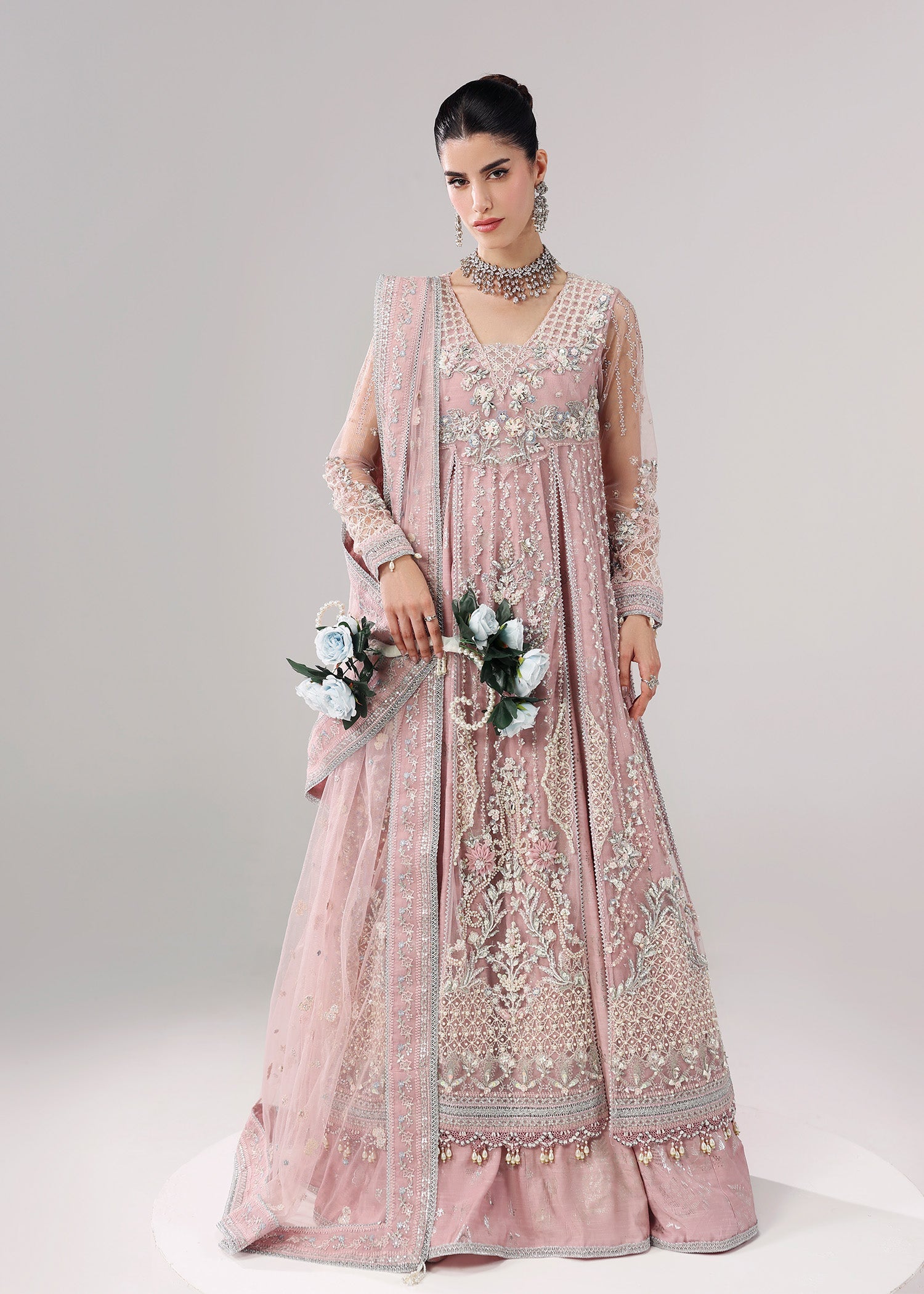 Summary: Embrace regal elegance with this exquisite lilac-pink Pakistani suit from the Sardinia L'amore Handwork Edit. This luxury formal dress is crafted from delicate embroidered net, making it a light and airy choice for spring/summer celebrations. The kameez features a heavily handworked and embroidered bodice, flowing front panels, and embellished sleeves, creating a breathtaking silhouette. This stunning ethnic wear piece is perfect for grand occasions like weddings, Nikah ceremonies, or Eid festivities. Shop this masterpiece of craftsmanship to add a touch of timeless grace to your formal wardrobe.