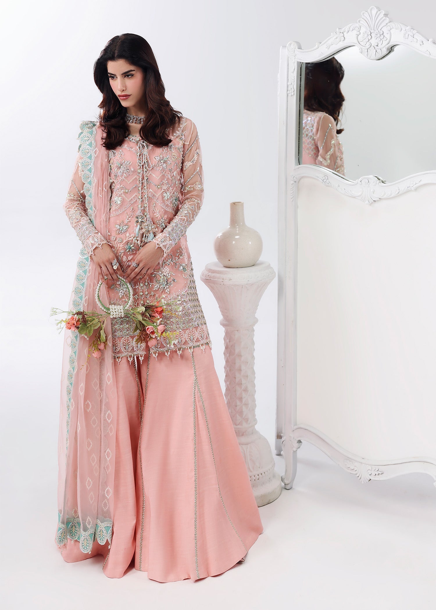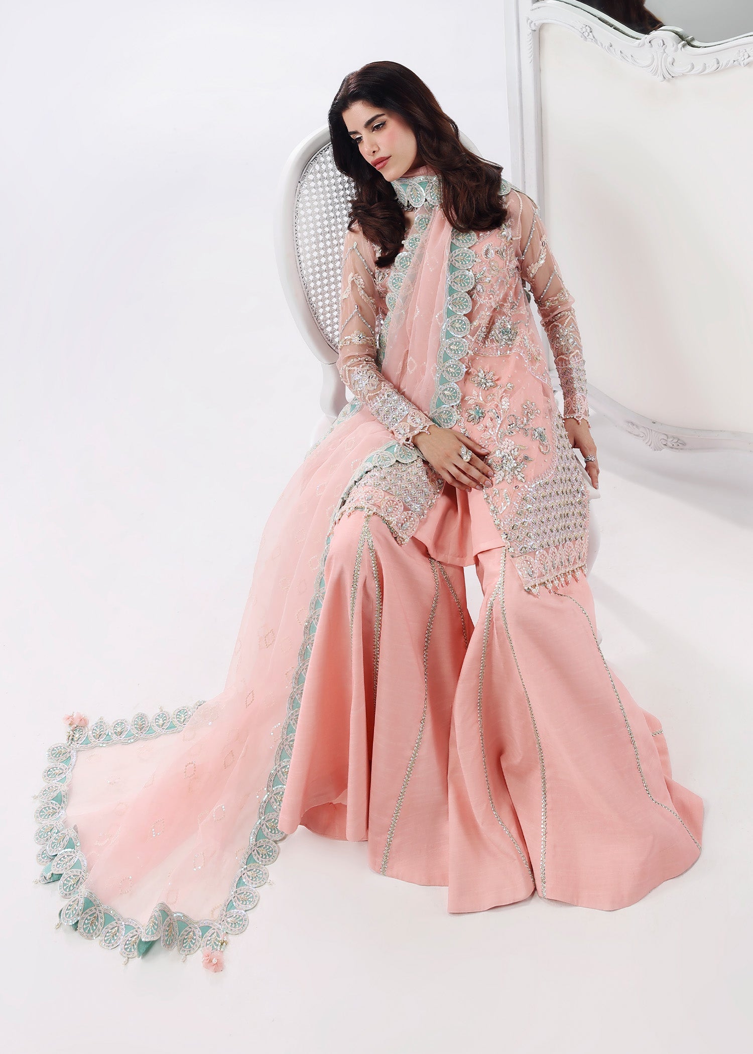 Fabric: Handwork & Embroidered Organza Front Panels ( Right+Left ) Handwork & Embroidered Organza Front Daman Border 1 Handwork & Embroidered Organza Front Daman Border 2 Handwork & Embroidered Front-Open Patti Embroidered Side Extensions ( Right+Left ) Handwork & Embroidered Organza Sleeves Handwork & Embroidered Organza Sleeves Border Solid Dyed Organza Back Embroidered Organza Back Yoke Embroidered Back Daman Border Trouser Solid Dyed (Raw Silk) (4.5 yards) Solid Dyed Cotton Silk (2.5 yard) Dupatta Embroidered Organza Dupatta Embroidered Organza Dupatta 4 sided Border Color: Peach Pink Fabric Details: Shirt: Organza Dupatta: Organza Trouser: Raw Silk |