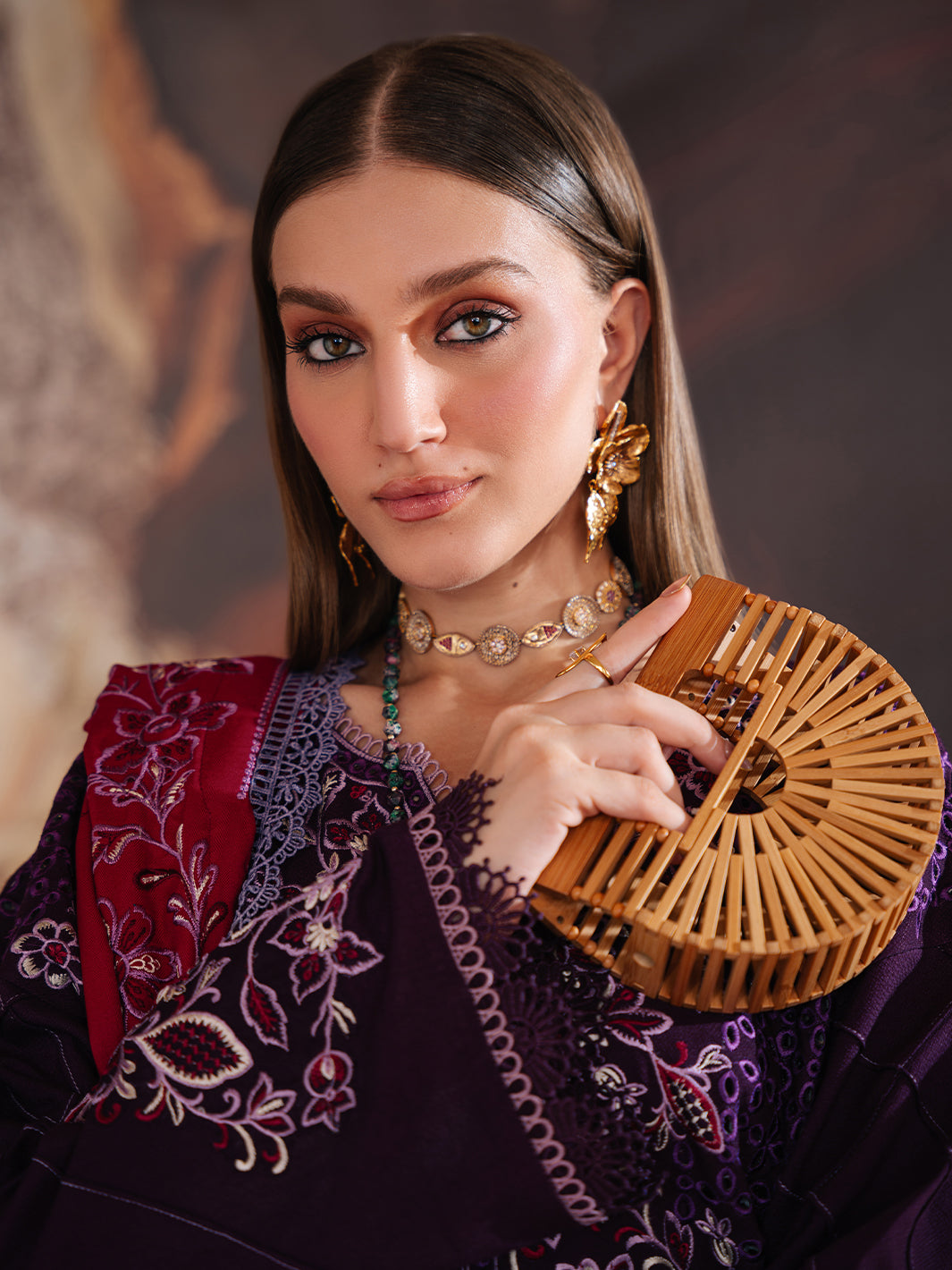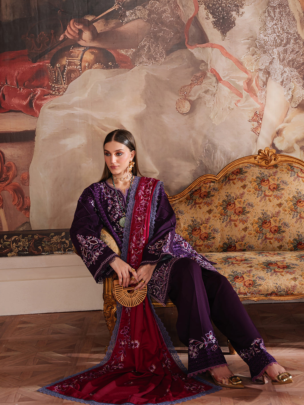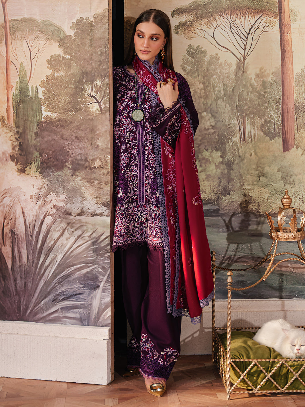Summary: Embrace winter elegance with this stunning Mahnur Pakistani Suit. The ensemble features a luxurious Karandi shirt in a rich, deep purple hue, perfectly suited for the Fall/Winter season. The kameez is adorned with intricate embroidery across the front panel, complemented by delicate motifs on the sleeves. This unstitched ethnic wear provides a canvas for sophisticated tailoring. The warm Karandi fabric and formal design make this Pakistani dress a standout choice for winter weddings, formal dinners, and festive gatherings. A true statement piece of festive clothing, this outfit is ideal for creating a memorable look at any celebratory event.