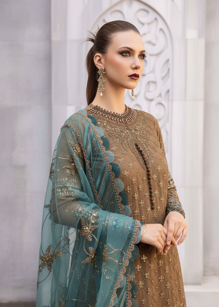 Summary: Introducing the exquisite MARIA.B Sateen Cotton Satin Suit – CST-808, a stunning ensemble perfect for making a statement at any party. This unstitched three-piece suit allows you to tailor the fit to your exact preferences. The shirt, crafted from luxurious cotton satin, showcases a rich brown hue. The bodice is adorned with an embroidered neck patch complemented by delicate hand embellishments. The front, ghera patti, and sleeves also feature intricate embroidery, adding a touch of opulence. A dyed back provides a subtle contrast. The accompanying organza dupatta is a masterpiece in itself, with a captivating printed and embroidered design, creating a beautiful interplay of textures and patterns. Complete the look with the matching dyed cotton satin trousers. Dry clean only to preserve the delicate fabrics and intricate details of this stunning ensemble. This MARIA.B suit is guaranteed 100% authentic, ensuring you receive a genuine piece of designer craftsmanship. Embrace timeless elegance with this Pakistani suit – perfect for your next special occasion.
