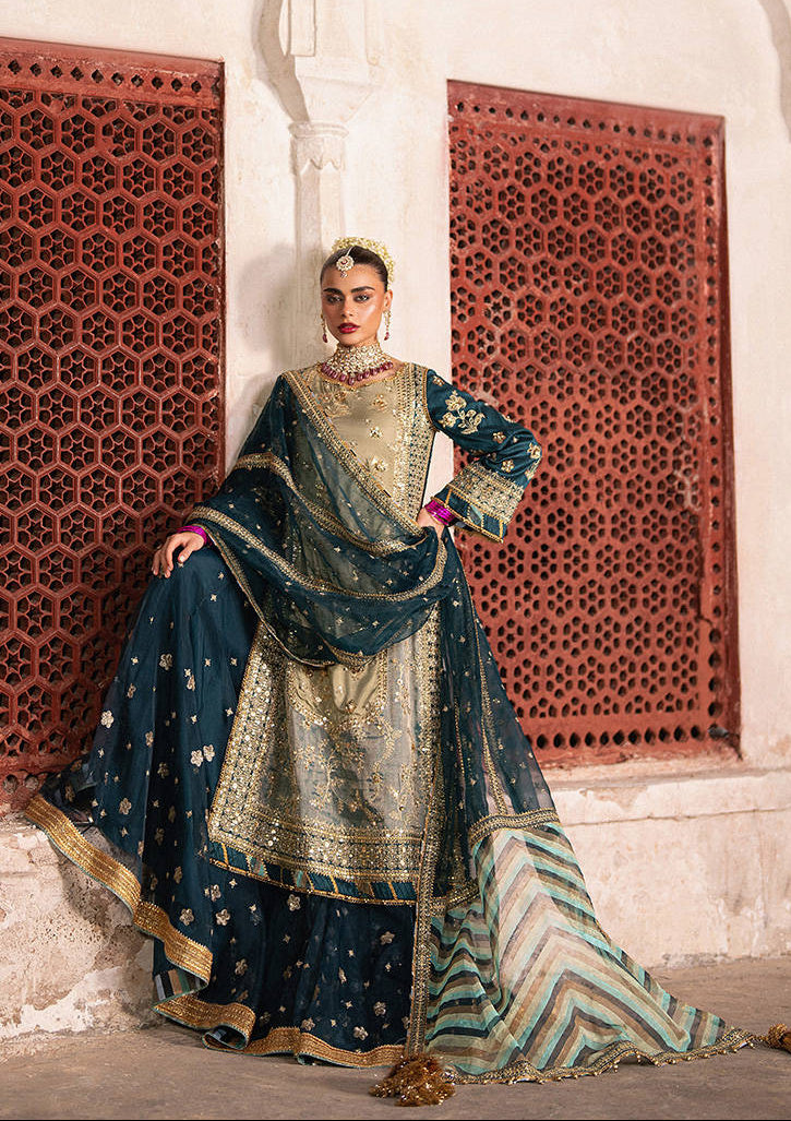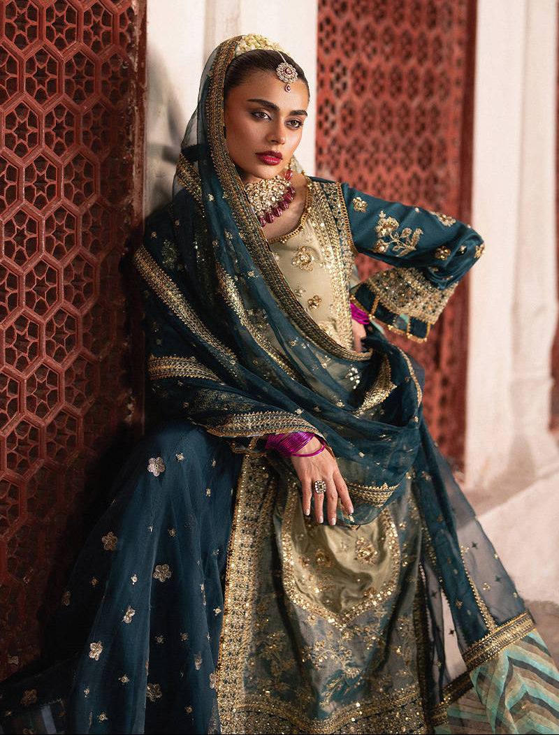 Summary: Embrace regal elegance with this Mohsin Naveed Ranjha Pakistani suit. The stunning long shirt, in a deep Teal Blue, is crafted from luxurious raw silk. It features a contrasting beige center panel, both lavishly adorned with intricate tilla and pani embroidery, creating an opulent look. The lightweight silk fabric makes this festive formal wear ideal for Spring/Summer events. This exquisite ethnic outfit is a perfect choice for grand celebrations, especially as a standout wedding guest dress, radiating timeless sophistication and charm.