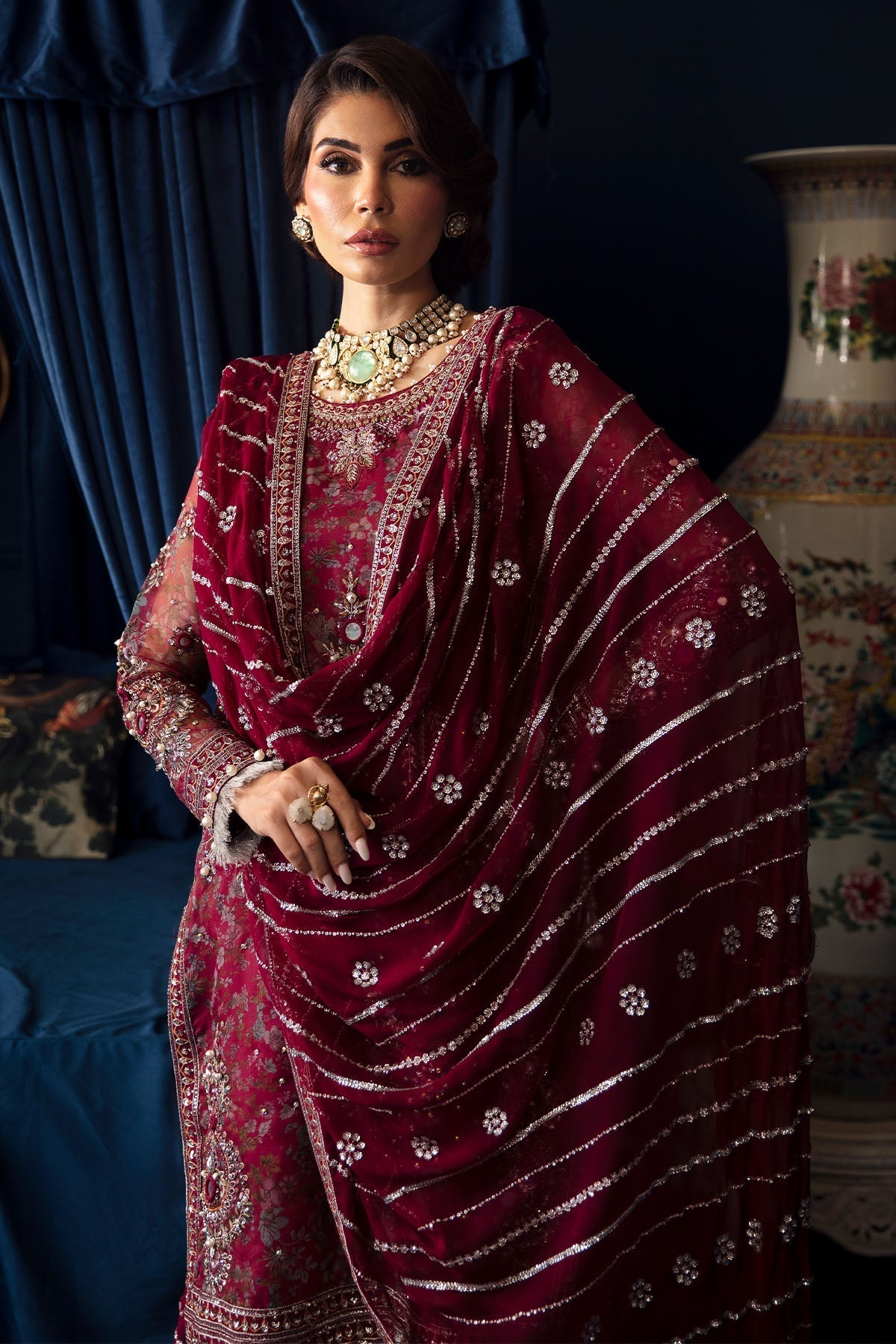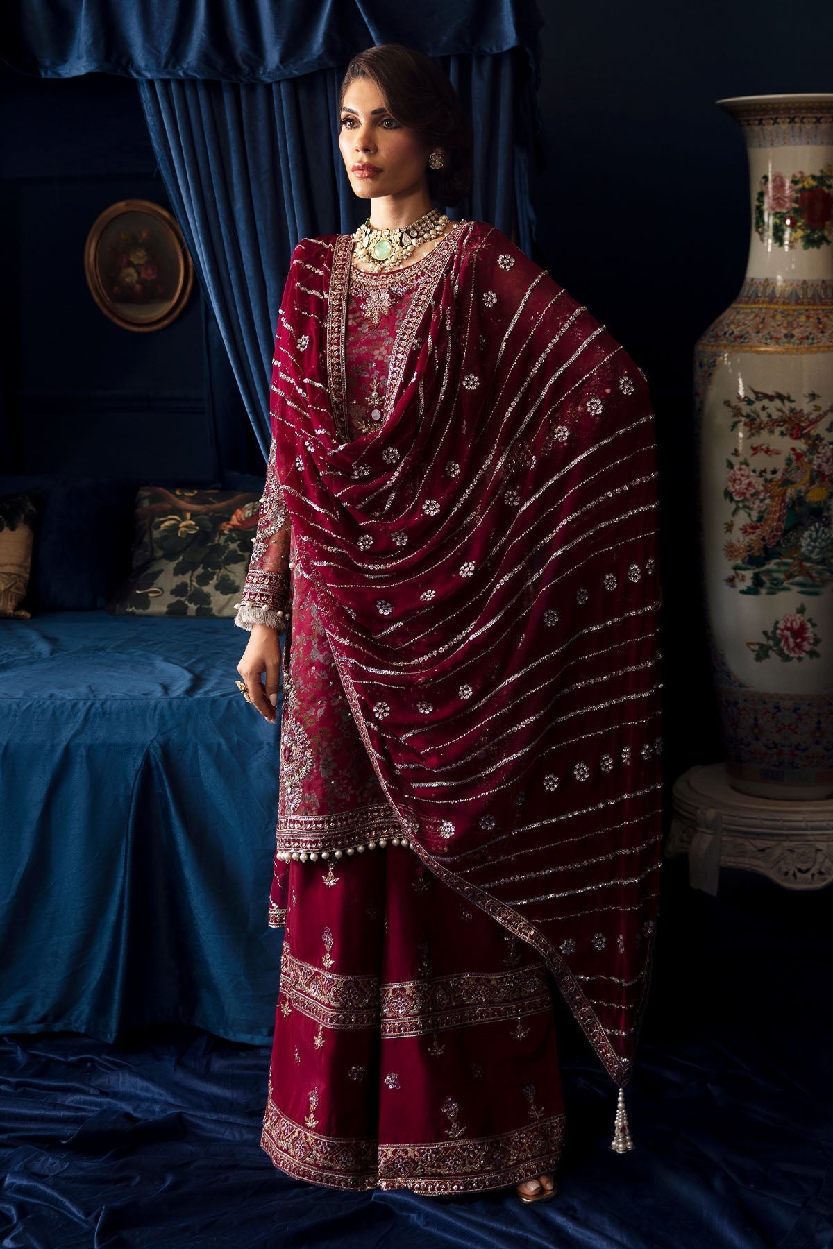 Summary: The Nureh Elanora Luxury Formals NEL-49-Starla is a stunning maroon Pakistani suit crafted from luxurious organza. This unstitched three-piece ensemble includes an intricately embroidered and printed organza front with delicate hand embellishments. The back of the shirt features a similar printed organza, creating a cohesive and elegant look. The neckline is adorned with an embroidered silk patch, while the front and back damans, along with the side seams, boast embroidered silk borders, adding a touch of traditional charm. The sleeves are fashioned from embroidered printed organza with hand embellishments and finished with an embroidered silk border. The raw silk trouser is also embellished with embroidered silk borders. Completing the ensemble is a beautifully embroidered chiffon dupatta with a four-sided embroidered silk border. A plain dyed inner lining ensures comfort and ease of wear. This exquisite suit is perfect for formal occasions and celebrations, making you the center of attention with its intricate details and rich maroon hue.