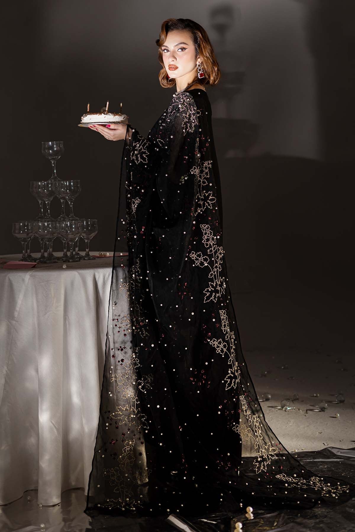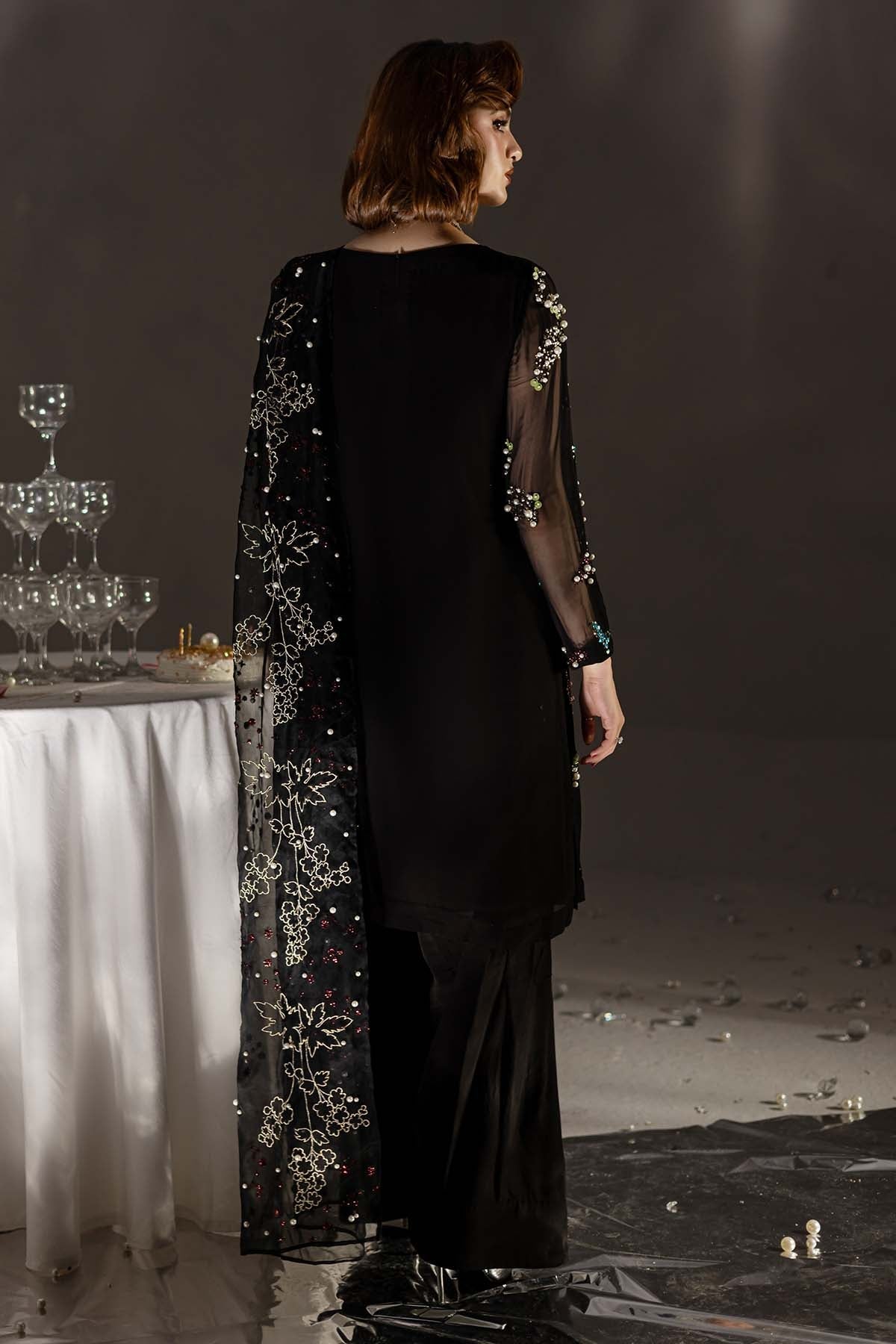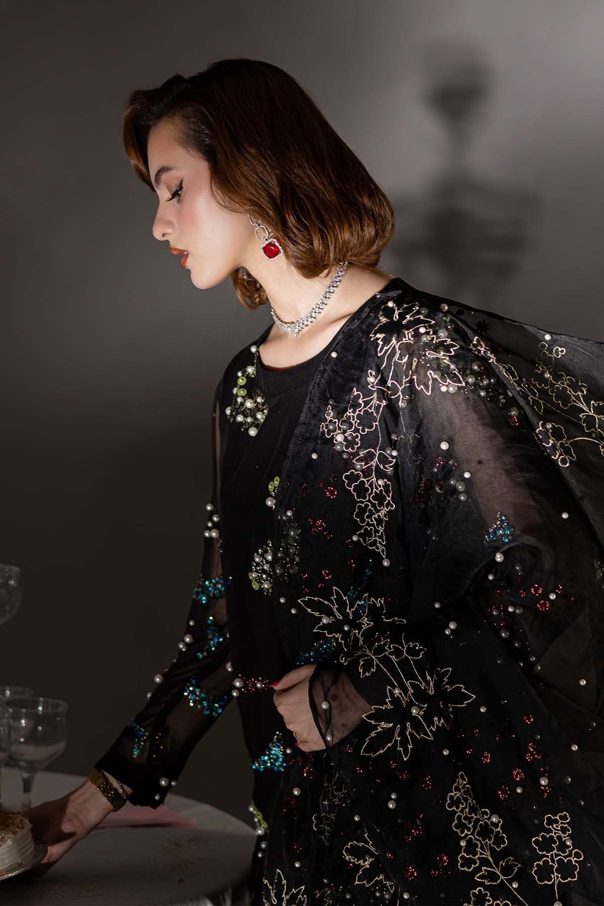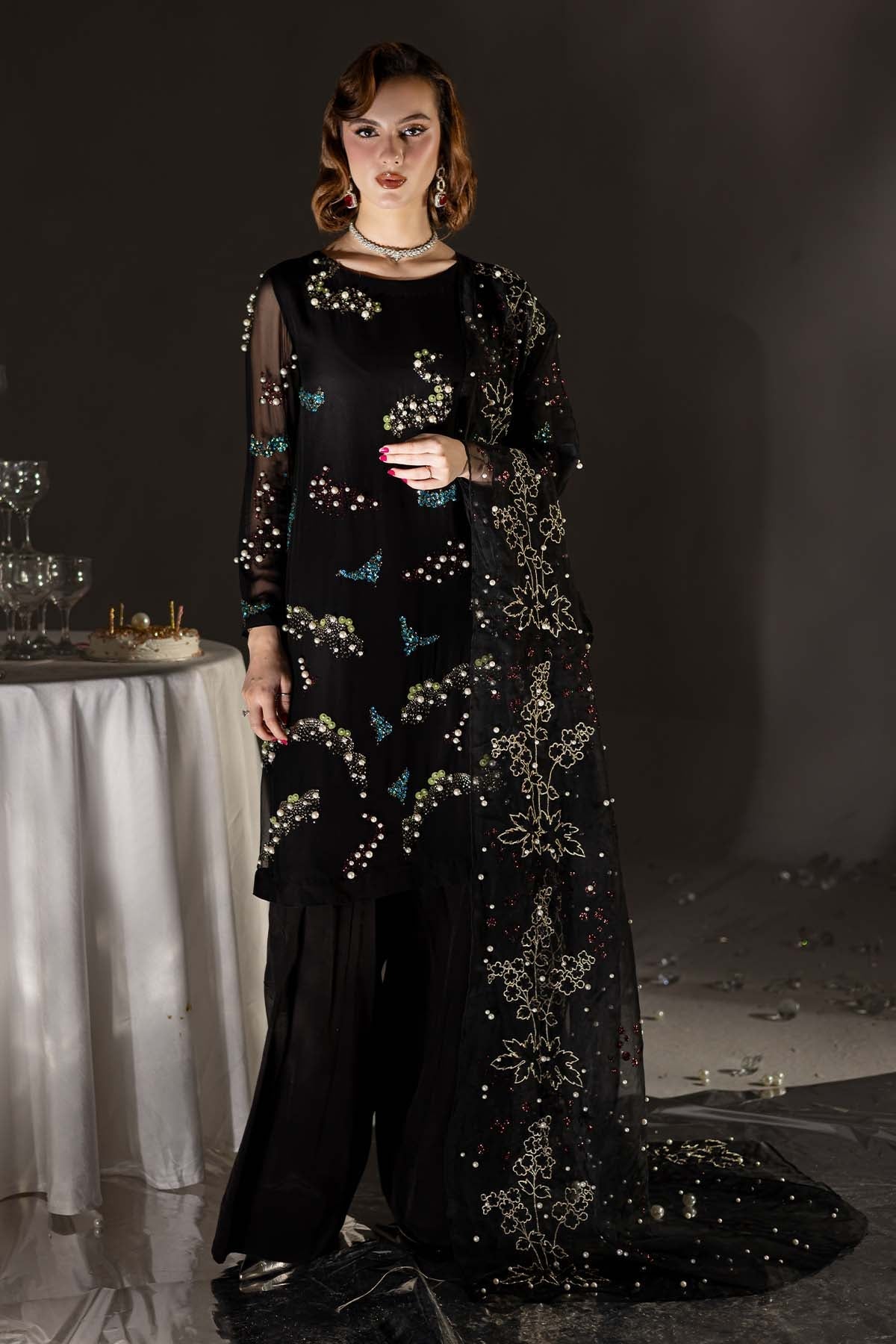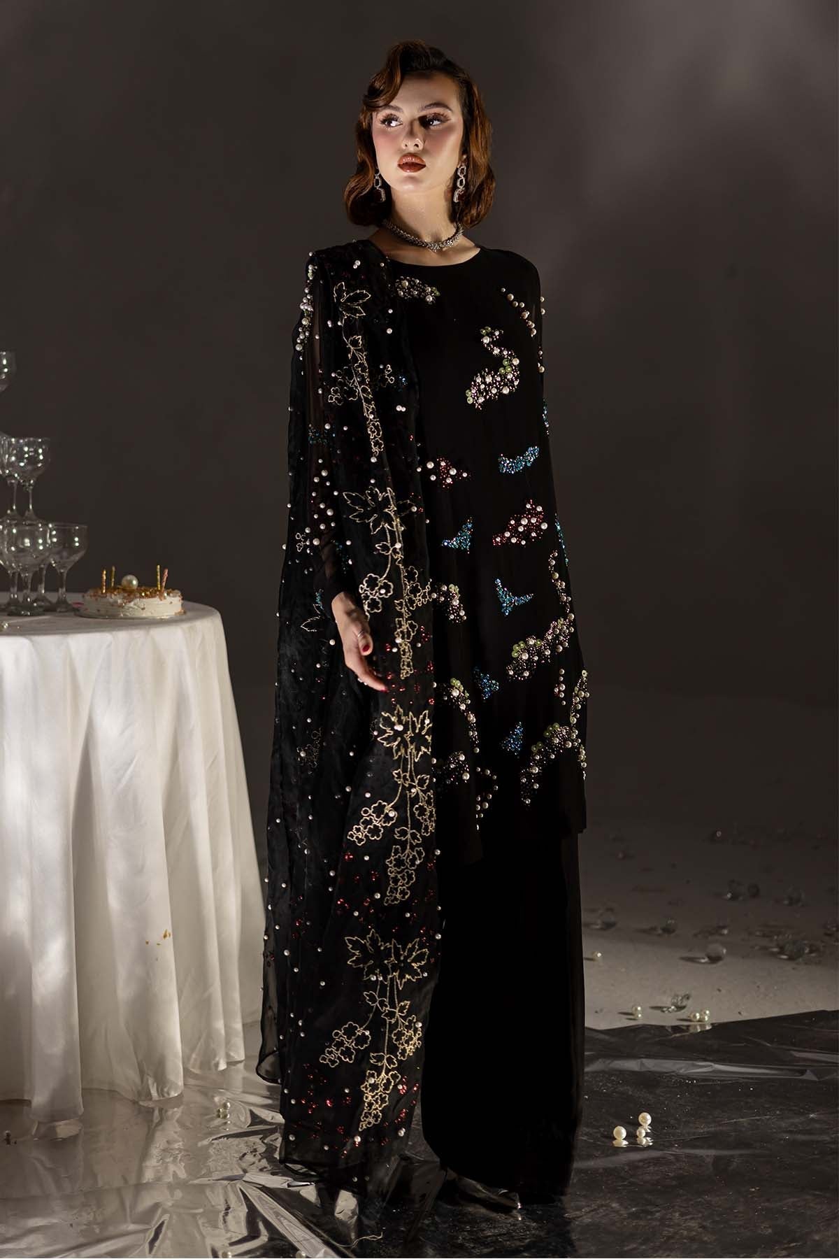 Summary: Embrace timeless elegance with the 'Tiny Twinkles' formal suit by Nureh. This stunning Pakistani dress features a classic black kameez crafted from premium chiffon, making it an ideal choice for Spring/Summer festivities. The shirt is adorned with exquisite hand embellishments that add a sophisticated sparkle, perfect for evening events. As a quintessential piece of formal wear, this black outfit is a versatile selection for weddings, parties, and celebratory gatherings. Shop this beautiful ethnic wear online to add a touch of glamour to your wardrobe, a perfect choice for any grand occasion.