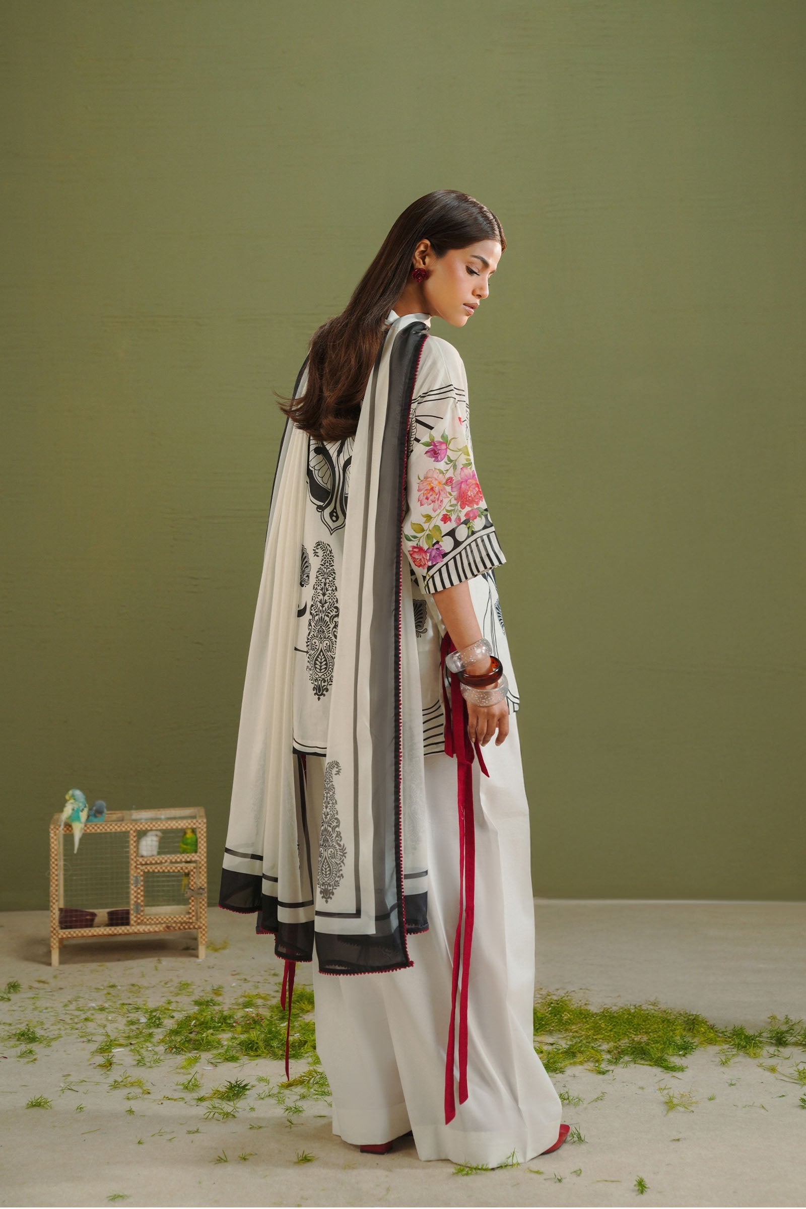Fabric: The dupatta is printed in black and white with paisley motifs and finished with a black border. The shirt features black and white art nouveau inspired prints. The trouser is detailed in black and white with a black border. Digital Printed Silk Dupatta 2.50 Mtrs Digital Printed Lawn Shirt 3.30 Mtrs Digital Printed Cambric Trouser 2 Mtrs |