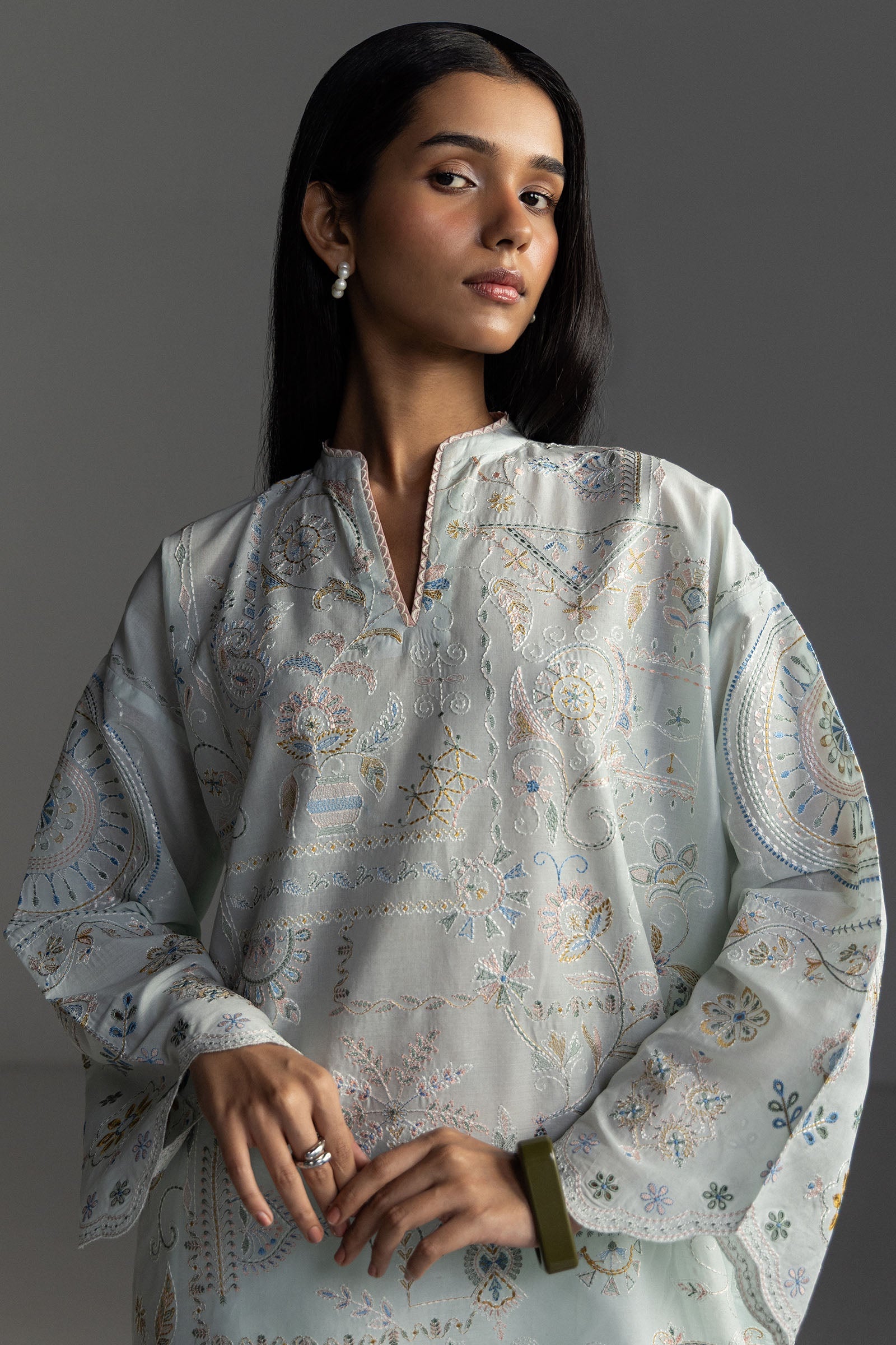 Summary: Discover serene elegance with the 'Veya' Pakistani suit by Zara Shahjahan. This stunning ensemble features an ice blue kameez meticulously crafted from premium lawn, a perfect choice for spring and summer wear. The shirt is adorned with intricate kantha embroidery on the front, back, and sleeves, creating a look of understated grace. As a sophisticated piece of ethnic wear, this Pakistani lawn dress is ideal for formal gatherings, Eid festivities, or daytime parties. Its light pastel shade and breathable fabric make it a beautiful choice for Nikah or Ramadan events, offering both comfort and style.