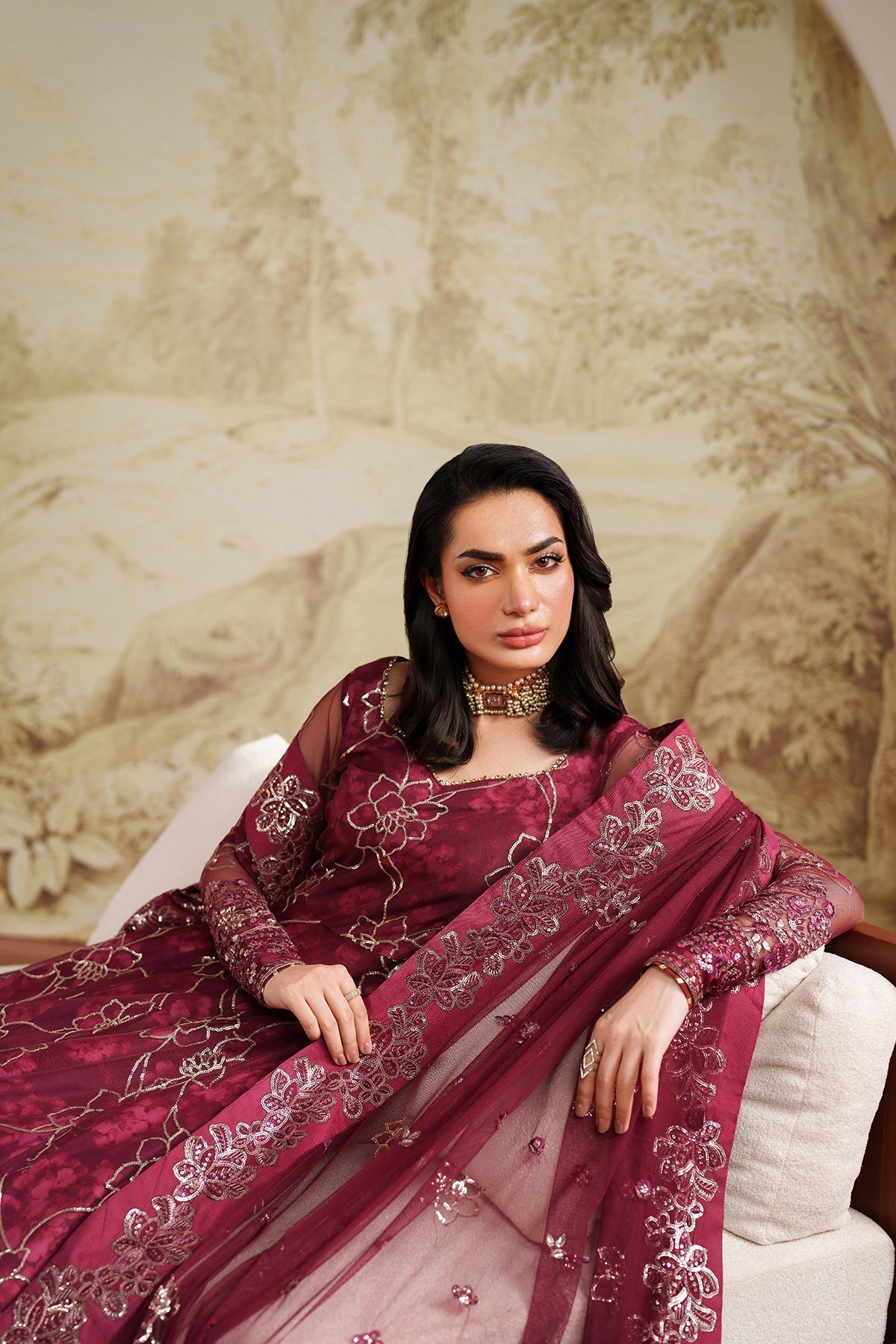 Summary: Embrace regal elegance with this Zarif Luxury Formal Pakistani suit. The ensemble features a stunning maroon kameez crafted from delicate, sequin-embroidered net, making it a perfect choice for Spring/Summer festivities. Intricate floral embroidery in a contrasting hue graces the entirety of the shirt, sleeves, and daman, exuding opulence. The design is layered over a vibrant printed raw silk inner, adding a unique visual texture. This exquisite ethnic wear is the epitome of formal clothing, ideal for wedding events or Eid celebrations. A standout piece of Pakistani festive wear, it promises a look of sophisticated grace.