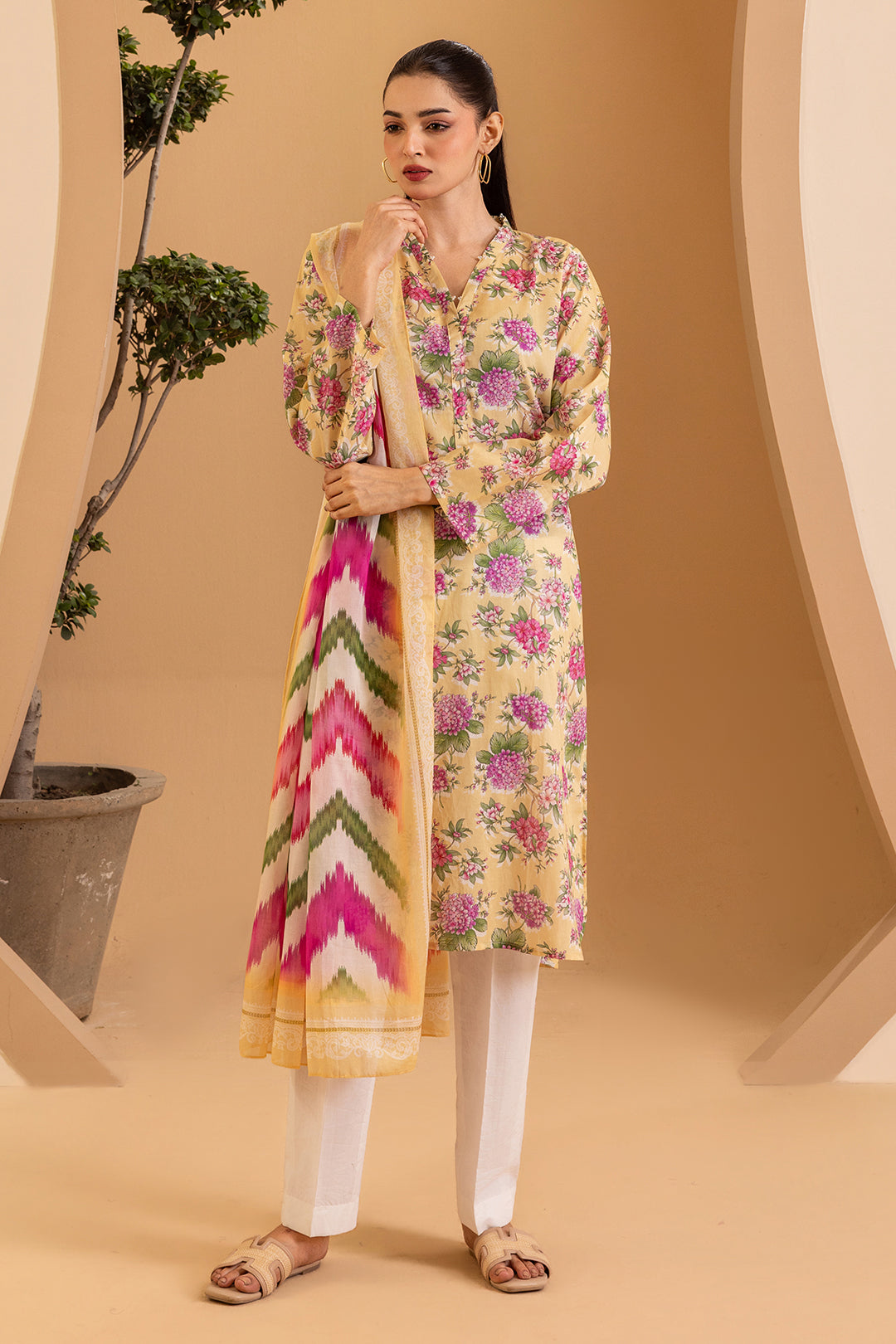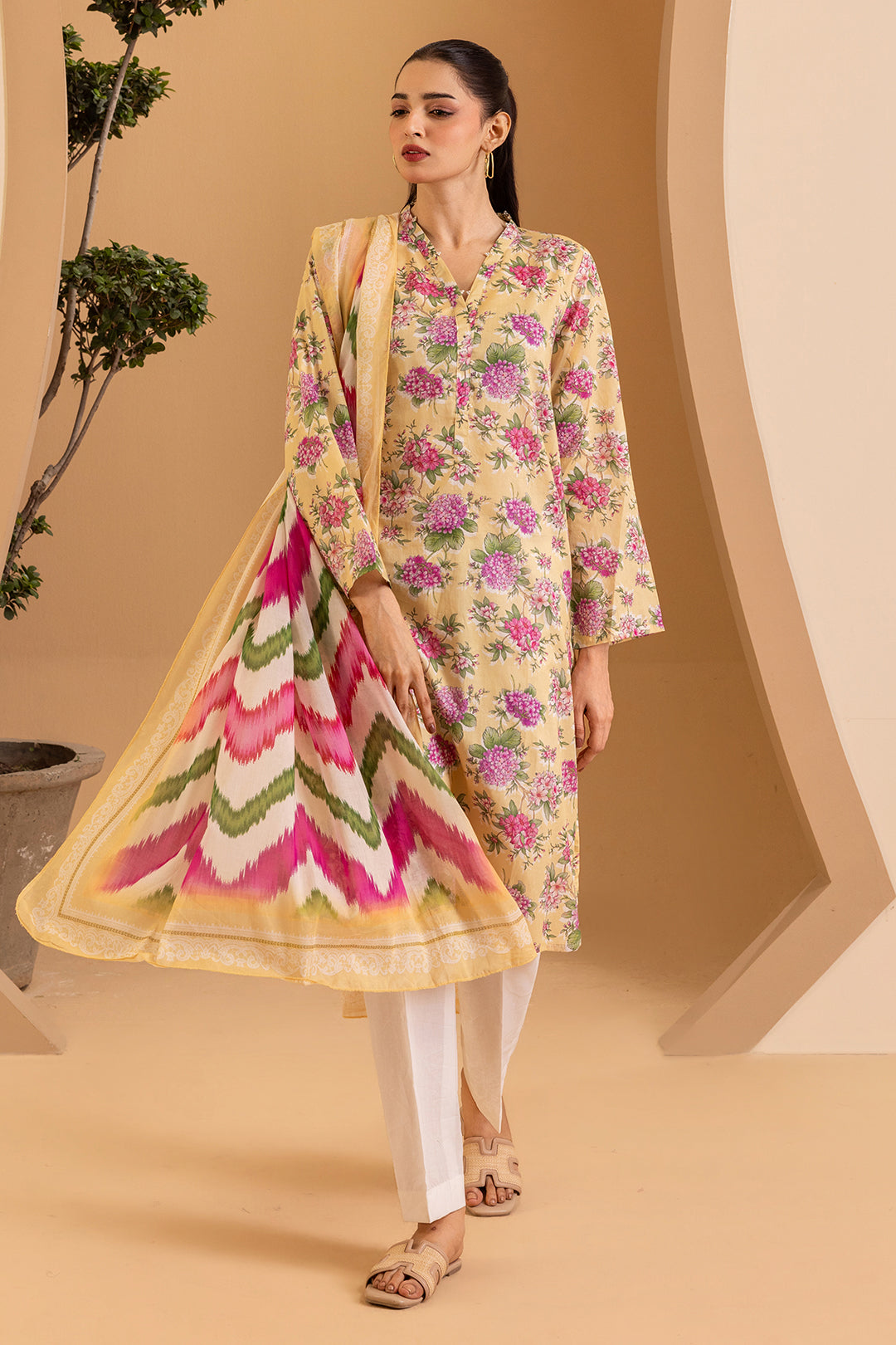 Summary: Step into the season with this elegant Zellbury Pakistani Lawn Suit. The kameez is crafted from premium, breathable lawn fabric, perfect for spring and summer comfort. It features a cheerful yellow base, making it a standout piece for daytime events and festive gatherings like a Haldi ceremony. The classic straight-cut silhouette and full sleeves offer a timeless appeal suitable for the modern woman. As a versatile piece of ethnic wear, this Pakistani dress blends effortless style with practicality, making it an excellent choice for casual outings, semi-formal occasions, or your Eid celebrations.