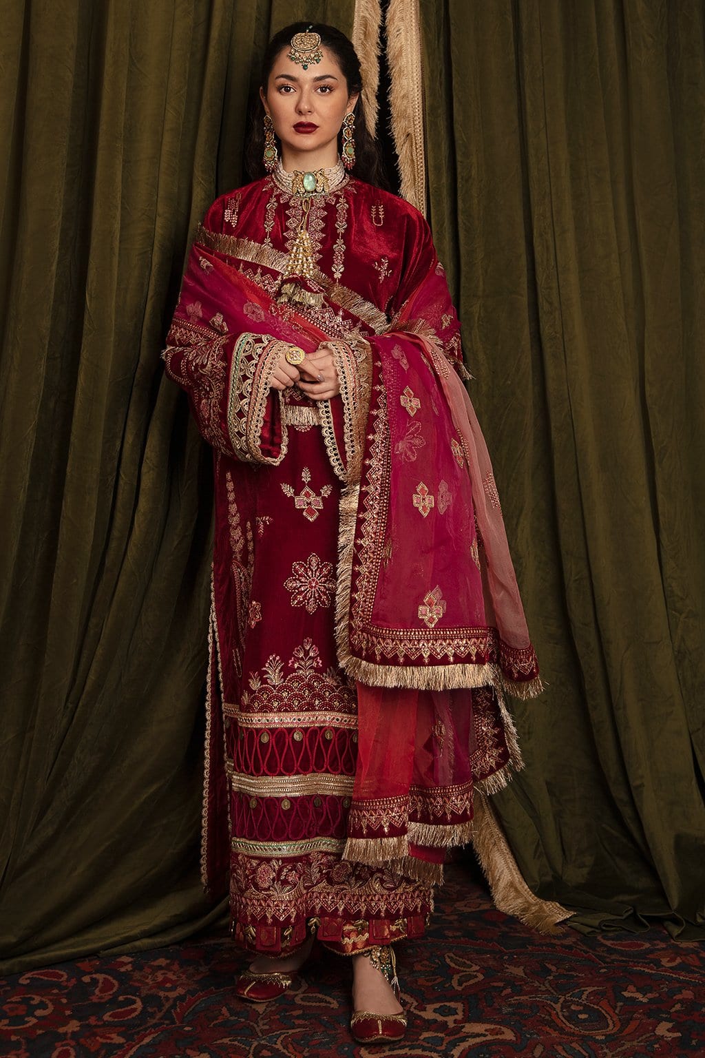 Fabric: Embroidered Velvet Front (1 Meter) Embroidered Velvet Back (1 Meter) Embroidered Velvet Sleeves (0.66 Meter) Embroidered Velvet Front + Back Borders (2 Meter) Embroidered Velvet Dupatta Borders (8 Meter) Embroidered Organza Dupatta 1 (3 Yards) Embroidered Organza Dupatta 2 (3 Yards) Embroidered Organza Dupatta 3 (3 Yards) Jamawar Trouser (2.5 Yards) Color : Magenta , Maroon , Peach , Rust . |