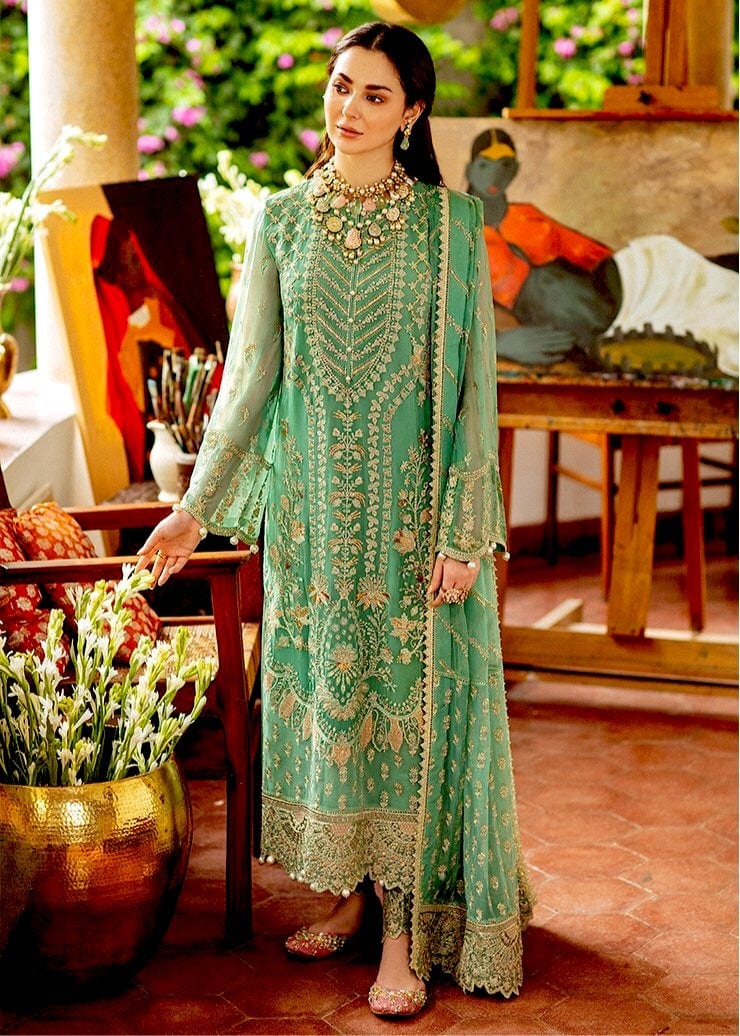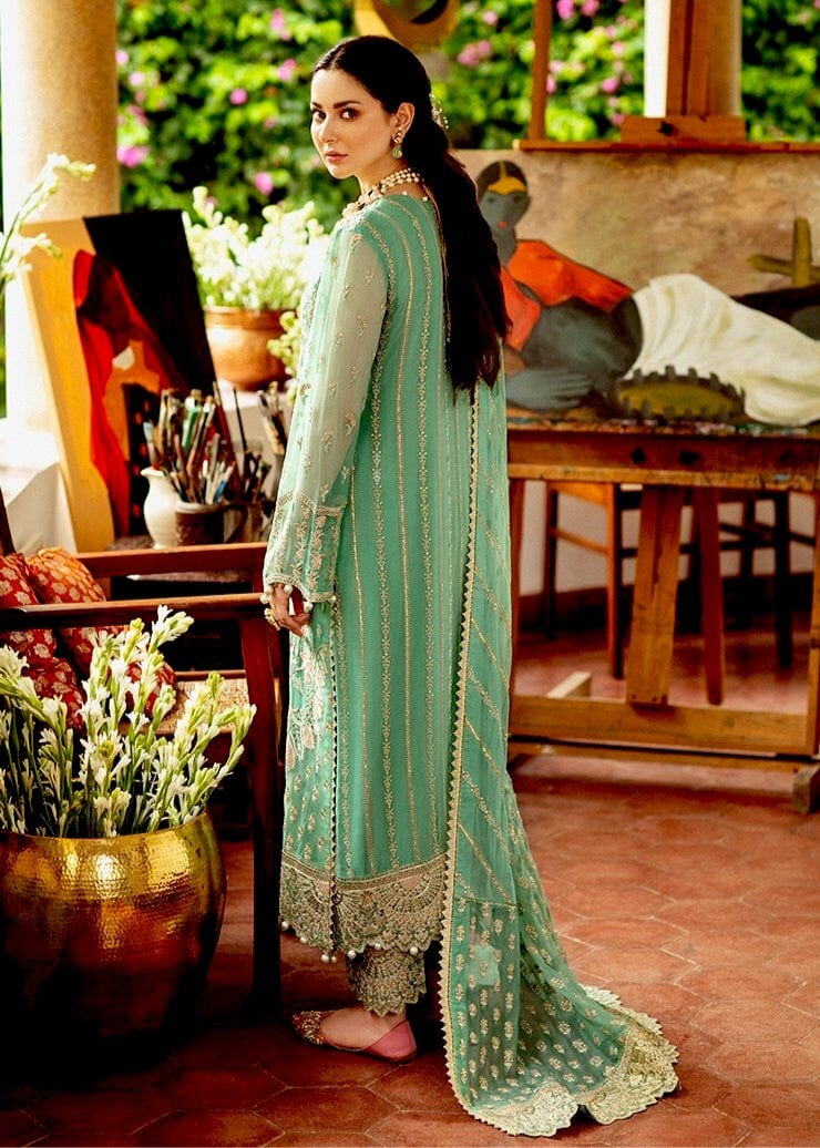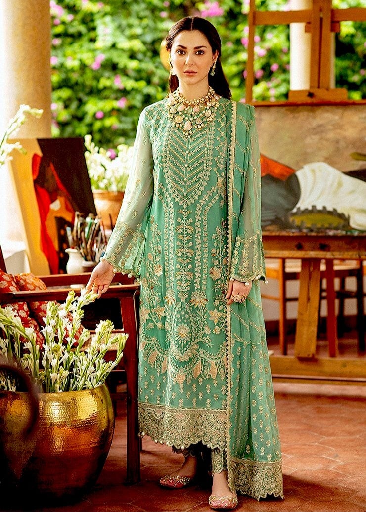 Fabric: Spend the fall season in comfort and style, with Johartaal from the Shehnai collection. Hania Amir is wearing this beautiful ensemble with ultimate grace. Its shining golden embroidery jumps out from the lighter background, making this the perfect piece for festive occasions. Embroidered chiffon Front: (1 meter) Embroidered chiffon back: (1meter) Embroidered chiffon sleeves: (0.75 yard) Embroidered organza border for front/back: (2 meter) Embroidered organza border for front: (1 meter) Embroidered chiffon dupatta: (2 yard) Embroidered chiffon two side border for dupatta: (2.5 meter) Embroidered Raw silk trousers:(2.5 yard) Embroidered organza border for trousers: (1 meter) |