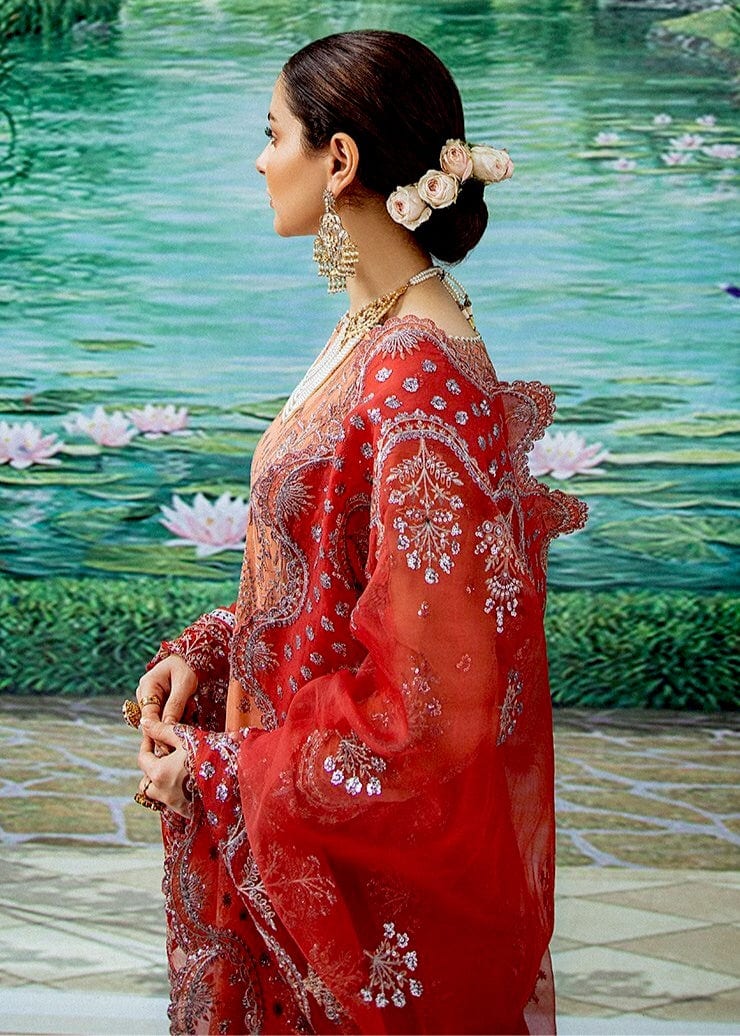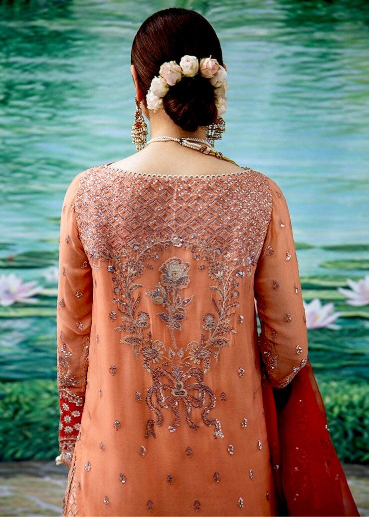 Fabric: Hania Amir stuns in Tabassum with its softer tones is just what the end of summer requires, and the darker dupatta is the perfect contrast for the piece. The detailing dances among the piece, bringing a certain overarching harmony to it. Embroidered chiffon Front: (1 meter) Embroidered chiffon back: (1meter) Embroidered chiffon sleeves: (0.75 yard) Embroidered organza border for sleeves: (1 meter) Embroidered organza border for front/back: (2 meter) Embroidered organza patch for back: (1 meter) Embroidered organza border for front/back: (2 meter) Embroidered organza dupatta: (2 yard) Embroidered organza border for dupatta: (2.5 yard) Jamawar trousers:(2.5 yard) Embroidered organza border for trousers: (1 meter) |