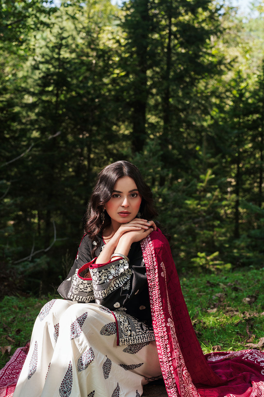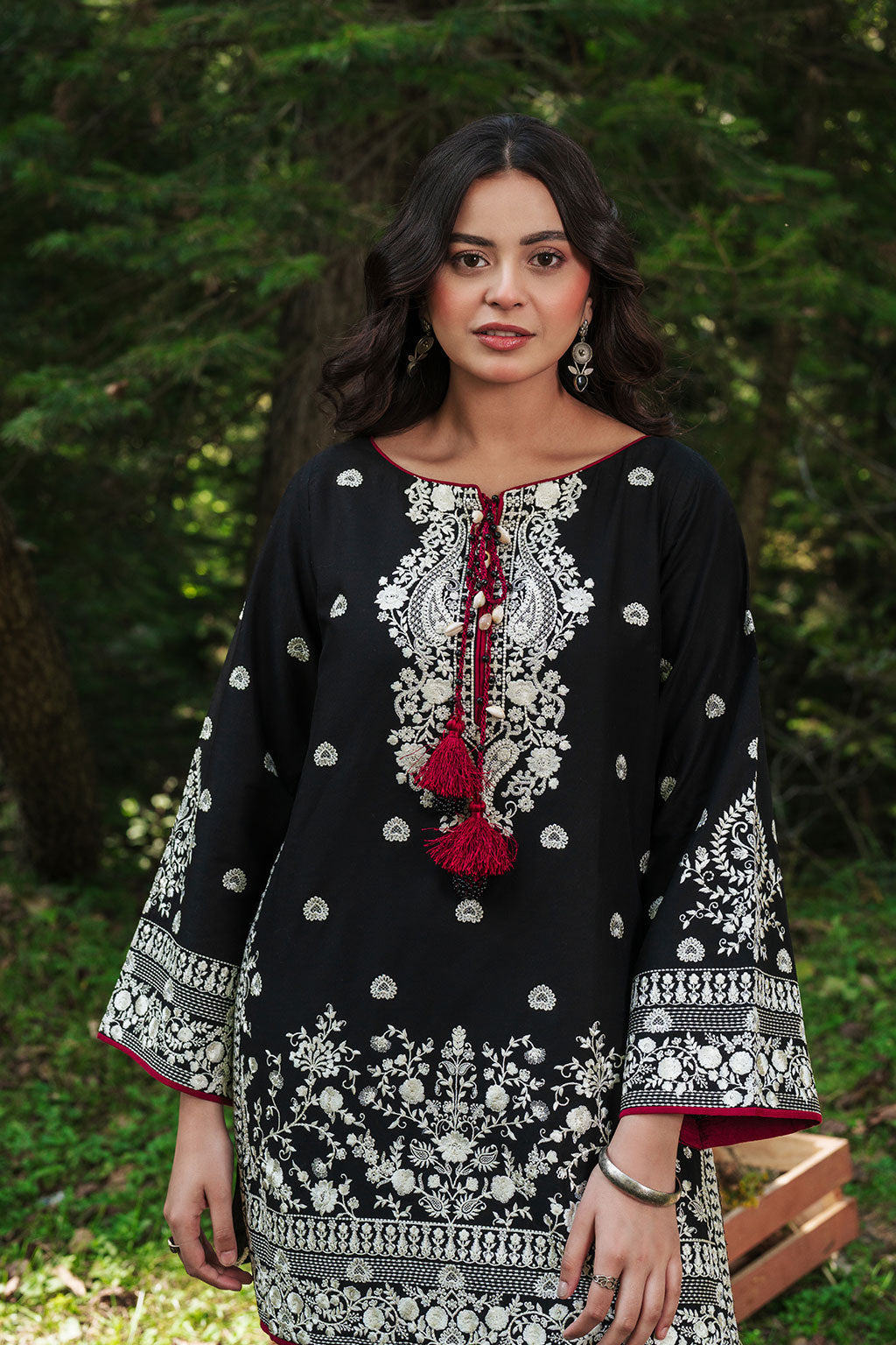 Summary: Embrace sophistication with the 'Afsanah Pine Tale' Pakistani Suit. This elegant ensemble features a classic black kameez crafted from premium lawn fabric, ensuring breathability and comfort for the spring/summer season. The shirt is adorned with intricate white embroidery on the front, back, and sleeves, creating a striking monochromatic look. This Pakistani Lawn Dress, with its formal aesthetic, is perfect for evening functions and festive gatherings. The refined design makes this ethnic wear a standout choice for Eid celebrations or formal dinners, offering a blend of traditional craftsmanship and contemporary style.