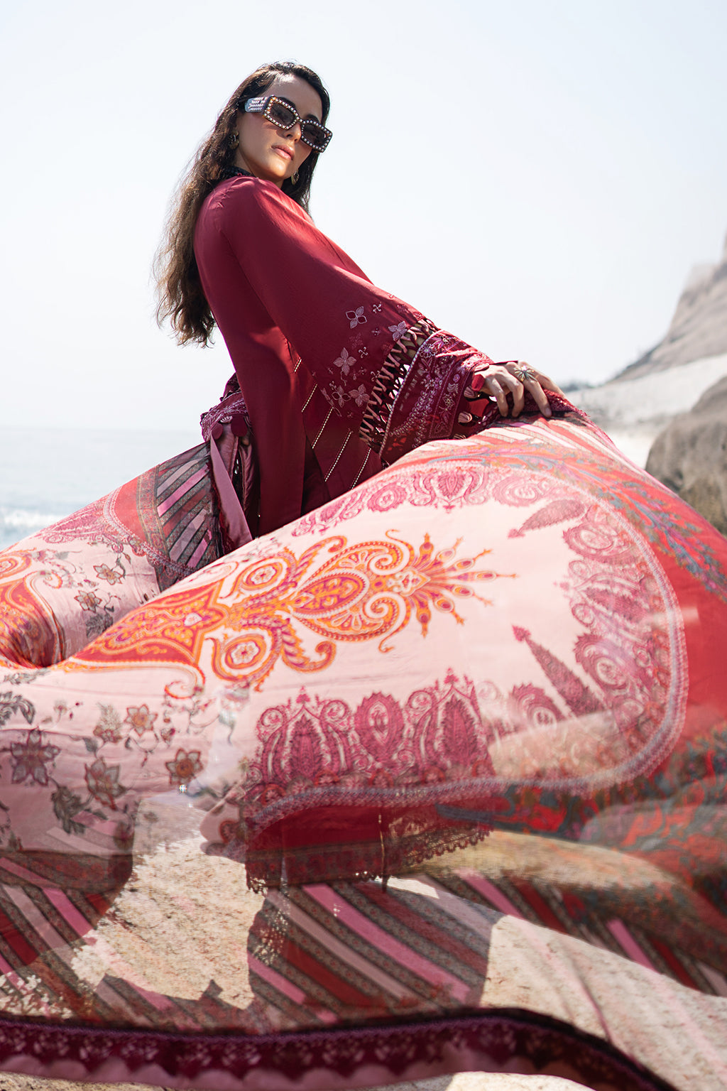 Fabric: Embroidered lawn front centre panel Embroidered lawn front right panel Embroidered lawn front left panel Embroidered lawn sleeves Embroidered organza border for front and back Dyed lawn back Dyed cambric trousers Printed silk dupatta |