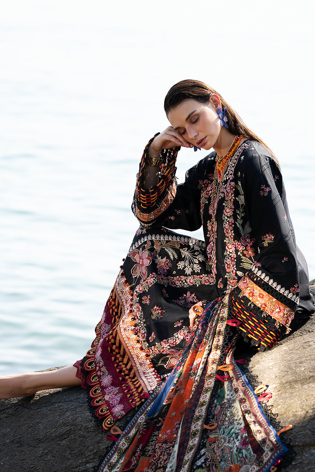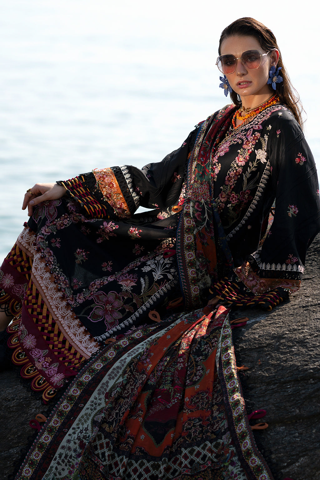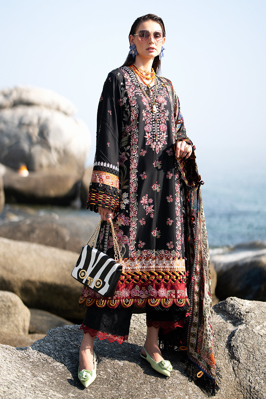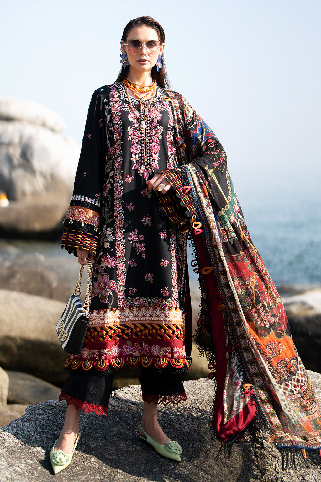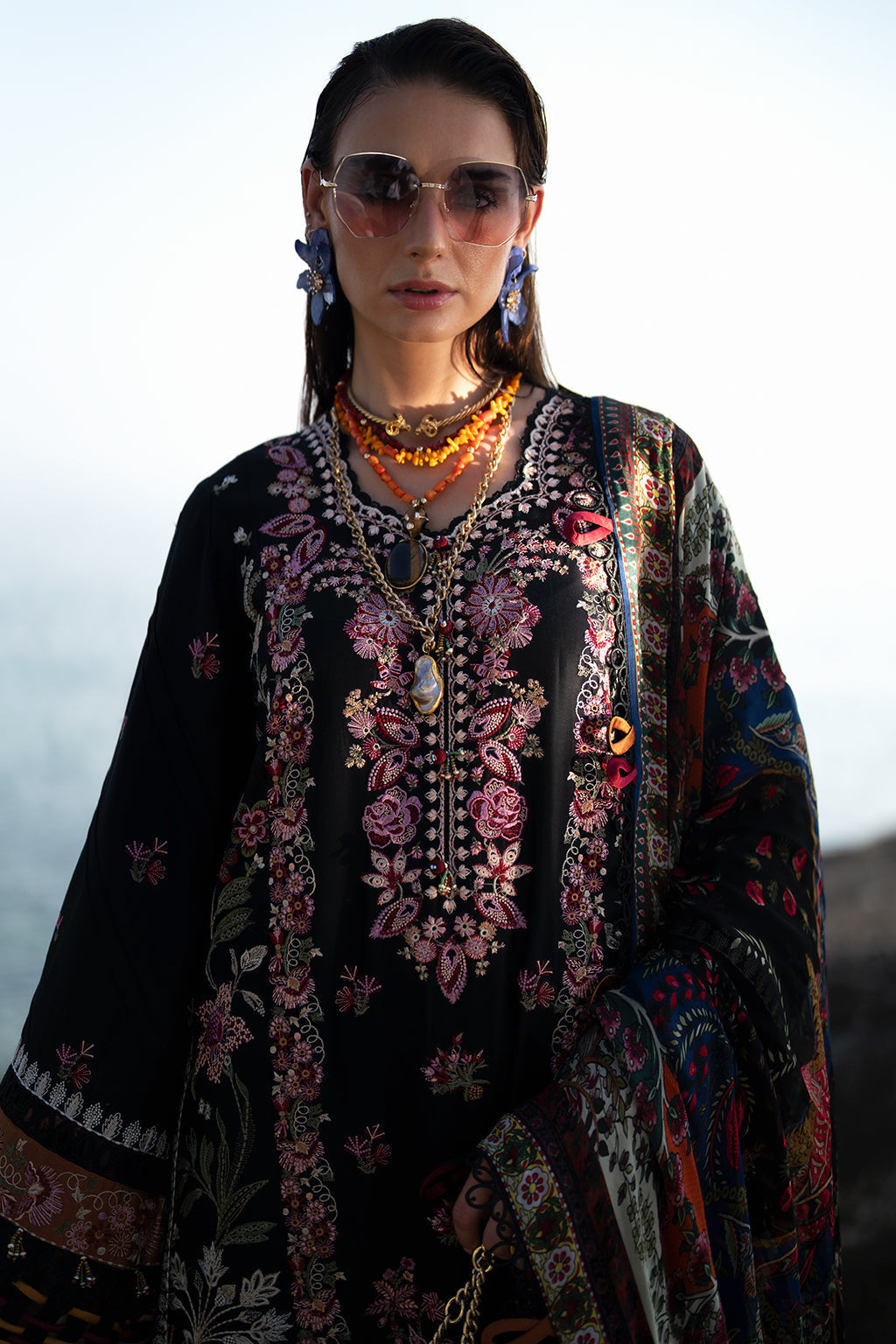 Fabric: Embroidered lawn front centre panel Embroidered lawn front right panel Embroidered lawn front left panel Embroidered lawn sleeves Embroidered shmose silk border 1 for front Embroidered shmose silk border 2 for front and back Embroidered shmose silk border for sleeves Dyed lawn back Dyed cambric trousers Printed Silk dupatta |