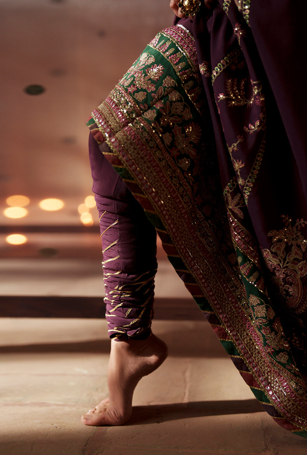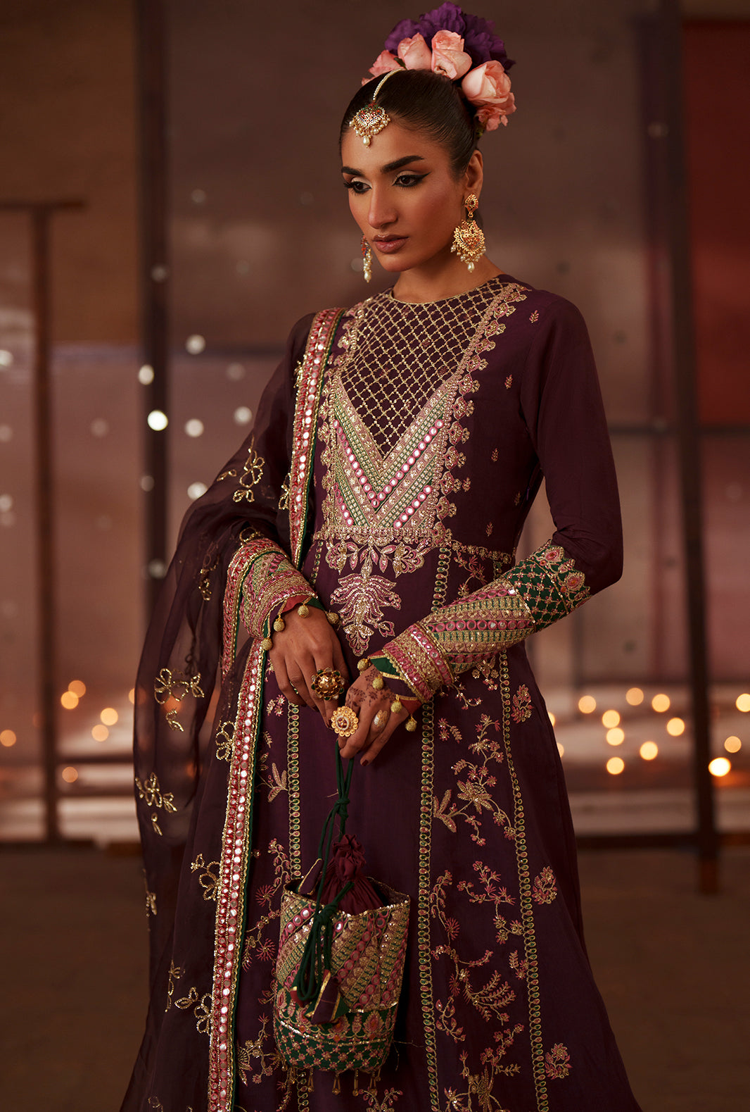 Fabric: Work Technique: Embroidered Best worn In: All Season Package Includes: 3PC Shirt, Dupatta & Trouser Fabric: RawSilk Description: Nazneen tells a tale of refined craftsmanship. Dark plum rawsilk kalidar with embroidered yoke, bold center daman motif, floral side panels, and delicate sprays. Three contrasting borders frame the hem, while chatta-patti sleeves add finesse. Dyed churidar trousers and an organza dupatta with green pallu borders complete a look of timeless sophistication and graceful movement. Unstitched Package Includes: Sequin embroidered rawsilk front and back yoke Sequin embroidered rawsilk front centre panel Sequin embroidered rawsilk front side panels [2 pcs] Sequin embroidered rawsilk fabric for front extensions Dyed rawsilk back fabric Sequin embroidered rawsilk kalidar border for front and back [majenta colored] Sequin embroidered rawsilk kalidar border for front and back [green colored] Sequin embroidered rawsilk kalidar border for front and back [lipstick pink colored] Dyed rawsilk sleeves Sequin embroidered rawsilk border for sleeves [green colored] Sequin embroidered organza sleeves border Sequin embroidered silk sleeves border [pink colored] Dyed rawsilk trousers Organza embroidered dupatta Sequin embroidered rawsilk dupatta pallu Sequin embroidered dupatta 4 sides patti |