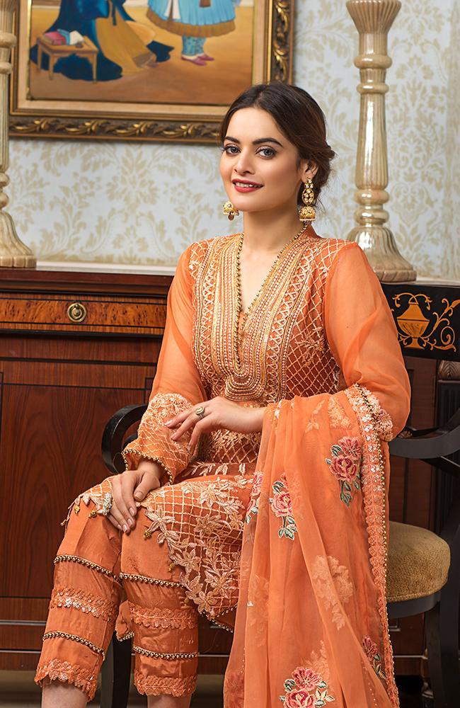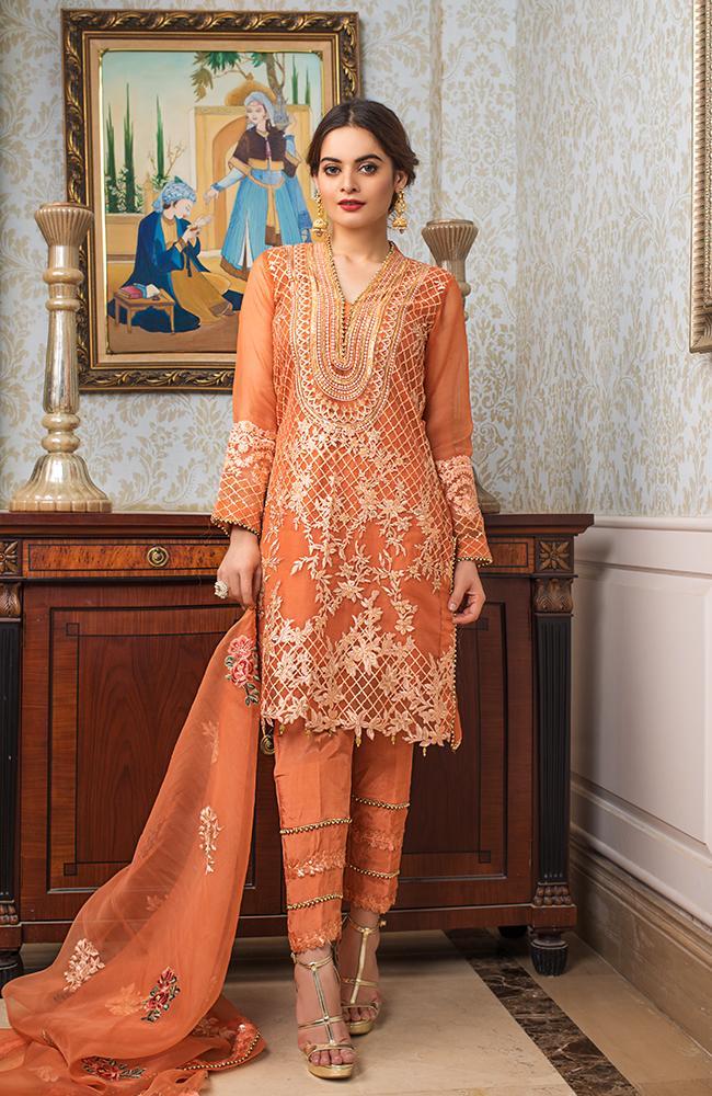 Fabric: 3 Piece Embroidered Formals Details: Embroidered Organza Front With Sequins N Tilla Work Embroidered Organza Side Panels With Sequins Work Dyed Organza Back Dyed Organza Sleeves Embroidered Organza Front Border Embroidered Organza Dupatta With Tilla Work Dyed Grip For Shirt Inner Dyed Crepe Trouser |