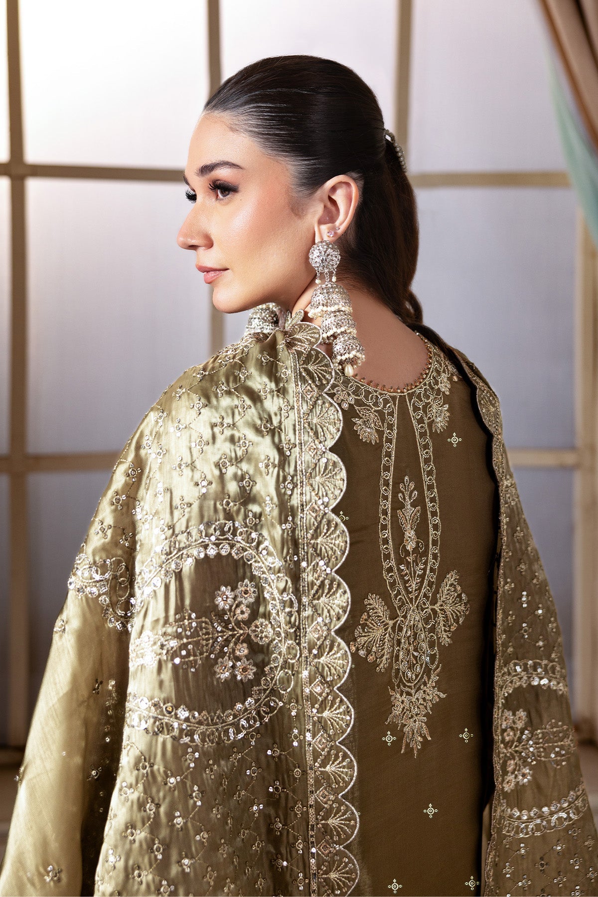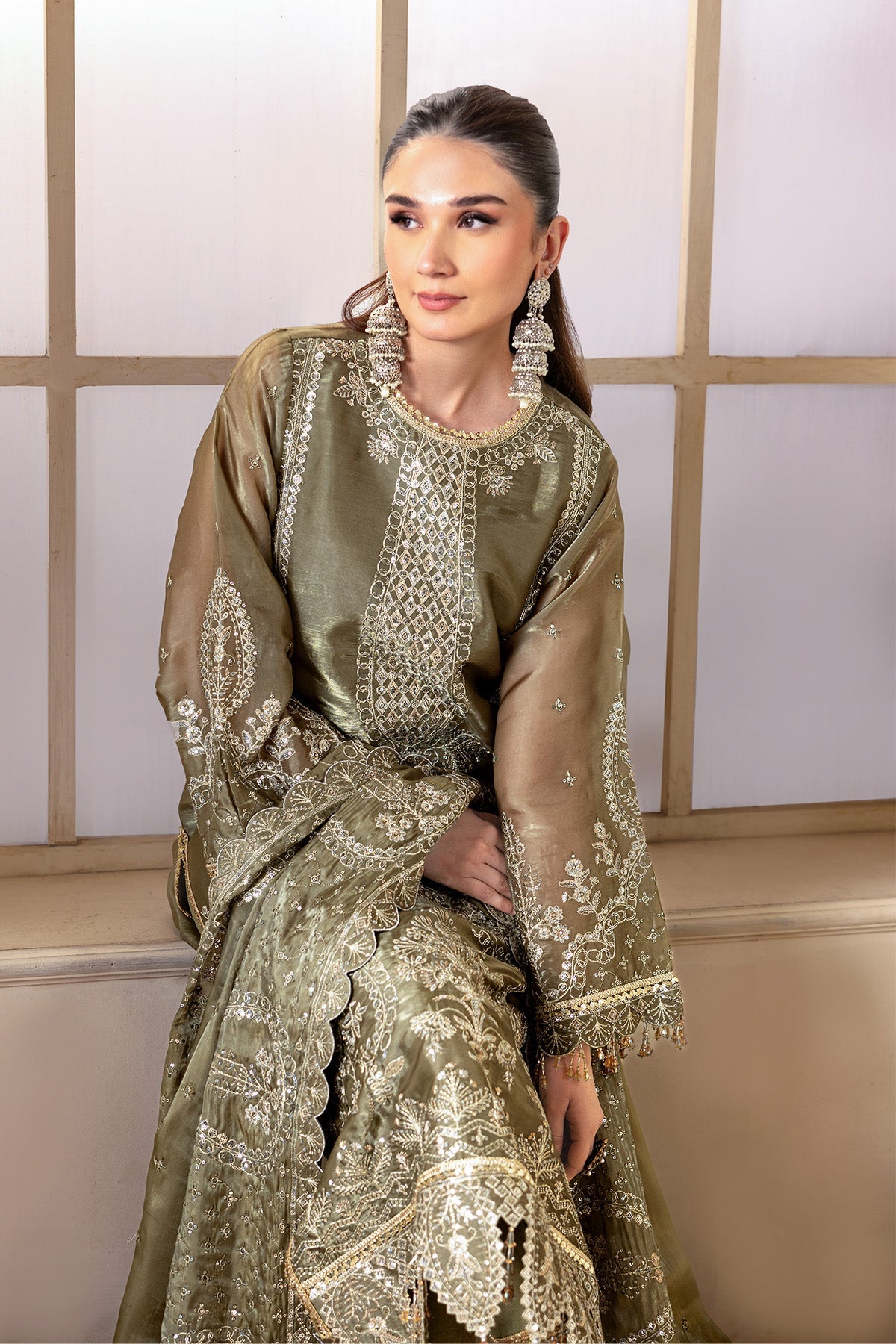 Summary: Radiate elegance with this exquisite Olive Green Pakistani Suit from the Alizeh Aaina collection. The main kameez is crafted from lustrous Sheesha Silk, heavily embellished with intricate traditional embroidery and shimmering mirror work that defines luxury. This unstitched formal dress material captures the essence of ethnic sophistication, making it an ideal choice for Mehndi ceremonies and wedding parties. The rich olive hue complements the sheen of the silk fabric, offering a regal look for festive occasions. Whether styled for an evening gala or a cultural celebration, this ensemble promises timeless beauty. Shop online to add this statement festive wear to your wardrobe.