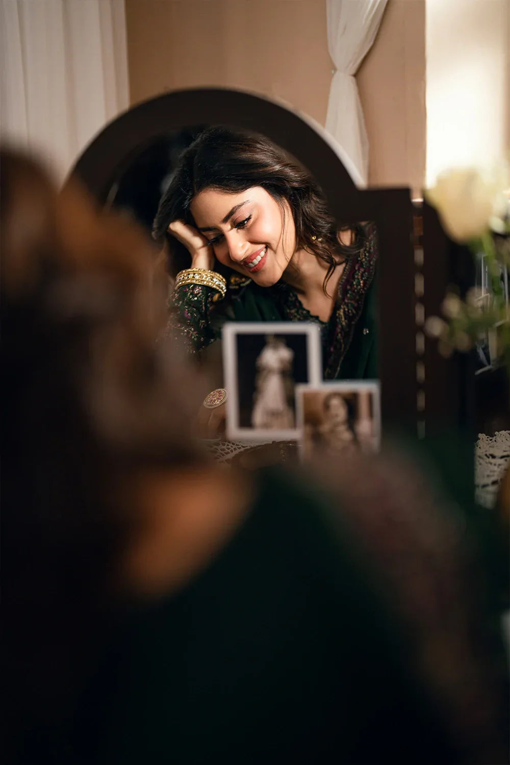 Summary: Embrace festive elegance with this stunning Glimmer Green Pakistani suit, gracefully worn by Sajal Ali. Crafted from luxurious bottle-green chiffon, this formal wear is perfect for spring/summer occasions. The kameez features intricate sequins and delicate embroidery on the neckline and sleeves, creating a luminous effect. As a quintessential piece of festive wear, its deep green hue makes it an ideal choice for a Mehndi ceremony or a wedding guest outfit. This unstitched ensemble from Azure allows for bespoke tailoring, ensuring a perfect fit for any elegant event. Shop this timeless ethnic wear piece.