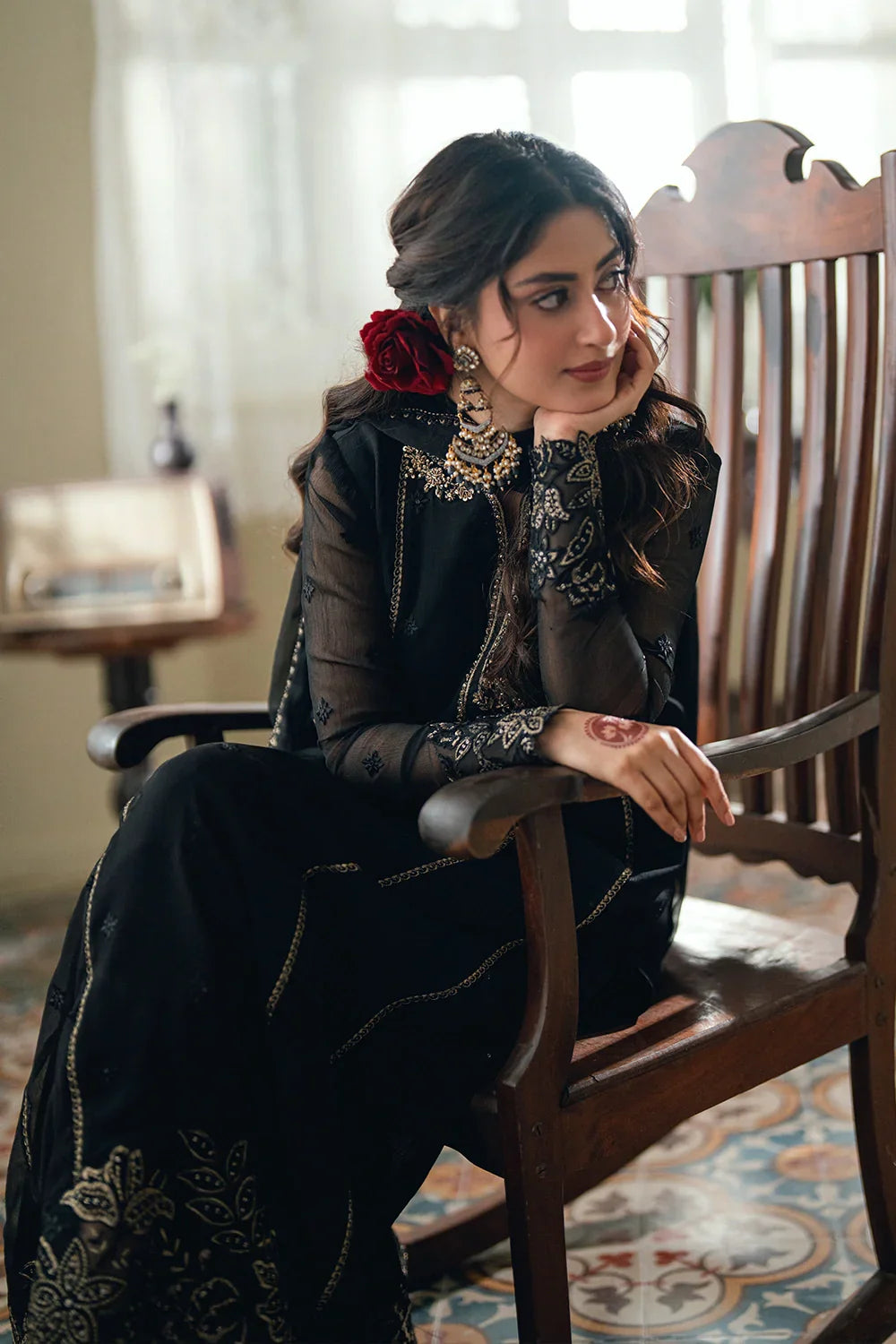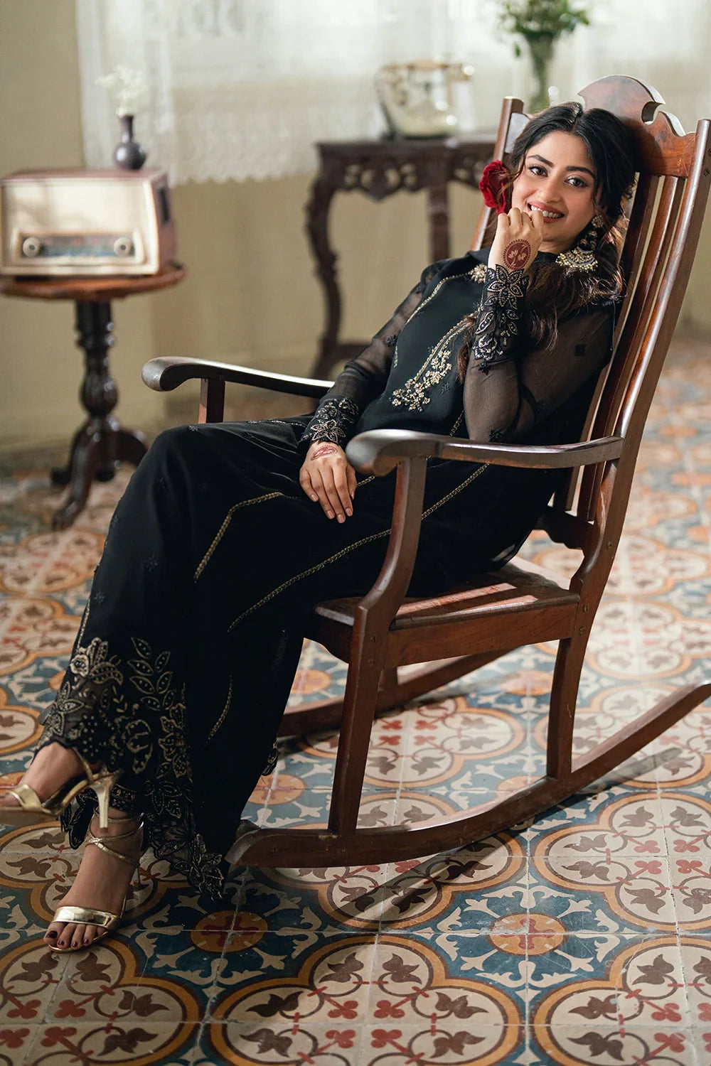 Summary: Exude timeless elegance with Azure's 'Nightingale' Festive Formal, gracefully adorned by Sajal Ali. This stunning Pakistani suit is crafted from luxurious black chiffon, a perfect lightweight fabric for Spring/Summer formal events. The kameez features a meticulously hand-embellished organza neckline and delicate sequins embroidery, creating a sophisticated silhouette. As a quintessential piece of Pakistani formal wear, this black ethnic ensemble is an impeccable choice for weddings, evening parties, and festive gatherings, offering a blend of modern charm and traditional grace. Shop this must-have Pakistani dress online.
