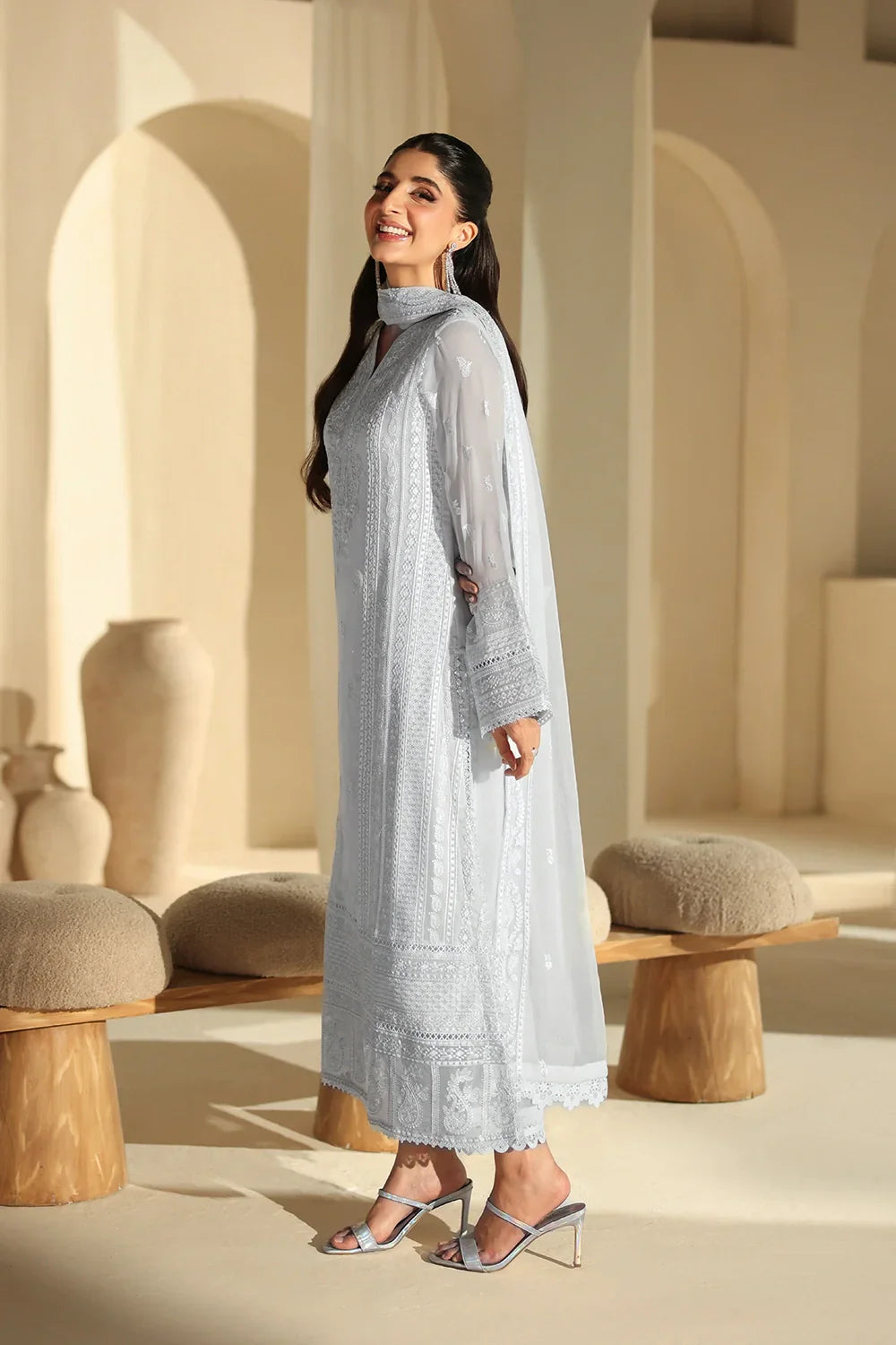 Summary: Discover ethereal elegance with the 'Ice Serenity' Pakistani suit by Azure. This formal wear masterpiece is crafted from delicate, airy chiffon in a serene ice blue shade, making it a perfect choice for spring/summer festivities. The kameez features intricate sequin embroidery on the front and sleeves, enhanced with an organza patch and lace details for a luminous finish. This stunning Pakistani dress exudes sophistication and grace. As elegant ethnic wear, its pastel tone is ideal for daytime weddings, Nikah ceremonies, or celebrating Eid in style. A must-have festive outfit for your wardrobe.