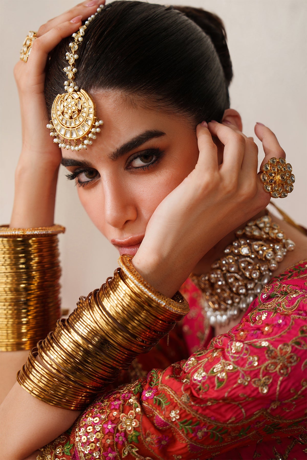 Fabric: Embroidered raw silk handmade front body (1 pc) Embroidered raw silk back body (1 pc) Embroidered organza belt border (1.25 Yards) Embroidered raw silk front & back panels (14 Pcs) Embroidered raw silk front & back border (5 Yards) Embroidered silk front & back border (5 Yards) Embroidered organza front & back border (5 Yards) Embroidered raw silk sleeves (0.75 Yards) Embroidered raw silk sleeves border (1.08 Yards) Digital printed silk dupatta (2.75 Yards) Embroidered organza dupatta side border (2.30 Yards) Embroidered organza dupatta border (8 Yards) Embroidered net dupatta (2.75 Yards) Embroidered organza dupatta border (8 Yards) Dyed raw silk trouser (2.5 Yards) - Choli or Yoke: Embroidered raw silk front and back body with handwork, paired with embroidered silk borders and raw silk sleeves. - Panels: Featuring pink to orange gradient having contrasting embroidery on panels with sequins work. - Dupatta: Embroidered digital printed silk dupatta with chunari pattern and embroidered net dupatta, finished with delicate side and pallu borders. - Pants: Dyed raw silk trouser with Peshwas set only. Details & Embellishments: The choli or yoke features intricate handwork of dabka, zari, and sequins, complemented by a blend of vibrant gradient and dual dupattas for an opulent finish. |