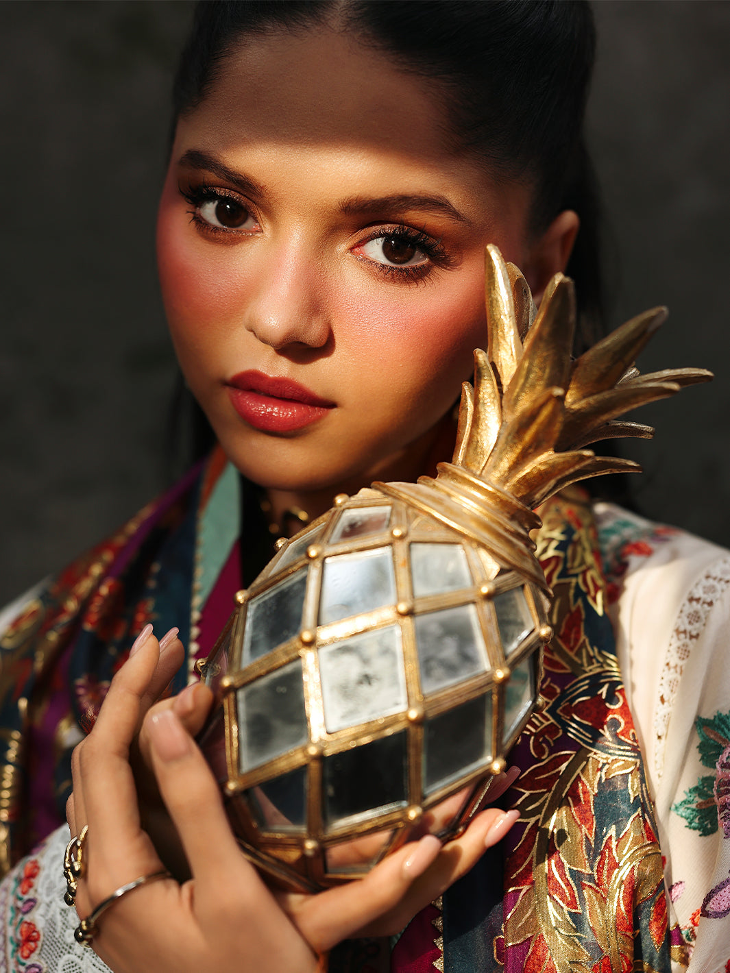 Fabric: Dyed Lawn Embroidered Front Left: 1 Piece Dyed Lawn Embroidered Front Right: 1 Piece Dyed Lawn Embroidered Sleeves Motifs: 2 Pieces Dyed Lawn Embroidered Sleeves Lace: 1 Meter Dyed Lawn Plain Sleeves: 0.33 Meter Dyed Lawn Embroidered Daman Lace: 0.80 Meter Dyed Lawn Plain Back: 1 Yard Embroidered Daman Lace On Dyed Organza: 0.80 Meter Digital Foil Print Silk Duppata: 2.50 Meter Dyed Cotton Trouser: 2.50 Meter |
