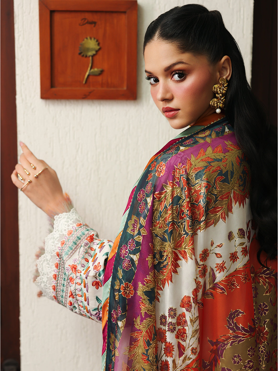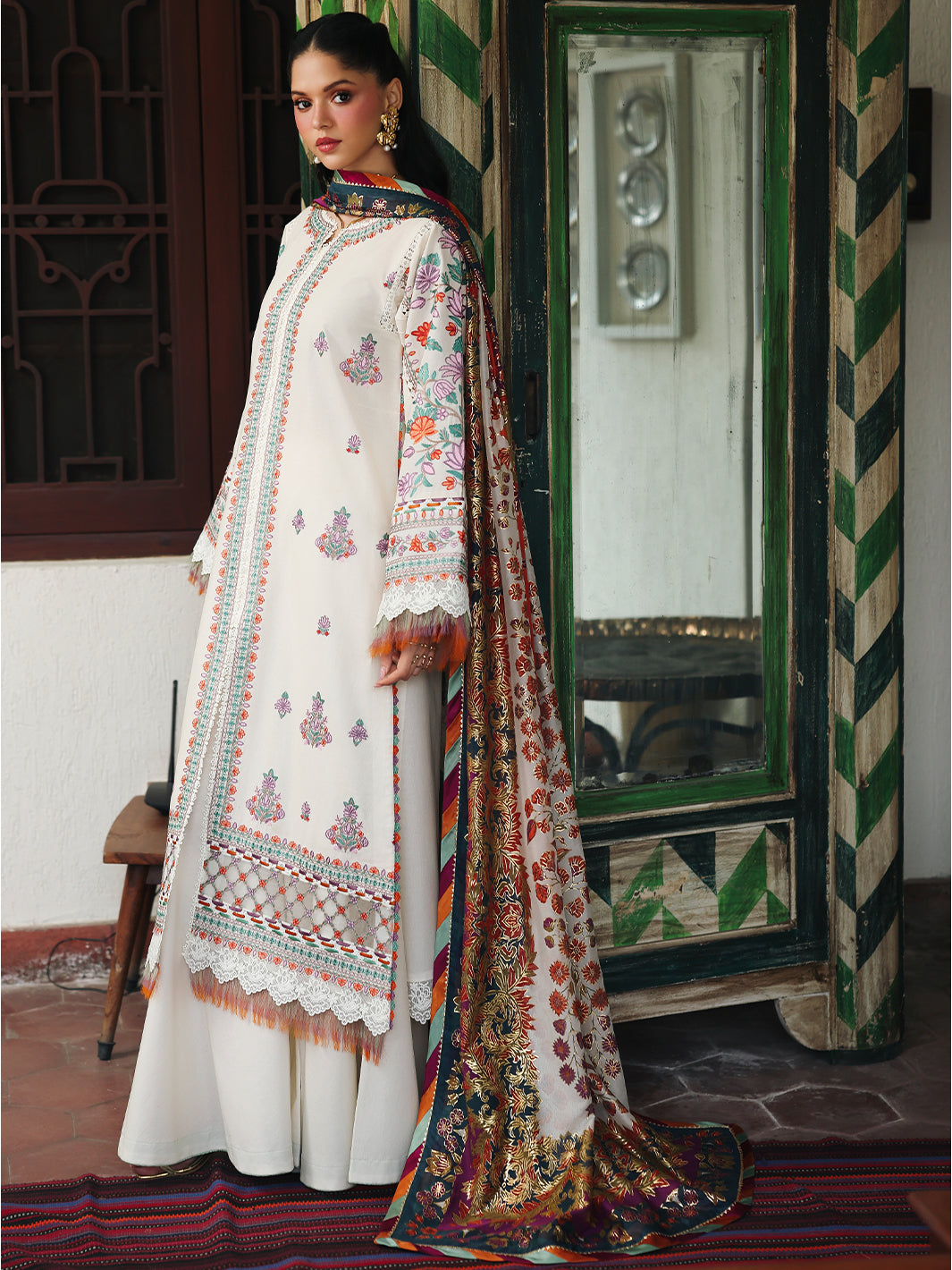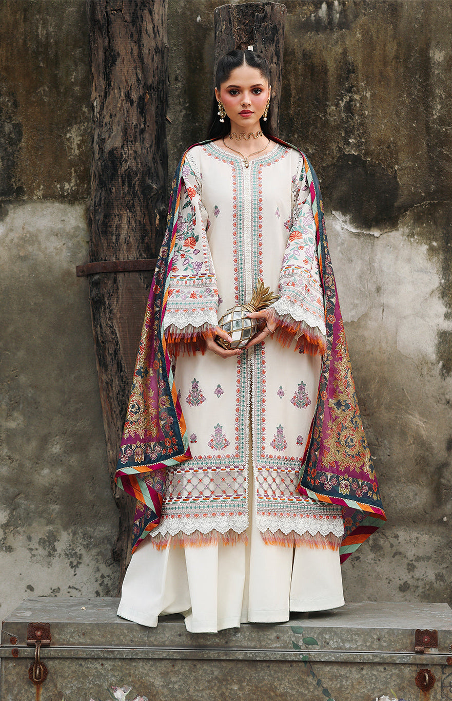Summary: Embrace timeless elegance with this off-white Pakistani suit from the Bin Ilyas Lumina Lawn collection. Expertly crafted from premium lawn, this summer outfit is light and breathable, ideal for warmer weather. The kameez features exquisite embroidery across the front panels and sleeves, enhanced with delicate lace on the bell-sleeve cuffs and daman. Paired with a vibrant digital foil print silk dupatta, this ethnic wear ensemble strikes a perfect balance between tradition and contemporary style. This formal wear is a sophisticated choice for Eid, festive gatherings, or daytime events.