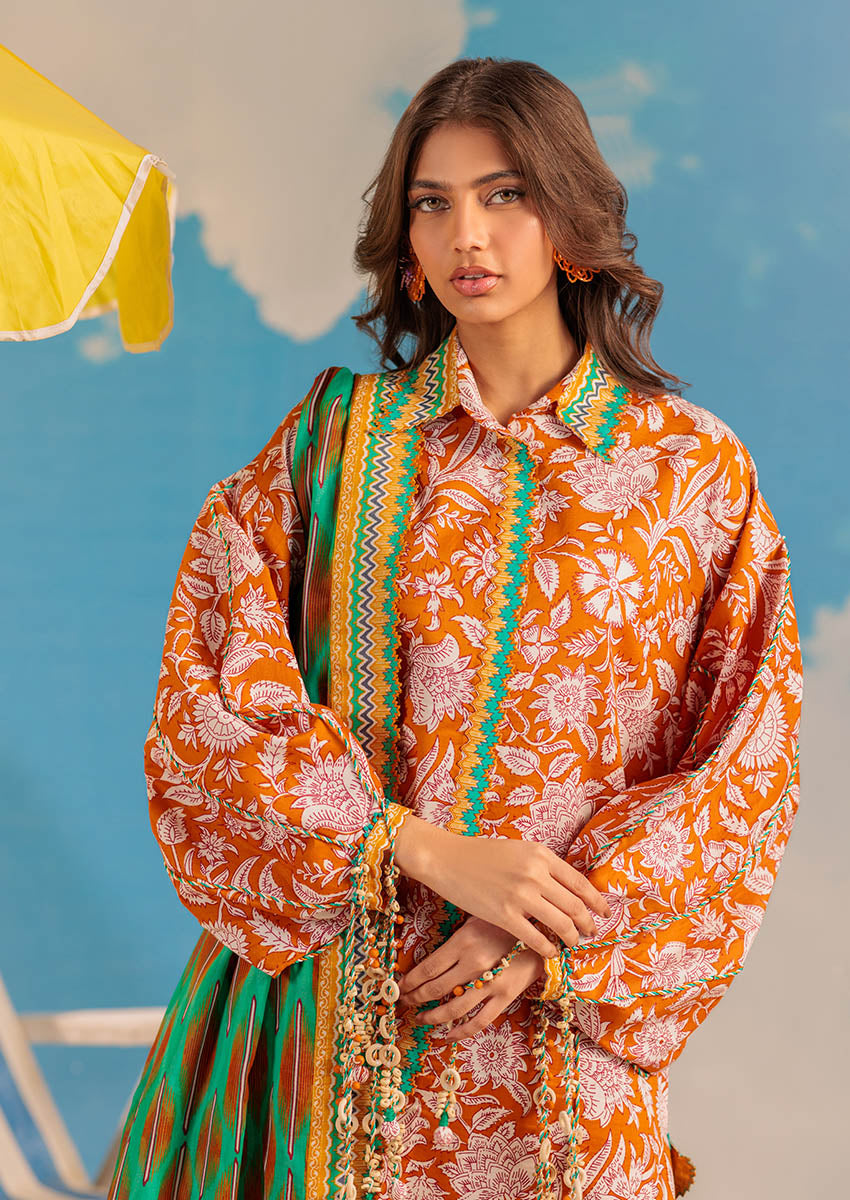 Summary: Introducing the Bonanza Satrangi Tropical Horizons Lawn suit in a captivating orange hue, perfect for adding a touch of summer to your wardrobe. This unstitched three-piece suit features a breezy rotary printed lawn shirt in a refreshing orange color, adorned with delicate floral patterns. The lightweight and breathable lawn fabric ensures comfort even on the warmest days, making it ideal for daily wear during the spring/summer season. Accompanying the shirt is a matching rotary printed lawn dupatta, measuring 2.5 meters, and dyed cambric trousers measuring 1.8 meters, providing ample fabric for customized tailoring to your preference. This versatile suit offers a canvas for your creativity, allowing you to style it in various ways for a casual daytime look or a more dressed-up evening ensemble. Experience the perfect blend of style and comfort with this authentic Bonanza Satrangi creation. Please note, this product is unstitched, empowering you to bring your unique vision to life.