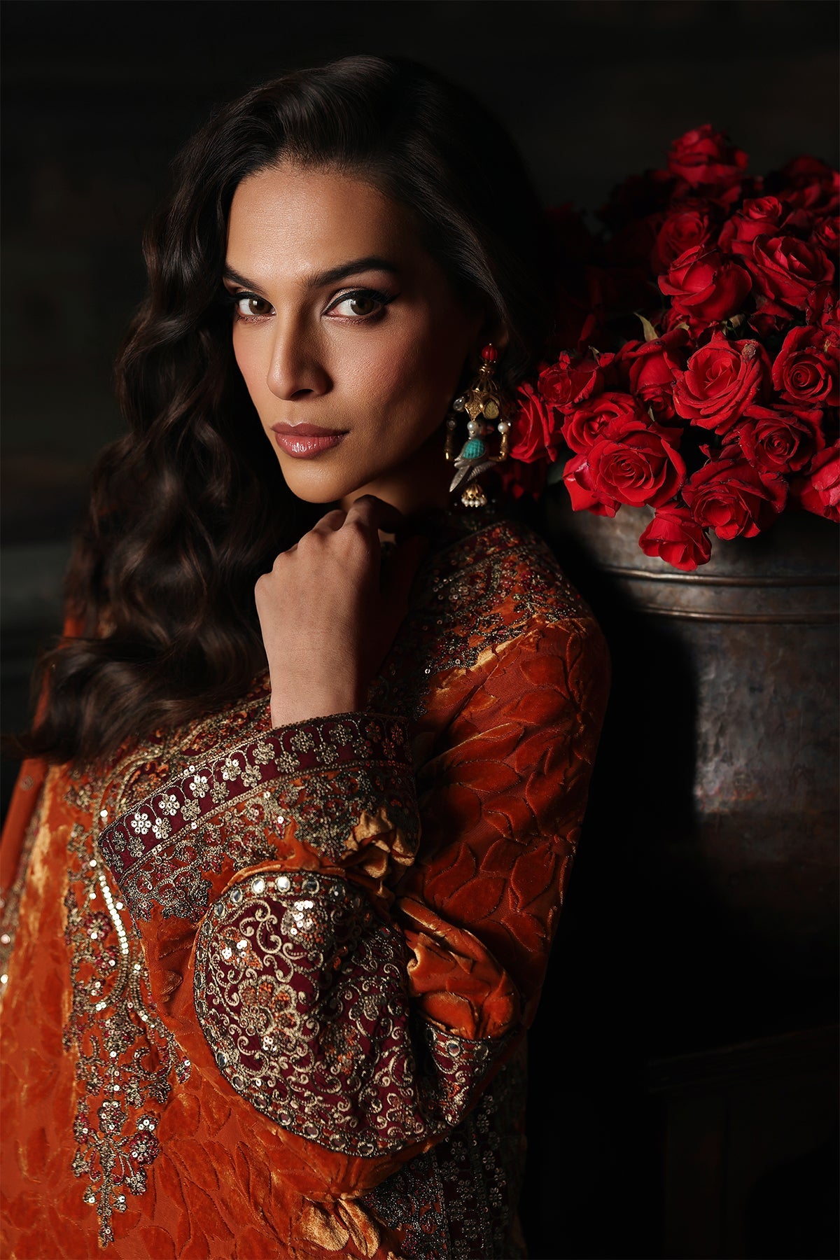 Summary: Embrace regal elegance with this stunning orange Pakistani suit from the Charizma Signora collection. Crafted from sumptuous Palachi velvet, this unstitched formal wear is a quintessential Fall/Winter masterpiece. The shirt is a canvas of intricate embroidery, with detailed work adorning the neckline, sleeves, and borders, exuding opulence. This ethnic wear, with its rich fabric and sophisticated design, is perfect for grand celebrations. The plush velvet offers both warmth and a majestic drape, making it an impeccable choice for a winter wedding or any high-end festive occasion. This is a must-have for your formal wardrobe.