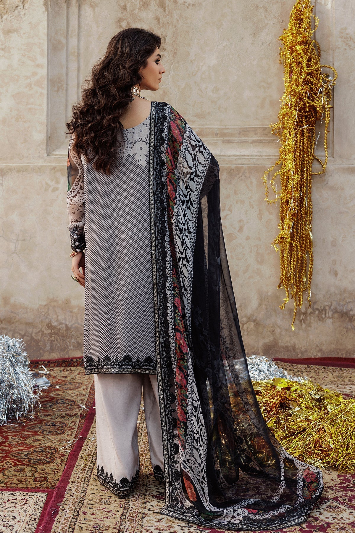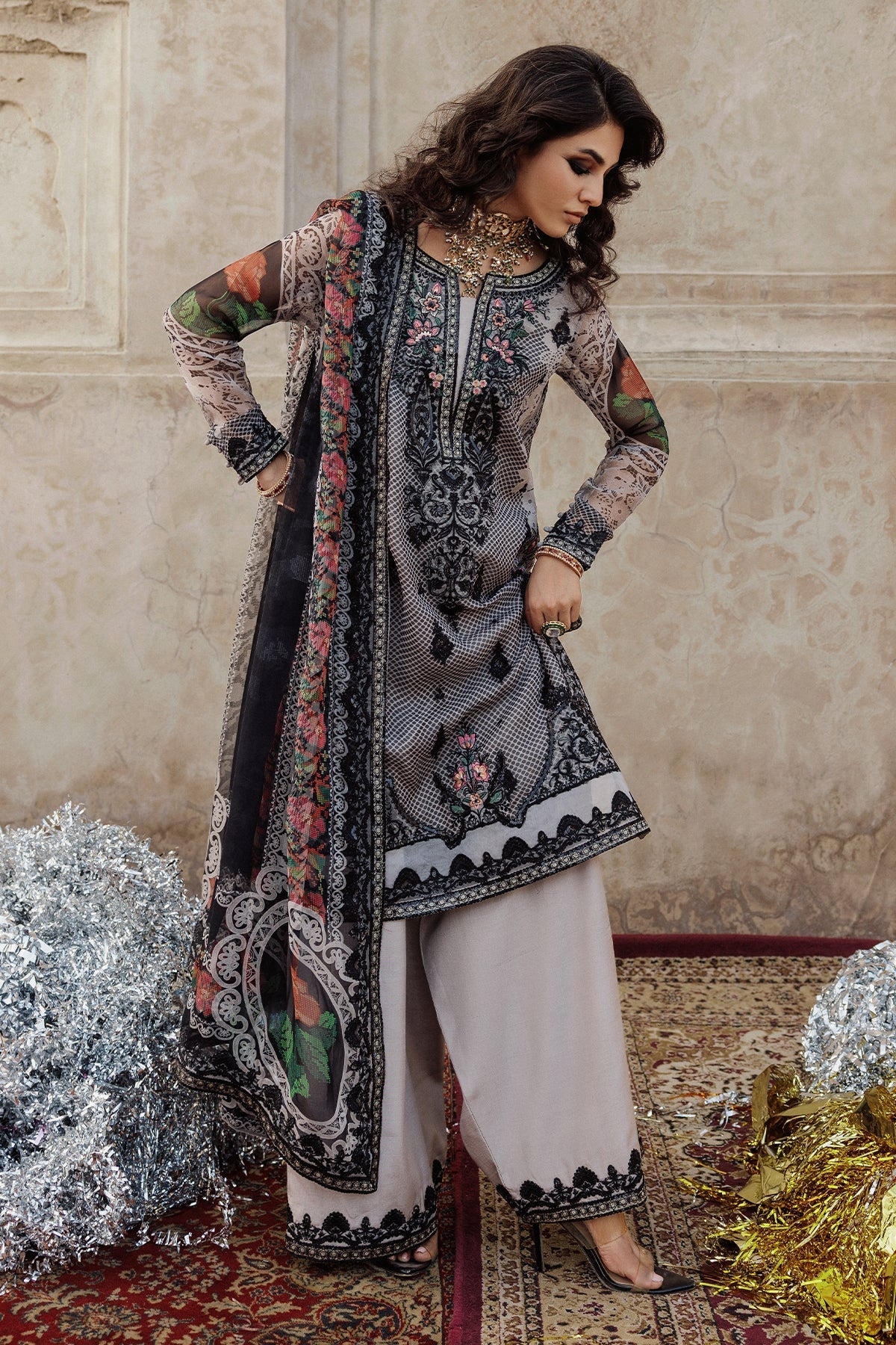Summary: Discover sophistication with this Charizma Vasal Luxury Formal Pakistani suit. The kameez, in a refined shade of grey, is crafted from lightweight printed chiffon, making it an ideal choice for Spring/Summer events. This elegant dress features exquisite black embroidery detailing on the neckline and borders, adding a touch of classic charm. The overall design exudes grace, positioning this outfit as a prime example of high-end ethnic wear. Perfect for formal gatherings, wedding functions, or festive parties, this Pakistani dress is a statement of understated luxury and style.