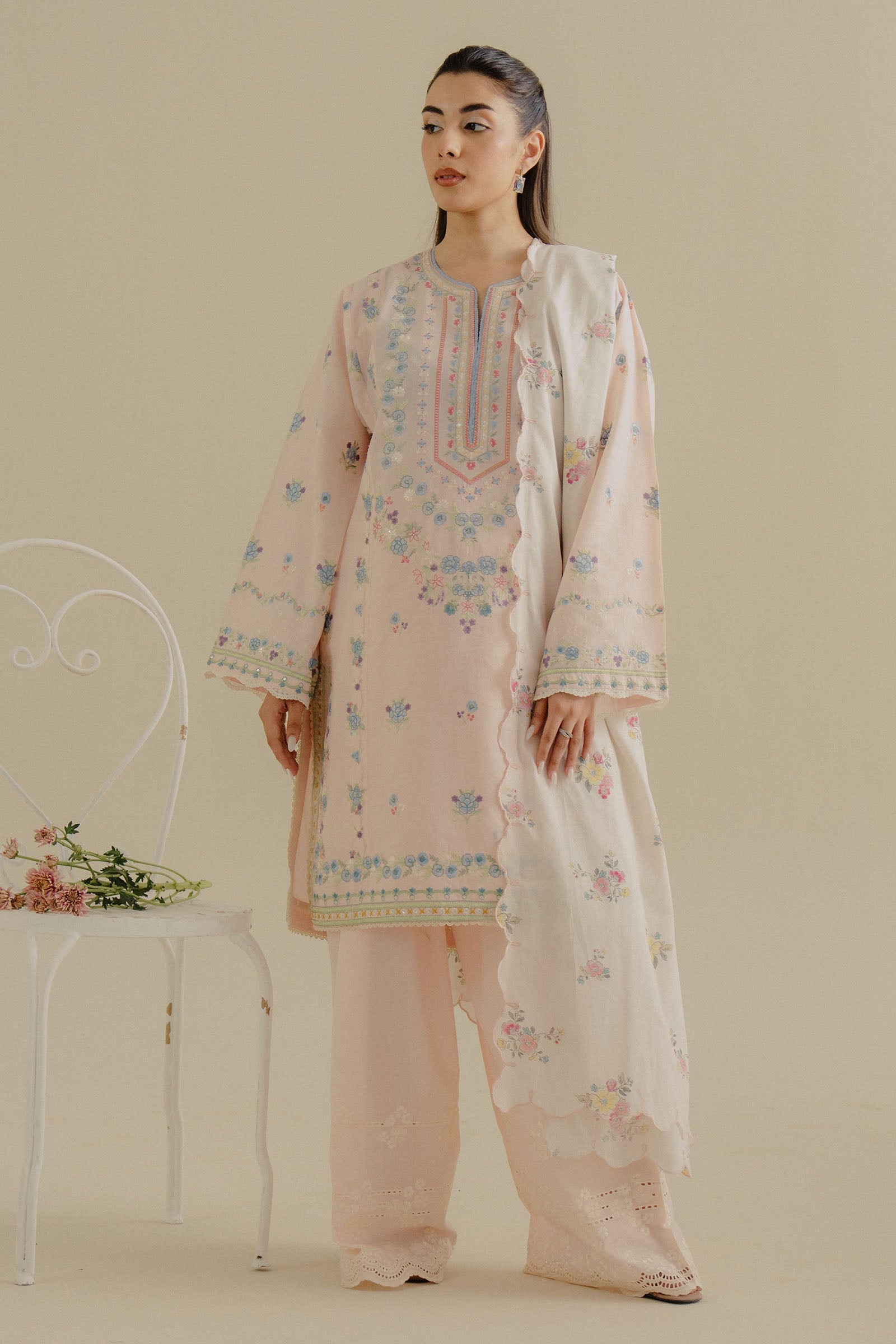 Fabric: The peachy pink jacquard, paired with a jacquard dupatta and composed embroidery, creates a soft yet sophisticated look with intricate detailing. Embroidered Jacquard Front Center Panel 1 Pc Embroidered Jacquard Front Right Side Panel 1 Pc Embroidered Jacquard Front Left Side Panel 1 Pc Embroidered Organza Left Right Chaak 2 Pcs Embroidered Jacquard Sleeves 0.66 Mtr Dyed Jacquard Back 1 Mtr Embroidered Organza Shirt Border-1 1 Mtr Embroidered Organza Shirt Border-2 2.33 Mtrs Embroidered Cambric Trouser 2 Mtrs Digital Printed Self-Jacquard Dupatta 2.5 Mtrs |