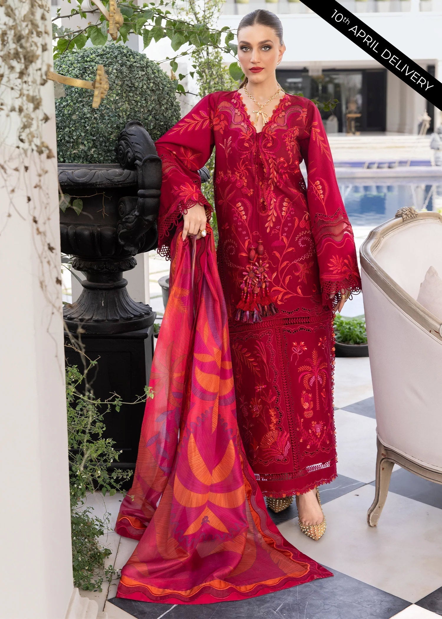 Fabric: Color: Petal Red One hand-printed center panel with marori work Two hand-printed side panels with marori work and organza appliques Front and back embroidered necklines 0.8 meters hand-printed lawn for back 0.56 meters hand-printed lawn for sleeves 1.1 meters embroidered border for sleeves 2 meters hand-printed fabric for trousers (large width) 8 meters embroidered border for dupatta 8 meters printed silk border for dupatta 2.3 meters solid dyed woven net for dupatta Lace Embroidered Center Front Panel. Pair of Lace Embroidered Left & Right Side Panels For Front. Pair of Lace Embroidered Sleeves. Lace Embroidered Back Motif. 0.84m Solid Dyed Fabric For Back. Embroidered Front And Back Daman On Organza. 2.5M Printed Silk Dupatta. 2.5M Solid Dyed Cambric Fabric For Trouser. |