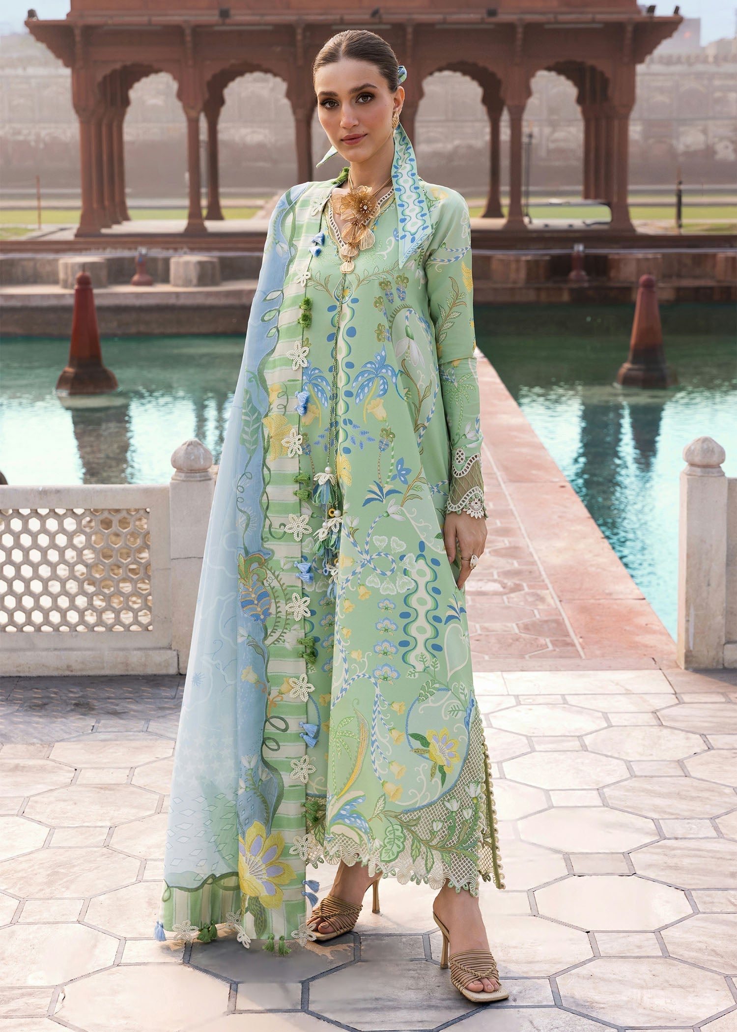 Fabric: Color: Apple Green One hand-printed center panel with marori work Two hand-printed side panels with marori work and organza appliques Front and back embroidered necklines 0.8 meters hand-printed lawn for back 0.56 meters hand-printed lawn for sleeves 1.1 meters embroidered border for sleeves 2 meters hand-printed fabric for trousers (large width) 8 meters embroidered border for dupatta 8 meters printed silk border for dupatta 2.3 meters solid dyed woven net for dupatta Embroidered Heart Neckline On Organza. Embroidered Daman On Organza For Front. 1.10m Embroidered Patti On Organza For Sleeves. Pair Of Embroidered Motifs On Organza For Trouser. 2.45m Printed Cambric For Trouser. 2.25m Printed Silk Dupatta. |