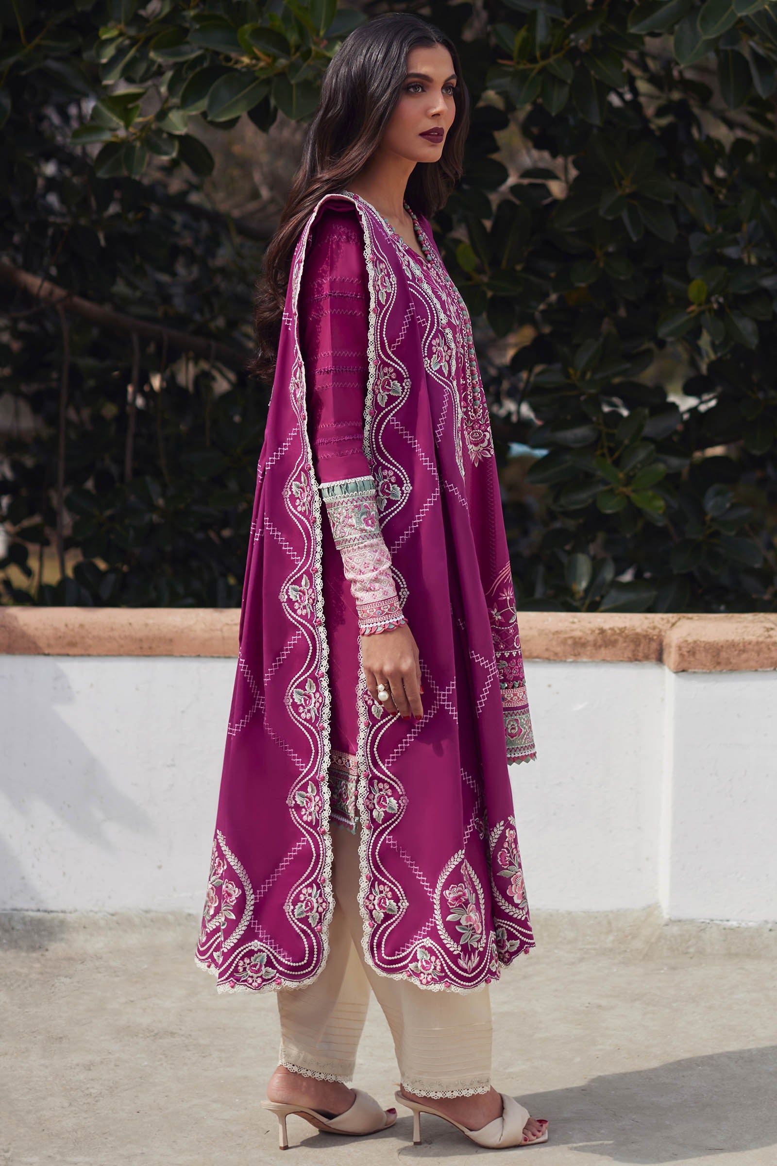 Fabric: Aira' dazzles with a deep cerise pink canvas adorned by delicate embroidered blooms in luminous hues of ivory, sage, mint, watermelon, and subtle touches of white. Its lush oriental tapestry frames the shirt with intricate flora, fauna, and exotic birds, instantly drawing attention and sparking fascination. The ensemble is completed with a stunning dupatta featuring artistically embroidered pallus and detailed frames on all sides. This luxurious design is the epitome of elegance, perfect for making a grand entrance during the festive season. With its opulent textures, vibrant colors, and intricate details, 'Aira' promises to captivate and leave a lasting impression. AIRA (EL24-10 A) - 3 Pc - Unstitched Embroidered Front Center Panel (Elan) 1 Piece Embroidered Front Left Side Panel (Elan) 1 Piece Embroidered Front Right Side Panel (Elan) 1 Piece Dyed Back (Elan) 1 Piece Embroidered Sleeves Left + Right (Elan) 1 Pair Embroidered Sleeves Border (Satin) 1 Meter Embroidered Front + Back Hem Border (Satin) 2 Meters Embroidered Hem + Chak Patti (Satin) 3 Meters Embroidered Duppata Centre (Voile) 2 Meters Embroidered Duppata Left+Right Pallu (Voile) 1 Pair Dyed Trouser (Cambric) 2 Meters Fabric details: Elan, Satin, Organza, Voile, Cambric |