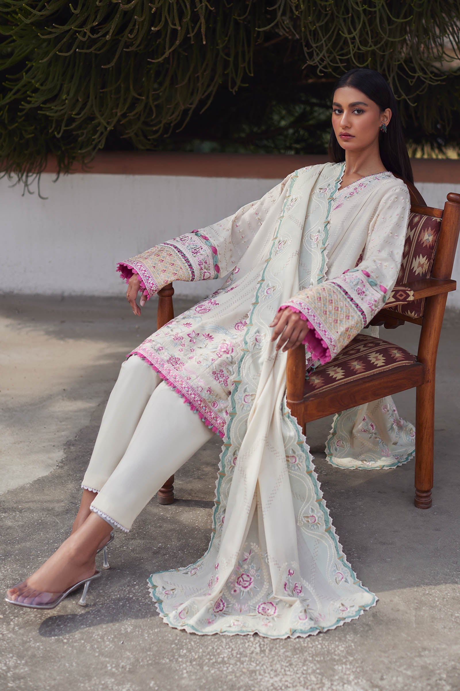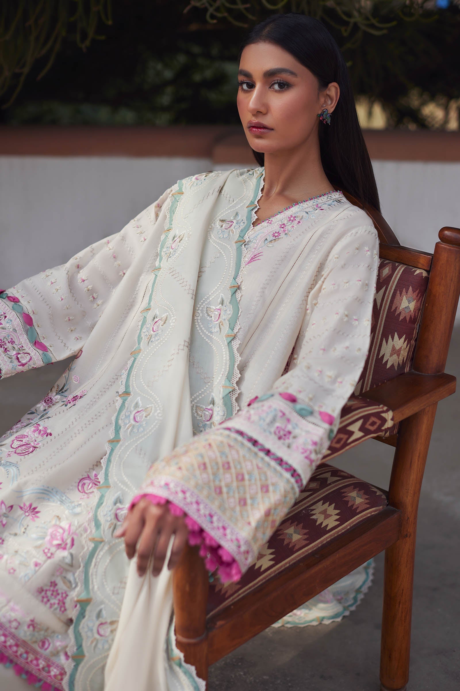 Fabric: Introducing ‘Aira’ in a celestial cream color canvas, adorned with breathtaking embroidery in shades of pink, aqua, and sage. The delicate blooms and intricate patterns create a captivating tapestry, exuding elegance and sophistication. The celestial cream backdrop provides a serene contrast, allowing the embroidery to shine with its subtle yet mesmerizing hues. Paired with a matching dupatta featuring detailed embroidery, this ensemble is perfect for those seeking understated beauty with a touch of celestial charm. ‘Aira’ in cream promises to enchant and leave a lasting impression with its ethereal beauty and timeless elegance. AIRA (EL24-10 B) - 3 Pc - Unstitched Embroidered Front Center Panel (Elan) 1 Piece Embroidered Front Left Side Panel (Elan) 1 Piece Embroidered Front Right Side Panel (Elan) 1 Piece Dyed Back (Elan) 1 Piece Embroidered Sleeves Left + Right (Elan) 1 Pair Embroidered Sleeves Border (Satin) 1 Meter Embroidered Front + Back Hem Border (Satin) 2 Meters Embroidered Hem + Chak Patti (Satin) 3 Meters Embroidered Duppata Centre (Voile) 2 Meters Embroidered Duppata Left+Right Pallu (Voile) 1 Pair Dyed Trouser (Cambric) 2 Meters Fabric details: Elan, Satin, Organza, Voile, Cambric |