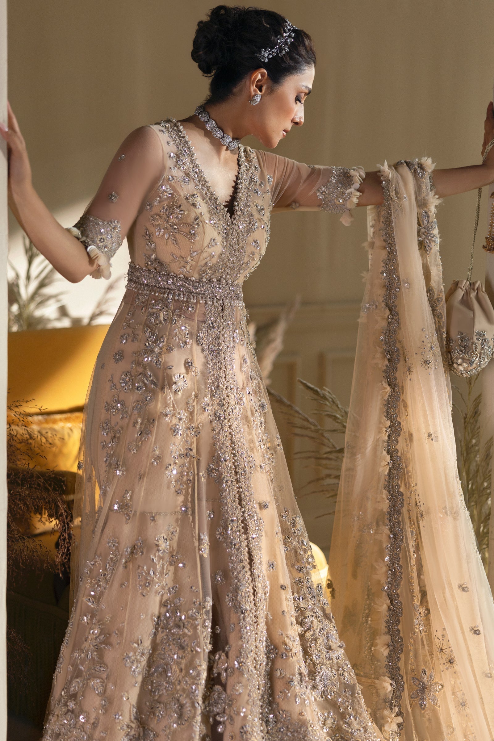Fabric: Élan's 'Pearl of Tranquility' – an exquisite masterpiece that unfolds like a serene dream. The pearlescent white hues evoke the purity of moonlight on still waters, casting an enchanting glow. Hand-embellished with delicate seed pearls, radiant Swarovski crystals, and lustrous tinsel, each detail harmonizes to create an aura of luxury. The silhouette cascades gracefully, mirroring the gentle rhythm of serene tides, while an exquisite floral filigree stole drapes elegantly over the shoulders, reminiscent of ethereal petals floating on a calm sea. ‘Pearl of Tranquility’ beautifully marries romance and refinement, capturing the essence of haute couture from Élan's wedding festive collection. Transforming the wearer into a vision of elegance, this enchanting ensemble elevates every celebration into a luxurious experience—an extraordinary journey through a realm where dreams take flight and love reigns supreme. Embellished & Embroidered Front Body Left & Right (Poly Net) 1 Pair Embroidered Back Body Left & Right (Poly Net) 1 Piece Embellished & Embroidered Front Left Panel 1 (Poly Net) 1 Piece Embellished & Embroidered Front Left Panel 2 (Poly Net) 1 Piece Embellished & Embroidered Front Left Panel 3 (Poly Net) 1 Piece Embellished & Embroidered Front Left Panel 4 (Poly Net) 1 Piece Embellished & Embroidered Front Right Panel 1 (Poly Net) 1 Piece Embellished & Embroidered Front Right Panel 2 (Poly Net) 1 Piece Embellished & Embroidered Front Right Panel 3 (Poly Net) 1 Piece Embellished & Embroidered Front Right Panel 4 (Poly Net) 1 Piece Embroidered Back (Poly Net) 2.3 Meters Embellished & Embroidered Sleeves (Poly Net) 1 Pair Embroidered Dupatta Running (Poly Net) 2.3 Meters Embroidered Dupatta Left Pallu (Poly Net) 1 Piece Embroidered Dupatta Right Pallu (Poly Net) 1 Piece Embroidered Trouser Border (Poly Organza) 1.3 Meters Dyed Slip (Raw Silk) 1.5 Meters Dyed Trouser (Raw Silk) 2 Meters Fabric details: Poly Net | Raw Silk This is an unstitched article Disclaimer: Please note that the color of the item you receive may vary slightly from that shown in the product shoot. This can happen due to the variation in light at the time of product and fashion shoot. This is a concept stitched article and may not contain certain embellishments. |