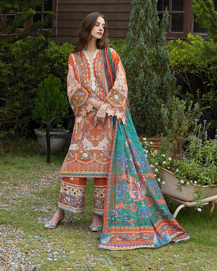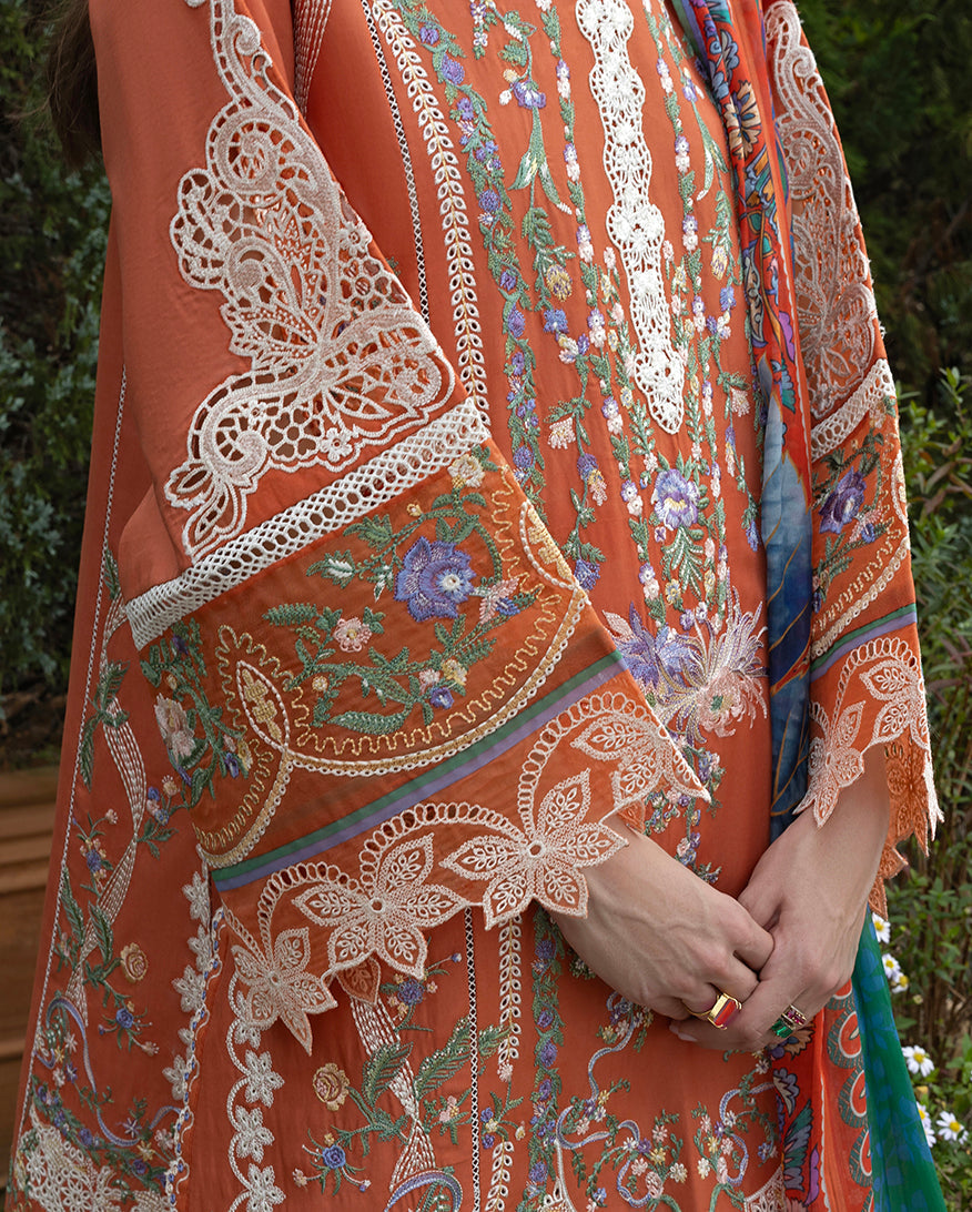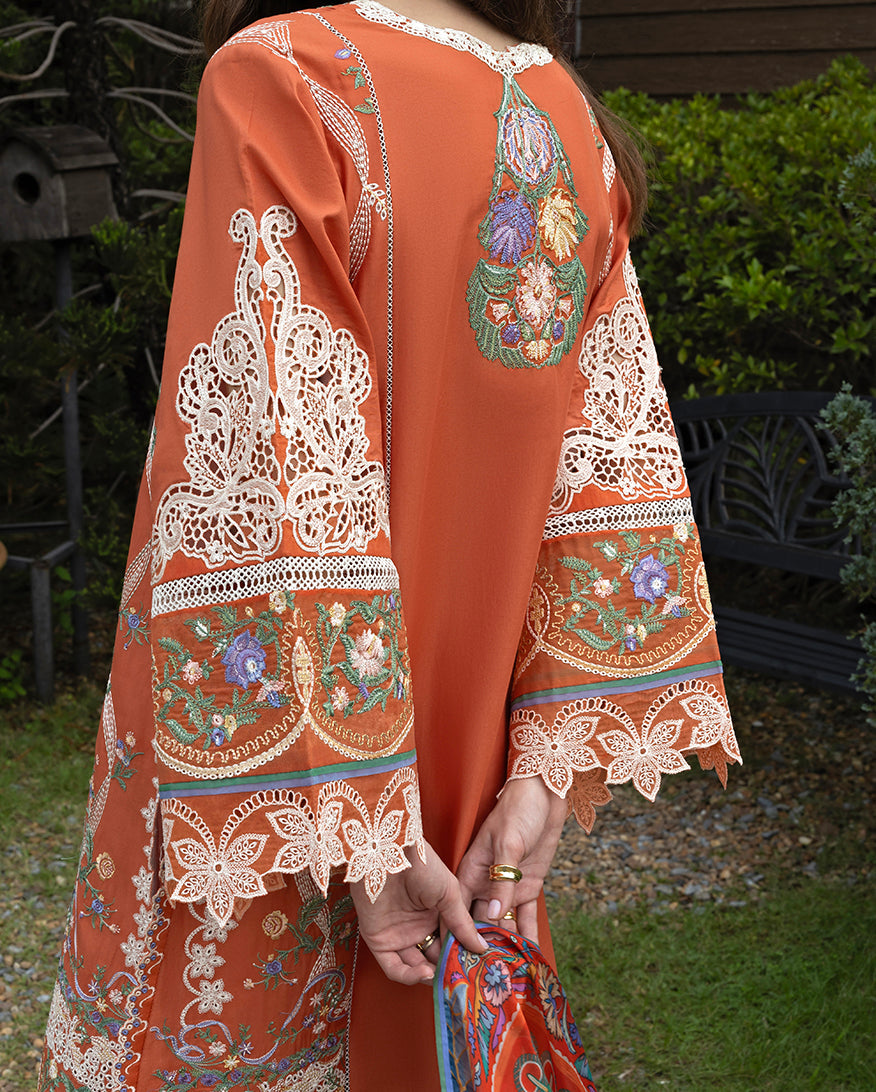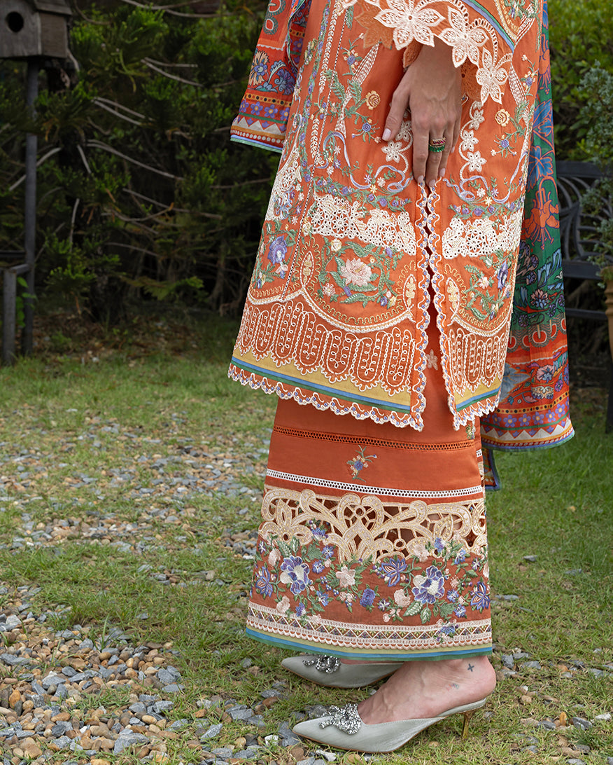 Summary: Step into sophistication with 'Vita' from the Esmel Mon Tresor Luxe Lawn collection, a beautiful orange Pakistani suit. This ensemble is meticulously crafted from premium lawn, a lightweight and breathable fabric making it an ideal choice for Spring/Summer wear. The kameez is a masterpiece of design, adorned with elaborate Chikan embroidery on the front, back, and side panels. Ornate organza borders on the daman and sleeves, along with embroidered necklines, elevate this ethnic wear to a formal statement piece. This elegant Pakistani lawn dress is perfect for Eid, weddings, or any upscale festive occasion.