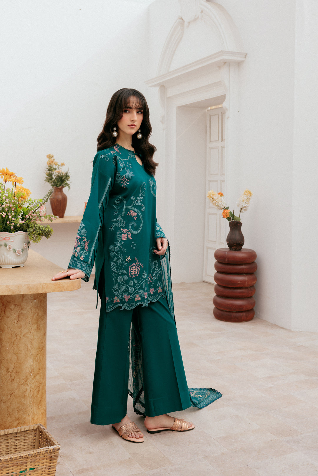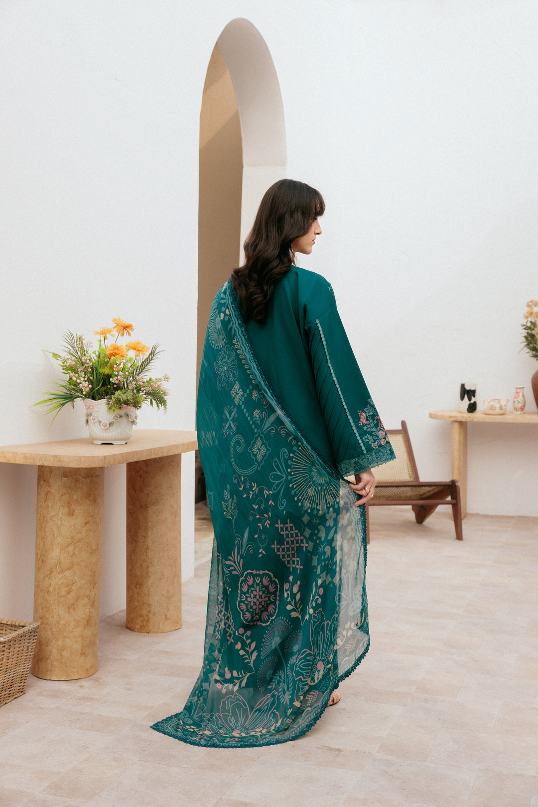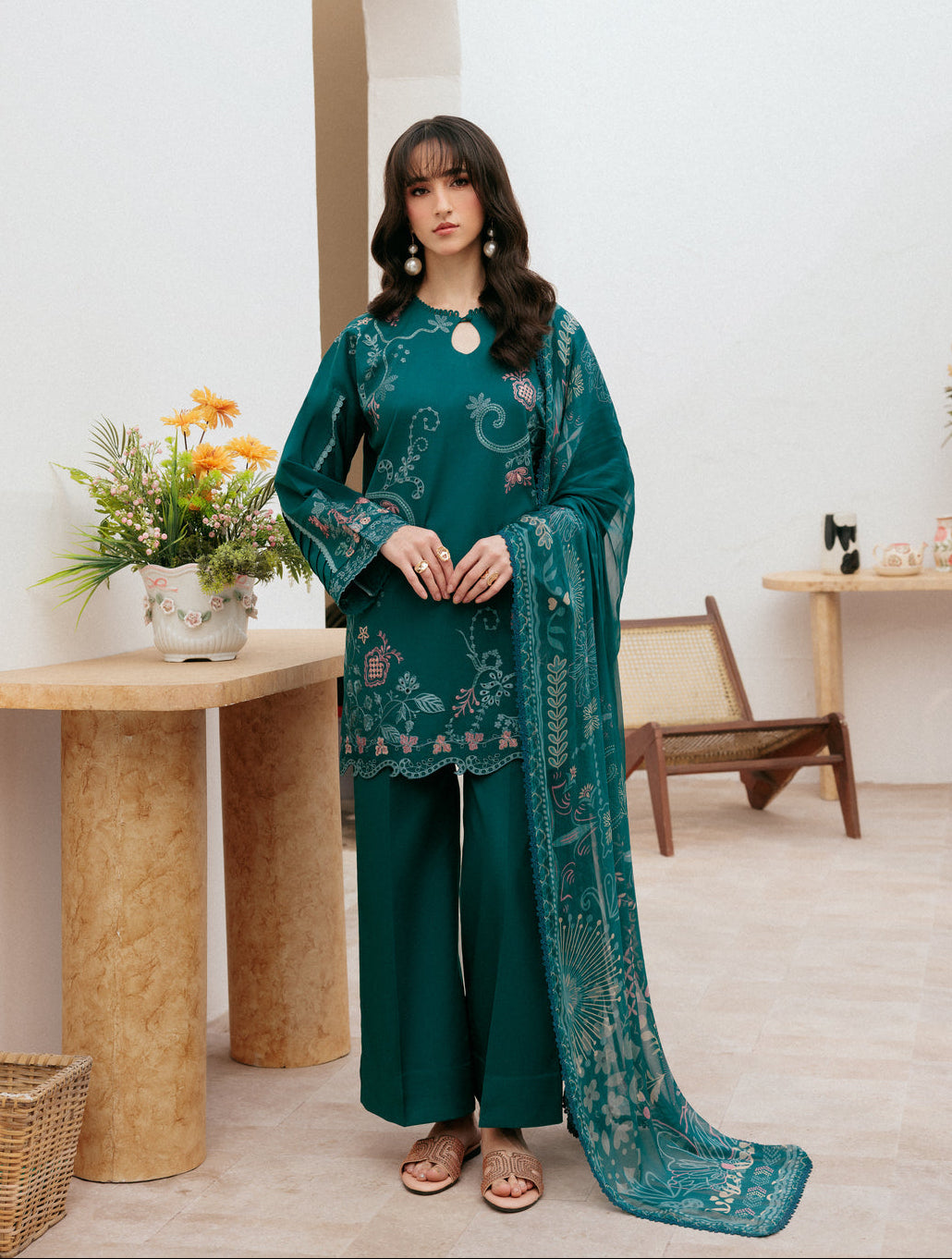 Summary: Embrace sophisticated style with this stunning teal Pakistani suit from Florent's Summer Lawn collection. The kameez, crafted from lightweight lawn, is perfect for warmer seasons. It features intricate embroidery across the front and sleeves, complemented by delicate borders for the hem and cuffs. This beautiful ethnic wear, in its rich teal shade, offers a graceful silhouette for any festive occasion. As a versatile Pakistani Lawn Dress, it's an ideal choice for Eid gatherings, formal dinners, or elegant party wear, ensuring you look effortlessly chic.