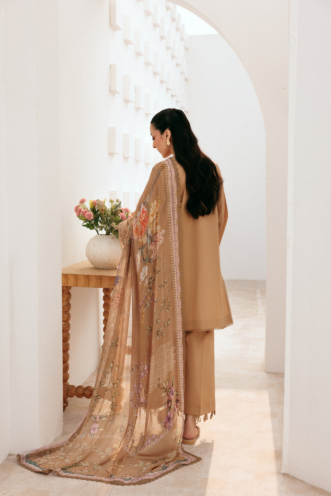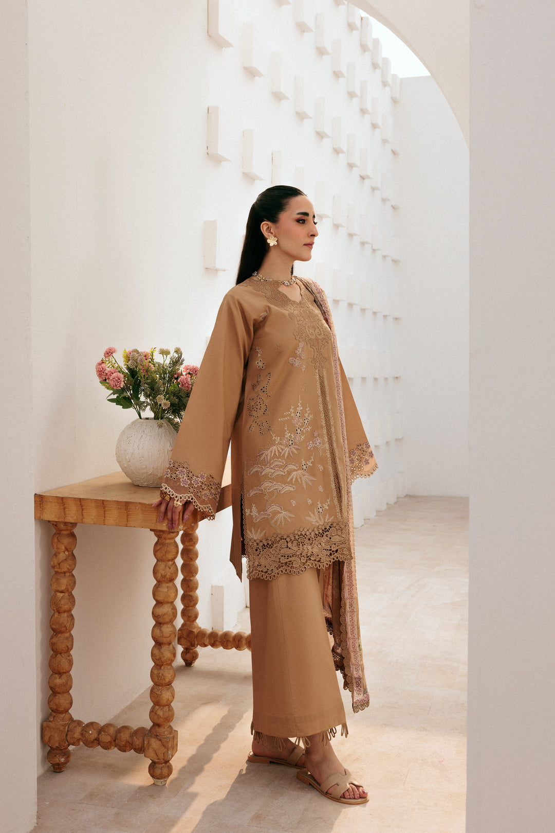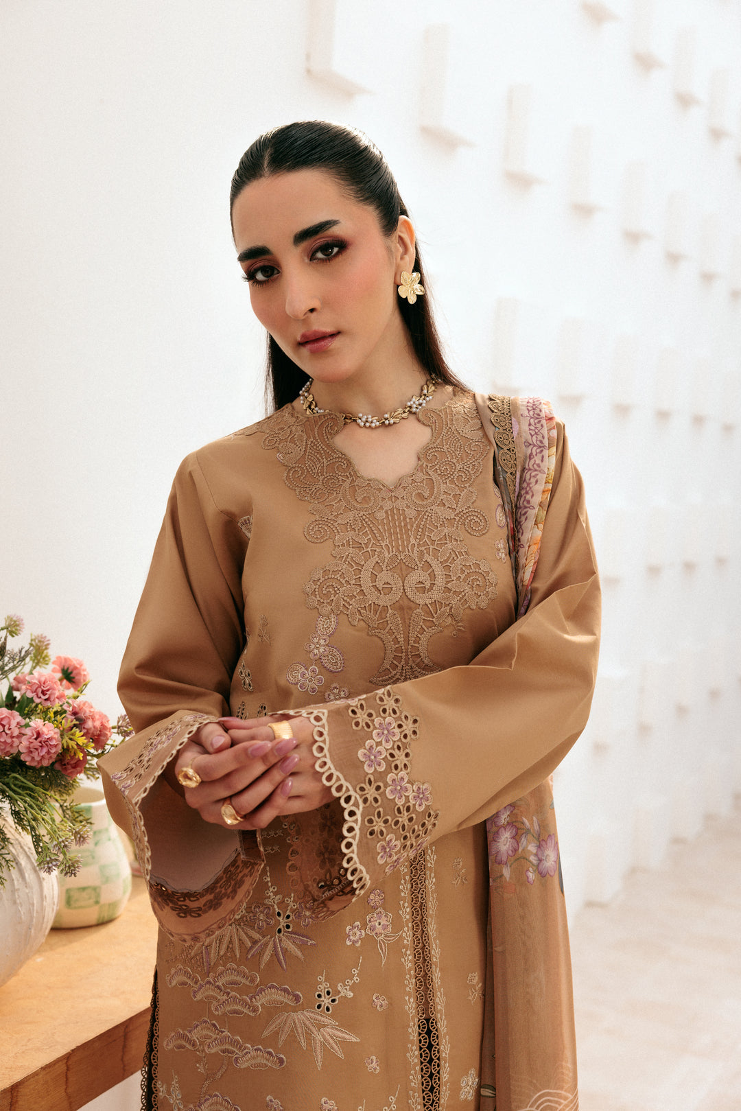 Summary: Embrace timeless elegance with this exquisite beige Pakistani suit from the Florent Summer Lawn collection. The shirt, crafted from premium quality lawn, promises breathability and comfort, making it a perfect summer outfit. It features intricate embroidery on the front, sleeves, and hemline, adding a touch of sophisticated grace. This unstitched ethnic wear allows for custom tailoring to achieve a flawless fit. Paired with a digital printed Bamber Chiffon dupatta, this formal wear ensemble is a stunning choice for Eid, festive parties, or daytime events, offering a blend of tradition and modern style.