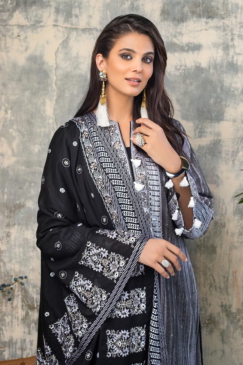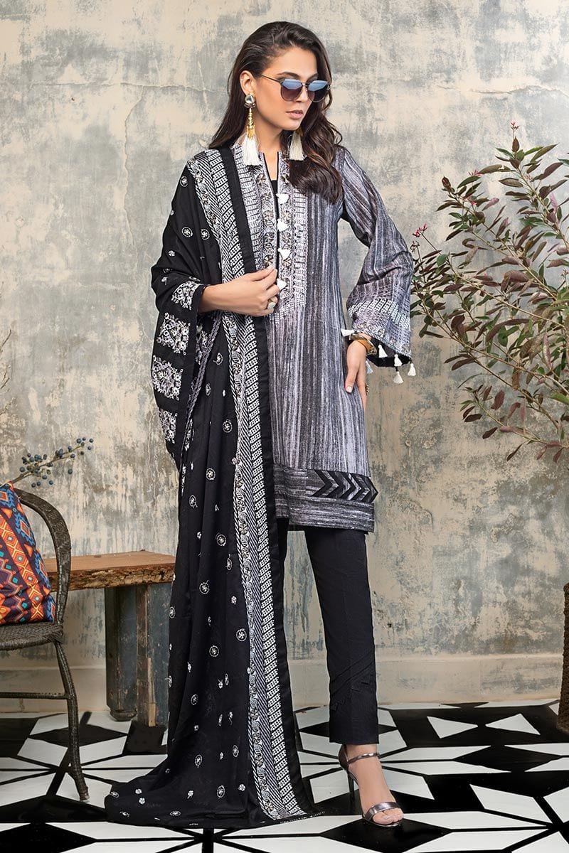Fabric: Embroidered Denting Lawn Dupatta – 2.5 meters Embroidered Printed Khaddar Front & Sleeves with Printed Khaddar Back – 1.75 meters Dyed Khaddar Trouser – 1.75 meters |