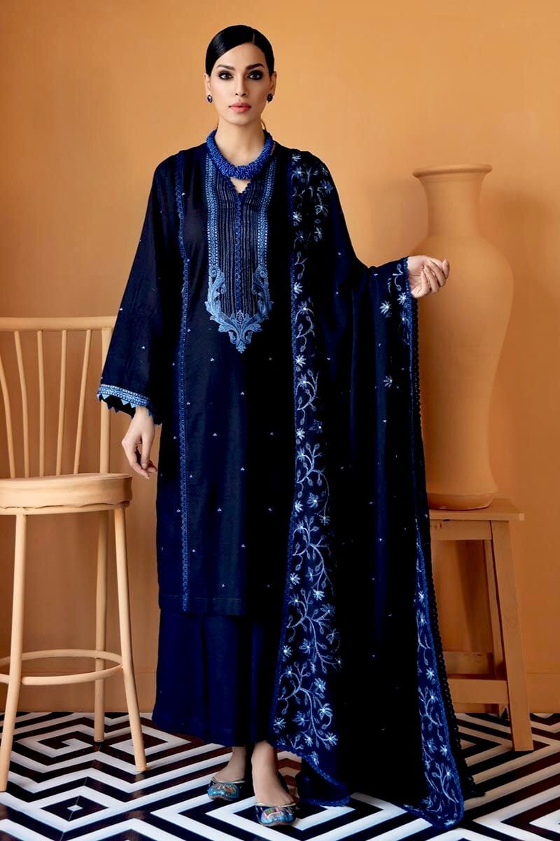 Fabric: Embroidered Dyed Karandi Dupatta with GPO Lace – 2.5 meters Embroidered Dyed Karandi Shirt with GPO Lace – 2.41 meters Dyed Twill Linen Trouser – 1.75 meters  |