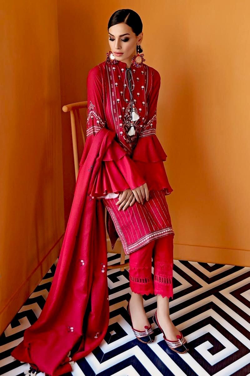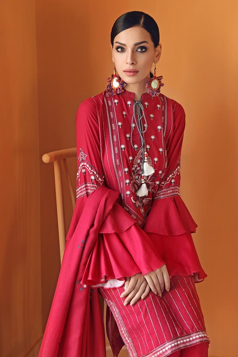 Fabric: Embroidered Dyed Karandi Dupatta with GPO Lace – 2.5 meters Embroidered Dyed Karandi Shirt with Embroidered Border for Front & Back – 2.76 meters Dyed Twill Linen Trouser – 1.75 meters |