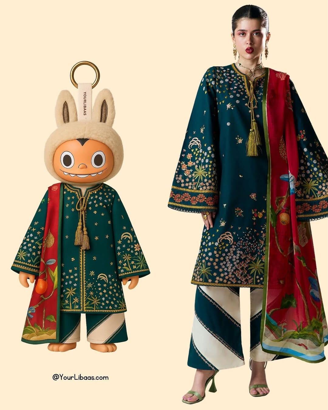 Fabric: Color: Teal Fabric: Cotton shirt & trouser, Silk Dupatta Package Includes: 3pcs Shirt, Trouser & Dupatta Description: This striking ensemble blends earthy richness with bold artistry. The deep teal shirt is delicately embroidered with multicolor floral motifs that bloom across the fabric like a painted garden. From soft pastels to warm oranges and golds, the embroidery clusters around the hem and sleeves, creating a graceful, cascading effect. The neckline is accentuated with traditional tassel ties, adding a touch of classic charm to the modern silhouette. The matching teal culottes carry forward the embroidered detailing. Beige trims at the hem provide a soft contrast, breaking up the deep tones and adding dimension. Completing the look is a digitally printed silk dupatta, dramatic in its use of vibrant reds and lush greens, with painterly strokes and botanical elements that flow with every movement. Together, the pieces create a look that feels grounded in tradition but boldly expressive—perfect for statement moments with effortless elegance. Fabric Details in Meters: (Unstitched): Digital Printed Dupatta (Silk) 2.50 Meters Embroidered Front Center Panel (Cotton) 1.00 Piece Embroidered Front Right Panel (Cotton) 1.00 Piece Embroidered Front Left Panel (Cotton) 1.00 Piece Embroidered Back Spray (Cotton) 0.78 Meters Embroidered Sleeves (Cotton) 0.66 Meters Embroidered Sleeves Border (Cotton) 1.30 Meters Embroidered Allover Border (Cotton) 7.00 Meters Embroidered Trouser Border (Cotton) 7.00 Meters Dyed Trouser Trims (Ivory Cotton) 0.30 Meters Dyed Trouser (Cotton) 2.00 Meters |
