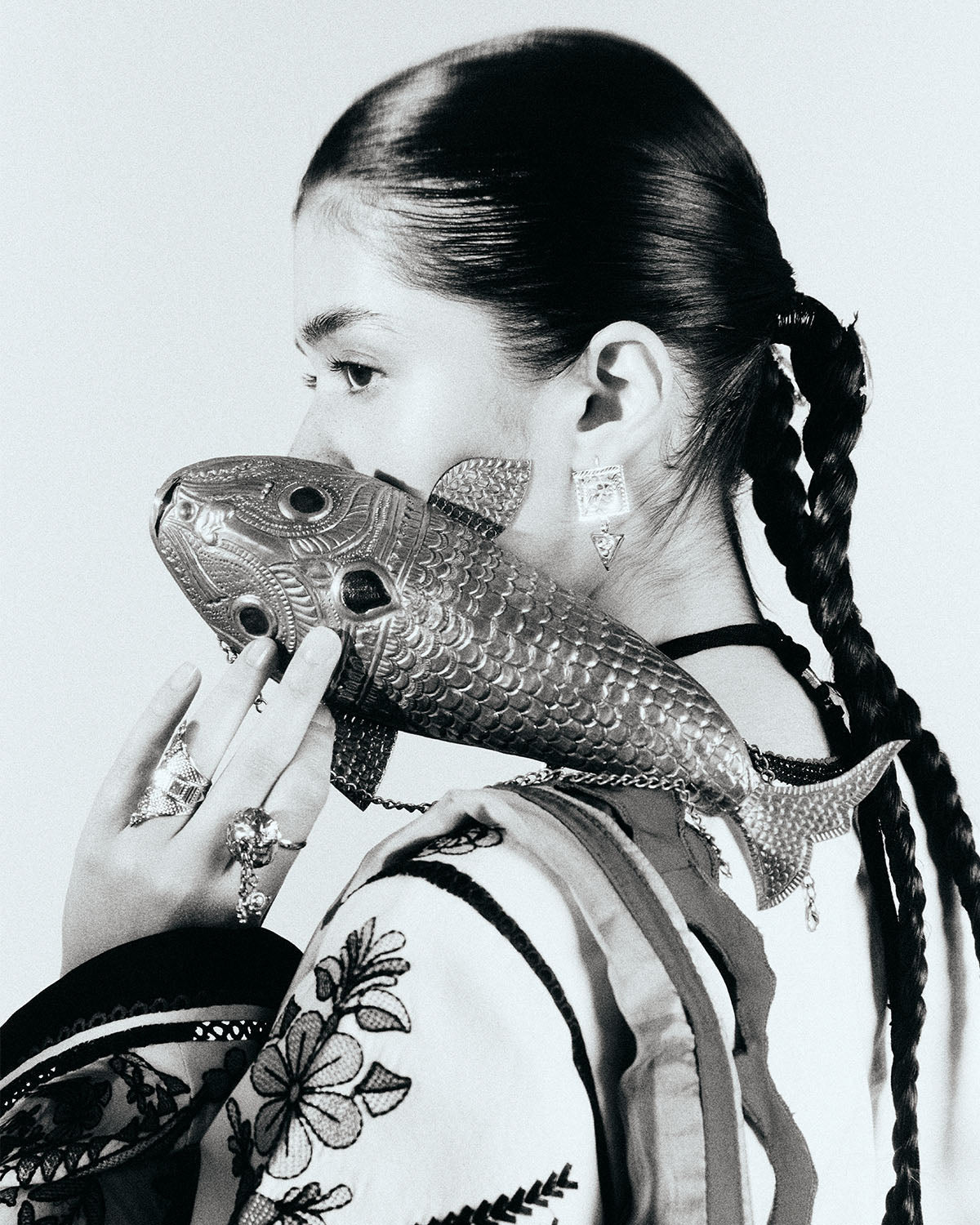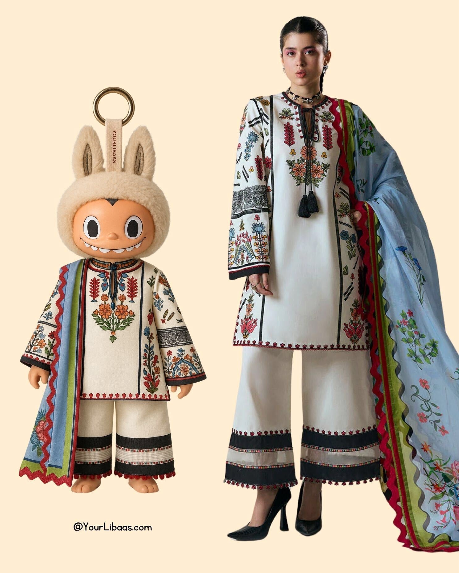 Fabric: Color: White Fabric: Cotton shirt & trouser, Silk Dupatta Package Includes: 3pcs Shirt, Trouser & Dupatta Description: This outfit is a refined take on traditional wear, featuring an ivory shirt with detailed multicolor embroidery that runs along the front, sleeves, and borders. The matching culottes carry the same embroidered patterns, finished with bold black and red bands at the hem for a clean, structured contrast. A digitally printed silk dupatta adds movement and color, with floral motifs and a scalloped border in deep magenta and green tones. The overall look is grounded yet expressive—rooted in craft, with a contemporary edge. Fabric Details in Meters: (Unstitched): Digital Printed Dupatta (Silk) 2.50 Meters Embroidered Front Center Panel (Cotton) 1.00 Piece Embroidered Front Right Panel (Cotton) 1.00 Piece Embroidered Front Left Panel (Cotton) 1.00 Piece Dyed Back (Cotton) 0.78 Meters Embroidered Sleeves Center Panel (Cotton) 2.00 Piece Embroidered Sleeves Side Right Left Panel (Cotton) 4.00 Pieces Embroidered Front Insert + Back Neck Border (Cotton) 3.00 Meters Embroidered Daman+Side Extensions+Trouser Border (Cotton) 6.00 Meters Embroidered Trouser Border (Cotton) 3.00 Meters Dyed Trouser (Cotton) 2.00 Meters Dyed Trouser Trims (Black Cotton) 0.25 Meters |