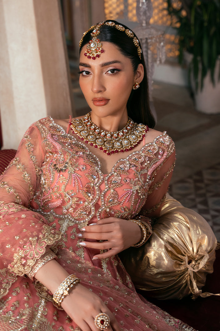 Summary: Embrace regal elegance with the Imrozia Noor-e-Naaz Khushbu, a breathtaking Pakistani bridal suit. The kameez is crafted from delicate peach net, a lightweight fabric perfect for Spring/Summer weddings. This stunning piece features a floor-length, anarkali-style silhouette with intricate handmade embellishments gracing the front yoke and full sleeves. The entire dress is a canvas of exquisite embroidery, making it a masterpiece of ethnic wear. This luxury formal outfit is designed for the modern bride, capturing the essence of Pakistani bridal traditions. Its opulent detailing and graceful flow make it the ultimate choice for a wedding or grand celebration.