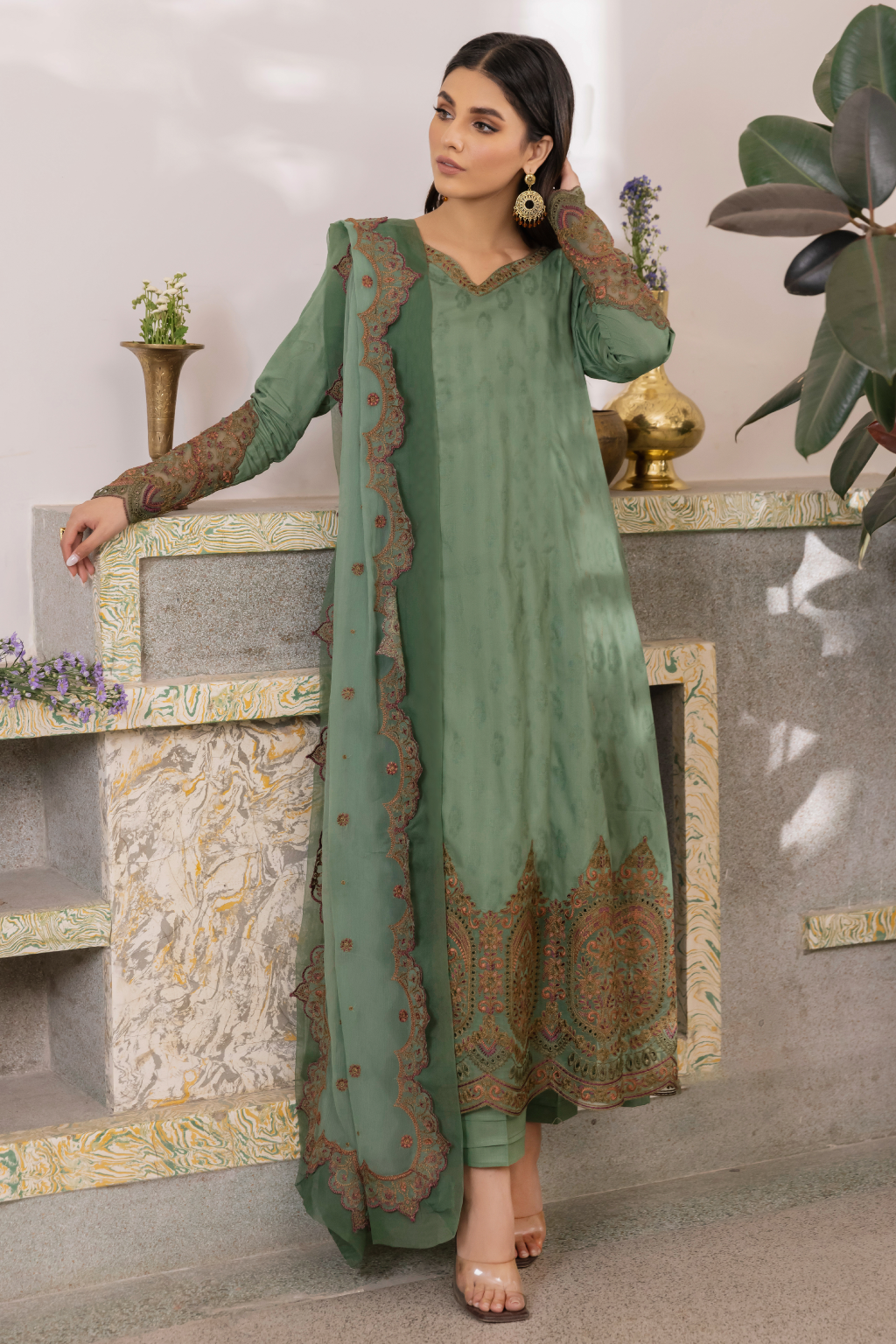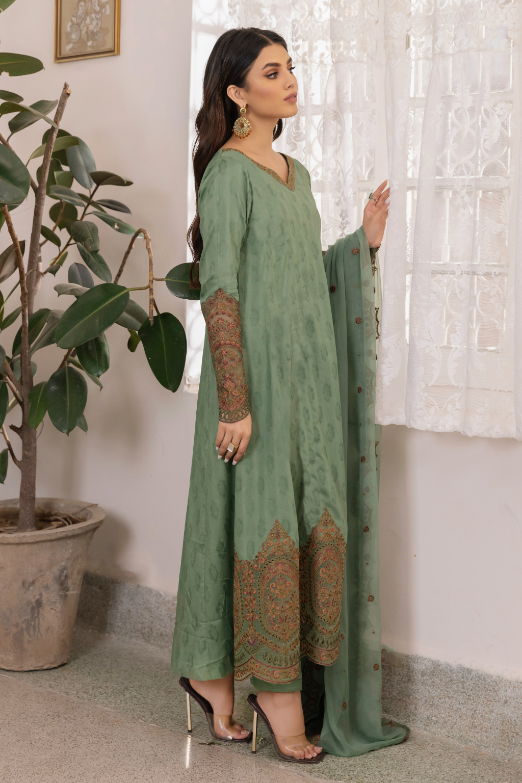 Fabric: Shirt Front, back & Sleeves: Dyed Textured Lawn (length 2.25 M) (Width 1.35 M) Shirt Front Lace: Borer Embroidered Organza (1.20 M) Sleeves Patch: Borer Embroidered Organza (2 Pieces) Dupatta: Embroidered Chiffon (2.5 M) Trouser: Dyed Cambric (2.5 M) |