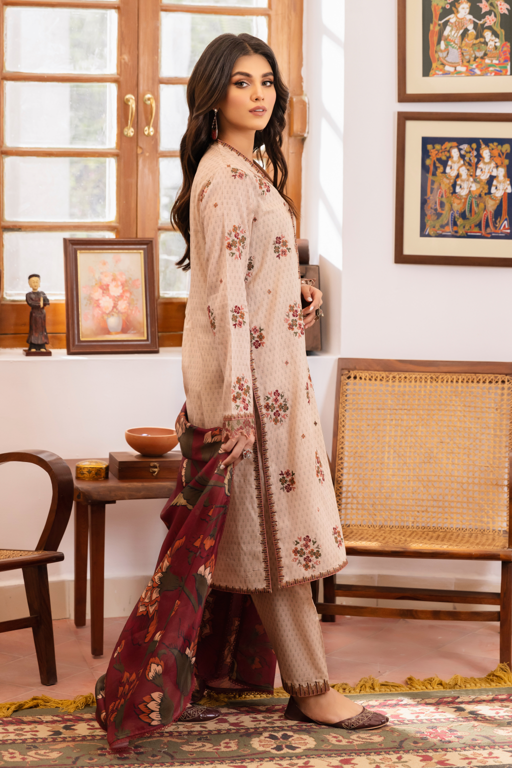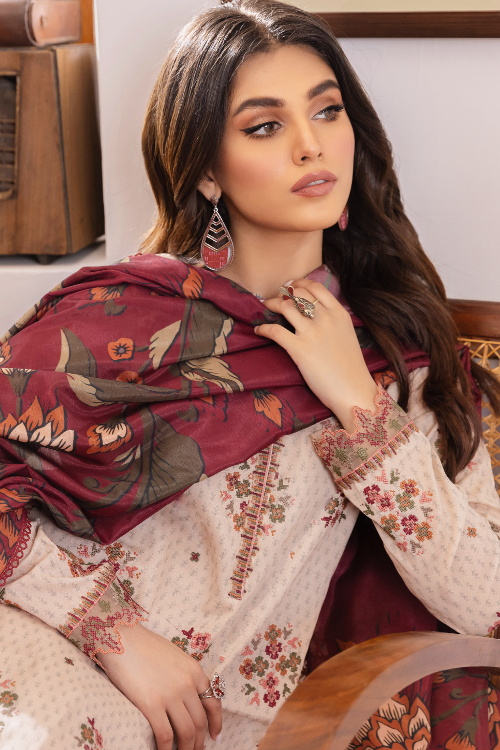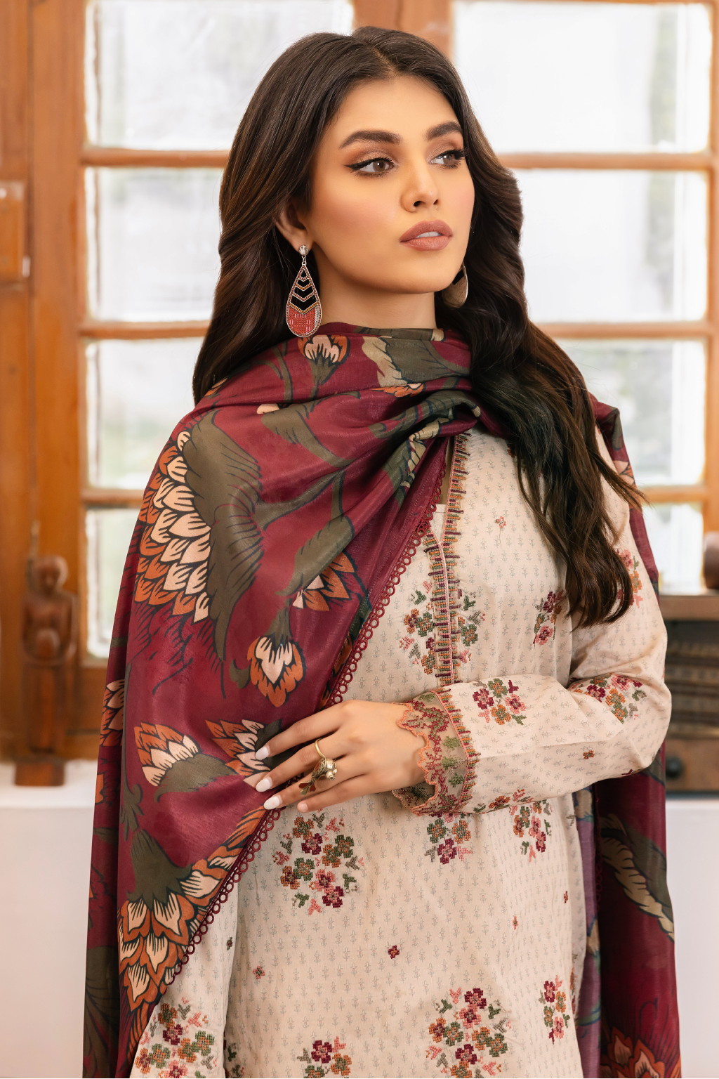 Fabric: Shirt Front: Printed Embroidered Lawn (1.20 M) Shirt Back: Printed Lawn (1.20 M) Front & Back Lace: Embroidered Organza (1.70 M) Chalk Lace: Embroidered Organza (3.80 M) Necklace: Embroidered Organza (1.40 M) Sleeves: Printed Embroidered Lawn (0.65 M) Sleeves Lace: Embroidered Organza (0.95 M) Dupatta: Printed Silk (2.5 M) Trouser: Printed Lawn (2.5 M) Trouser Lace: Embroidered Organza (1.20 M) |